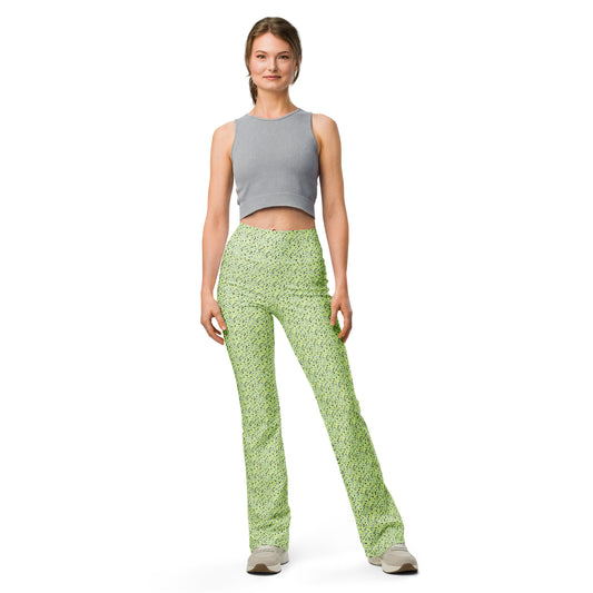 Multi Grid Flare Leggings, Abstract Print Flare Leggings, Green Flare Leggings
