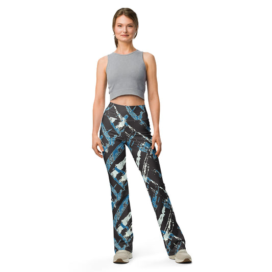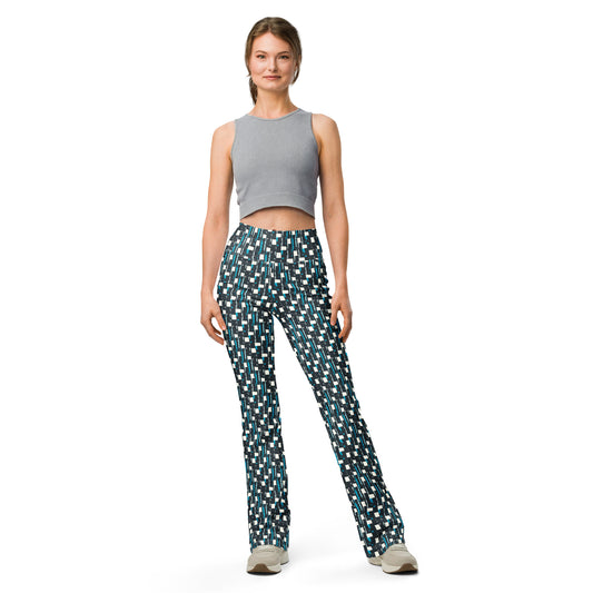 Midwood Grid Flare Leggings, Abstract Print Flare Leggings, Blue Flare Leggings