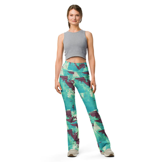 Urban Garden Flare Leggings, Abstract Print Flare Leggings, Teal Flare Leggings