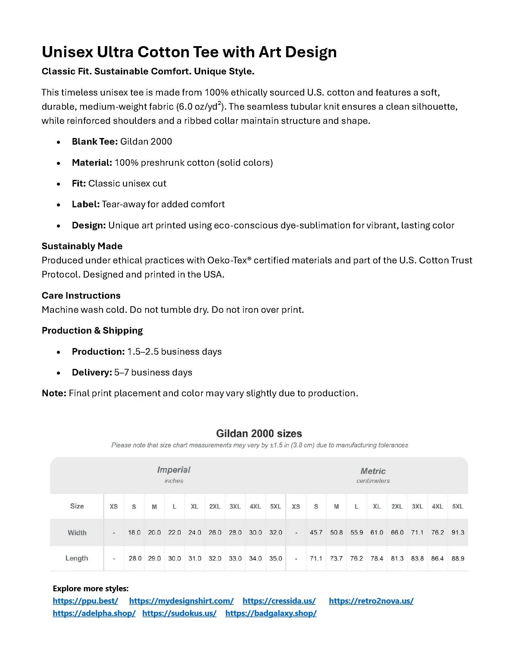 This timeless unisex tee is made from 100% ethically sourced U.S. cotton and features a soft, durable, medium-weight fabric (6.0 oz/yd²). The seamless tubular knit ensures a clean silhouette, while reinforced shoulders and a ribbed collar maintain structure and shape.