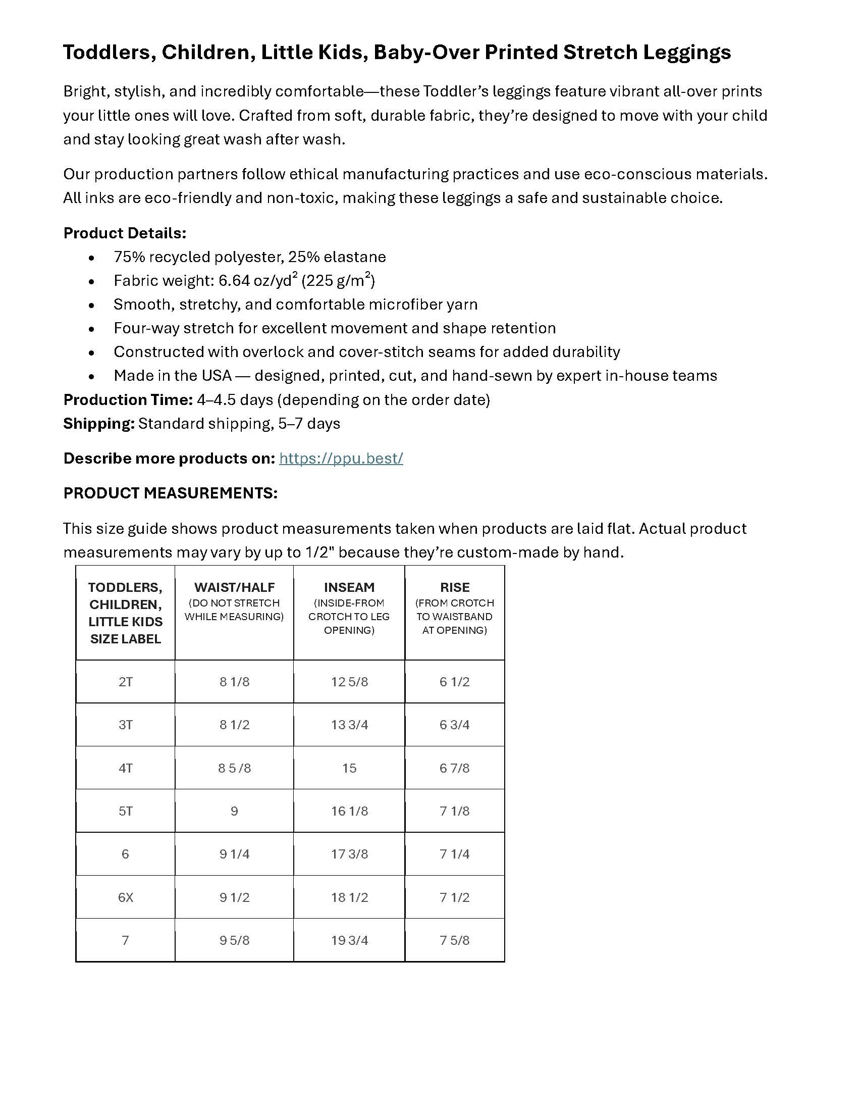 Bright, stylish, and incredibly comfortable—these Toddler’s leggings feature vibrant all-over prints your little ones will love. Crafted from soft, durable fabric, they’re designed to move with your child and stay looking great wash after wash.