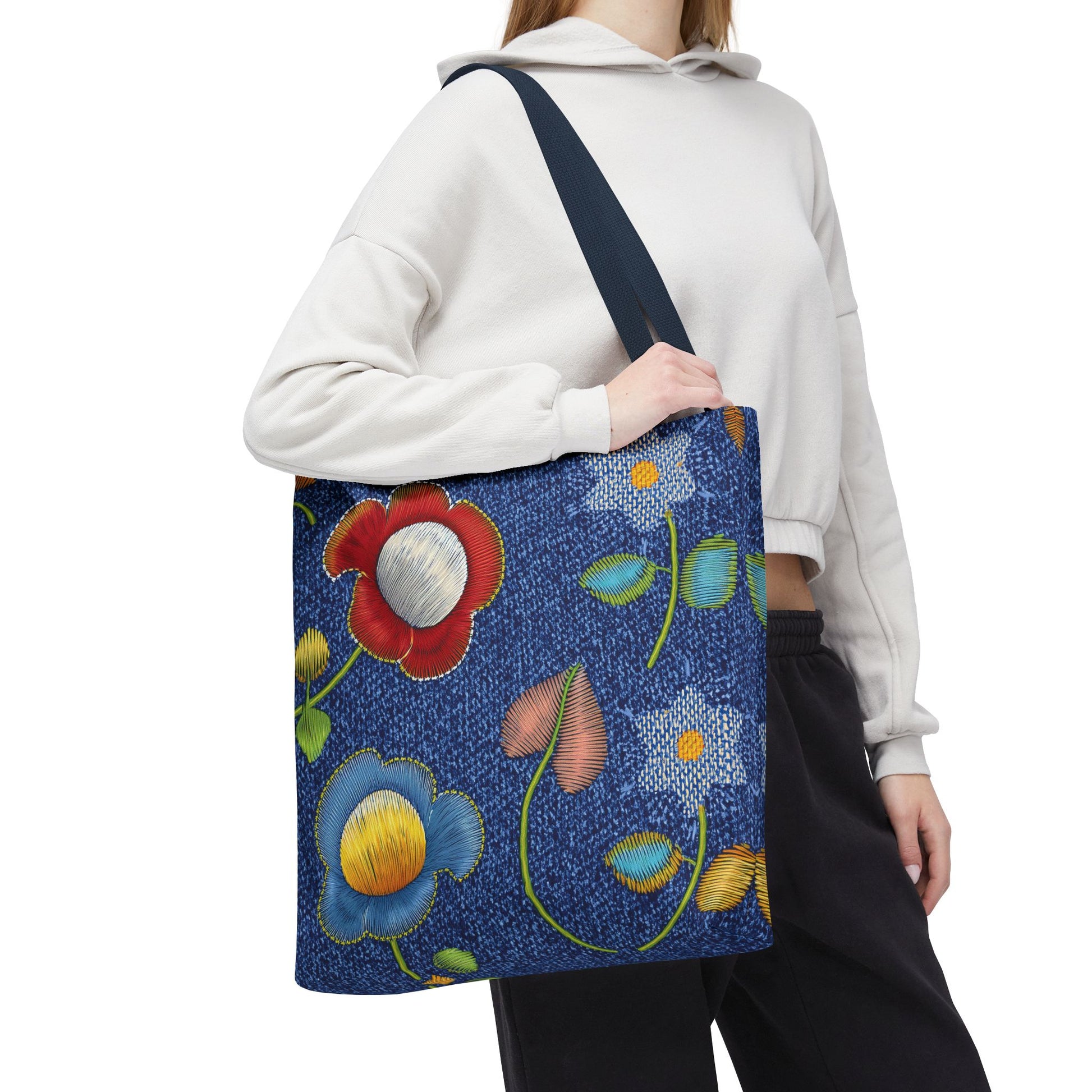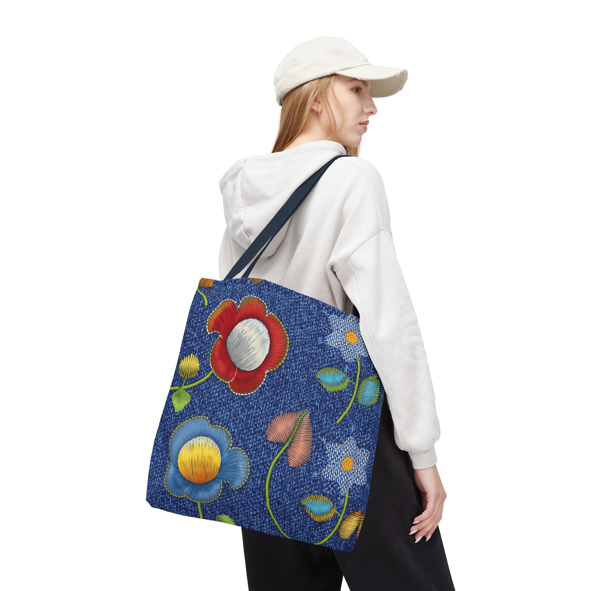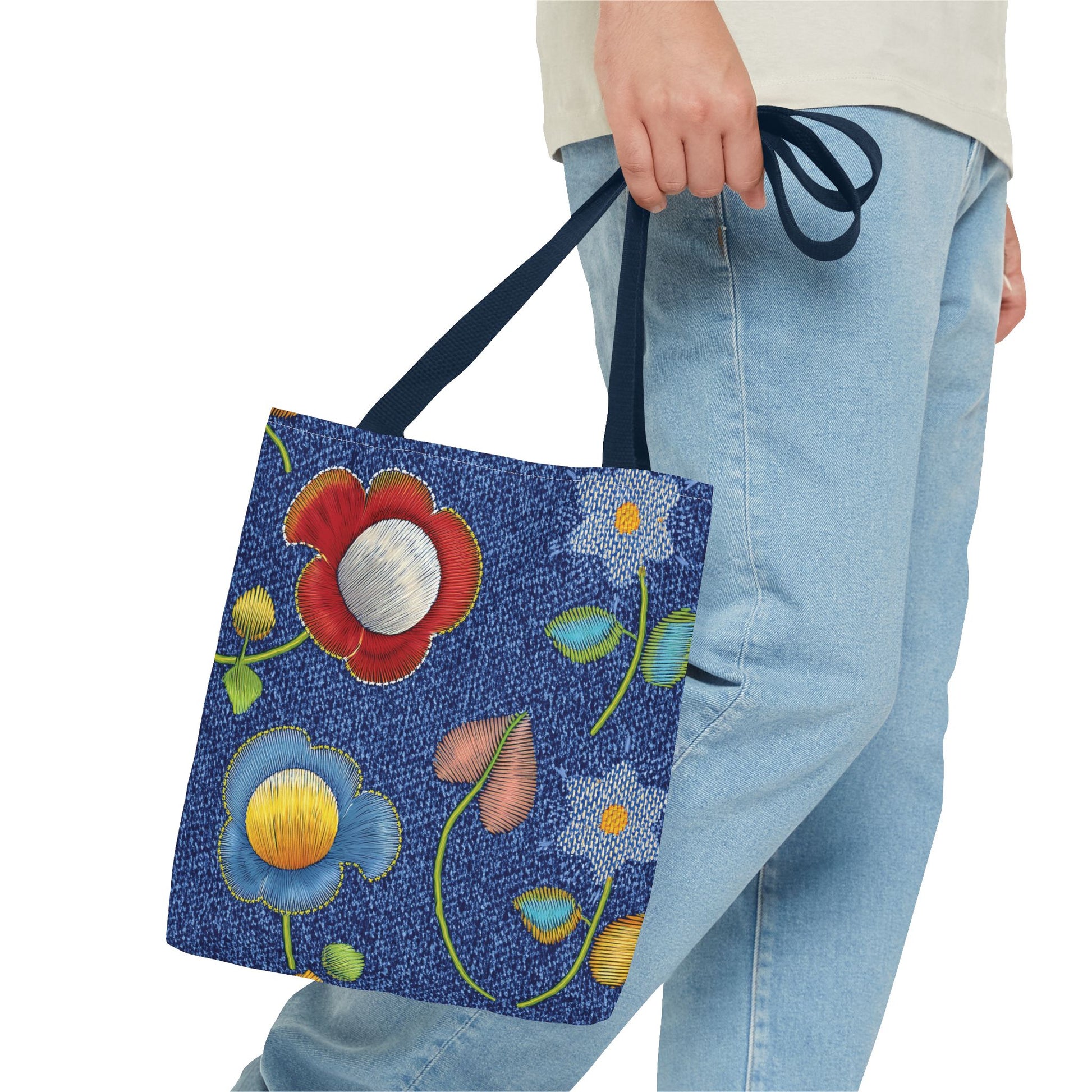 Denim Print Canvas Tote Bag – Elegant Poly Shoulder Bag - Enhance everyday functionality with timeless style in our Denim Print Canvas Tote Bag. Designed for versatility, this custom-printed tote is available in three convenient sizes and offers multiple handle color options to perfectly complement your look. Crafted from premium spun polyester, it delivers exceptional durability with double-stitched seams, sturdy cotton webbing straps, and a non-woven laminate interior.