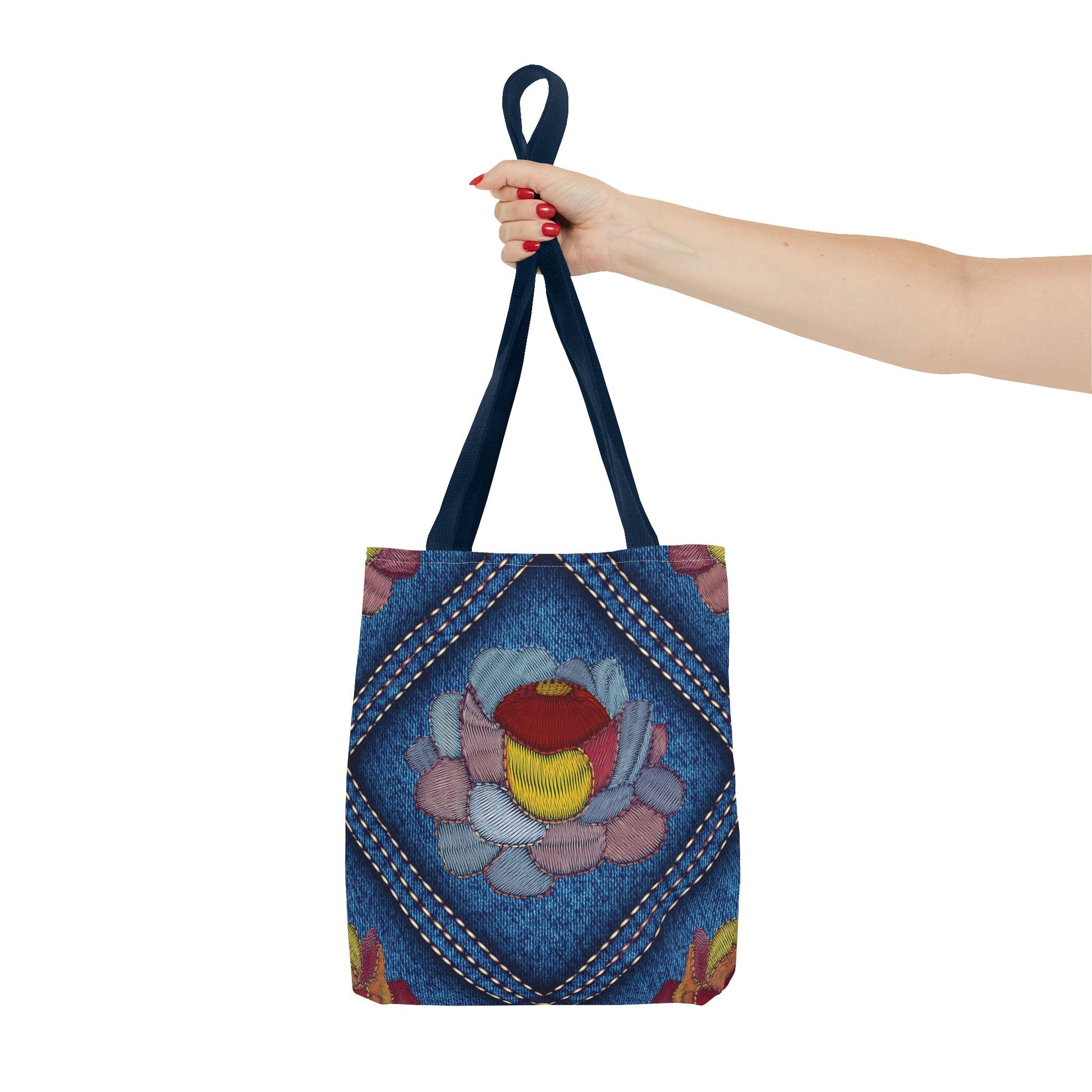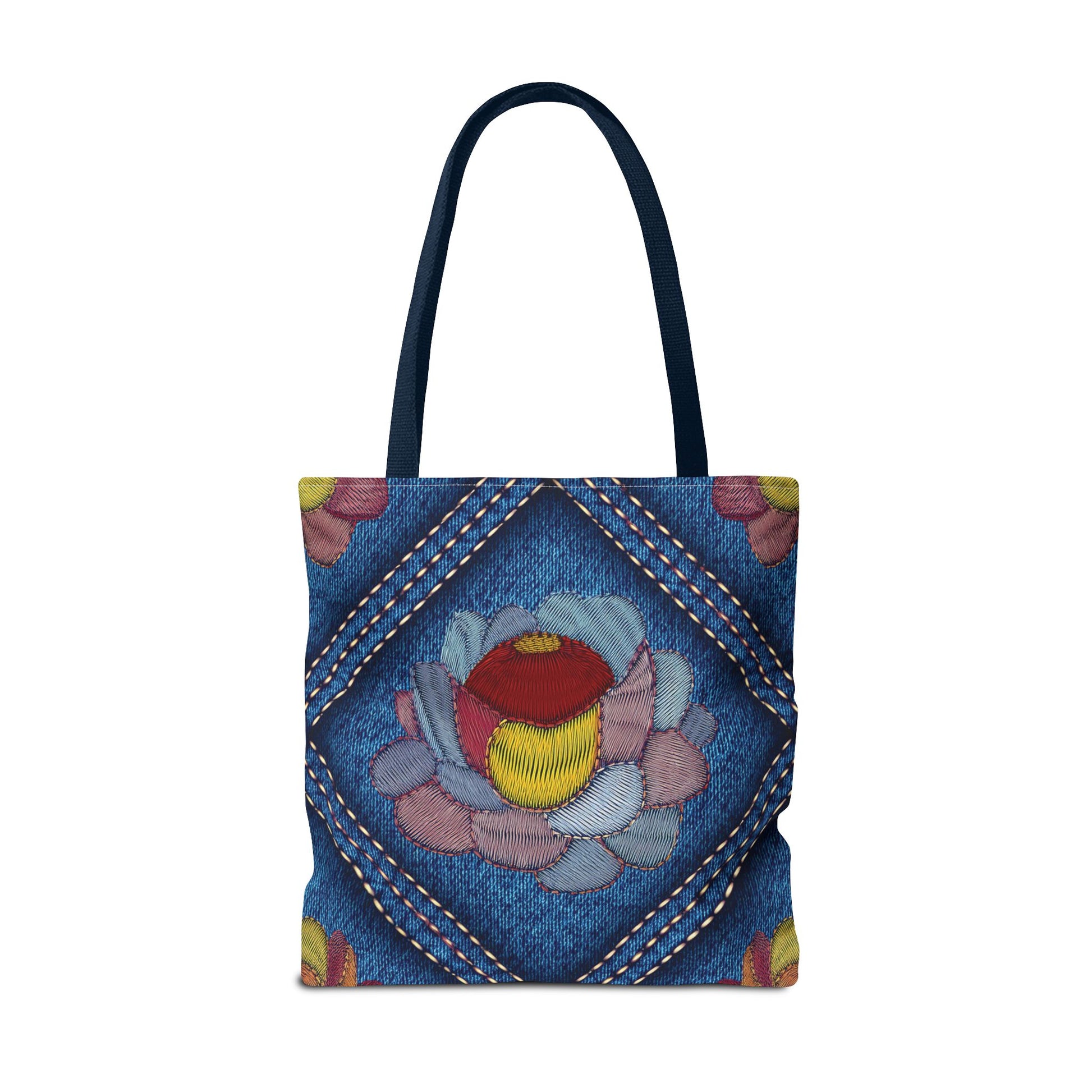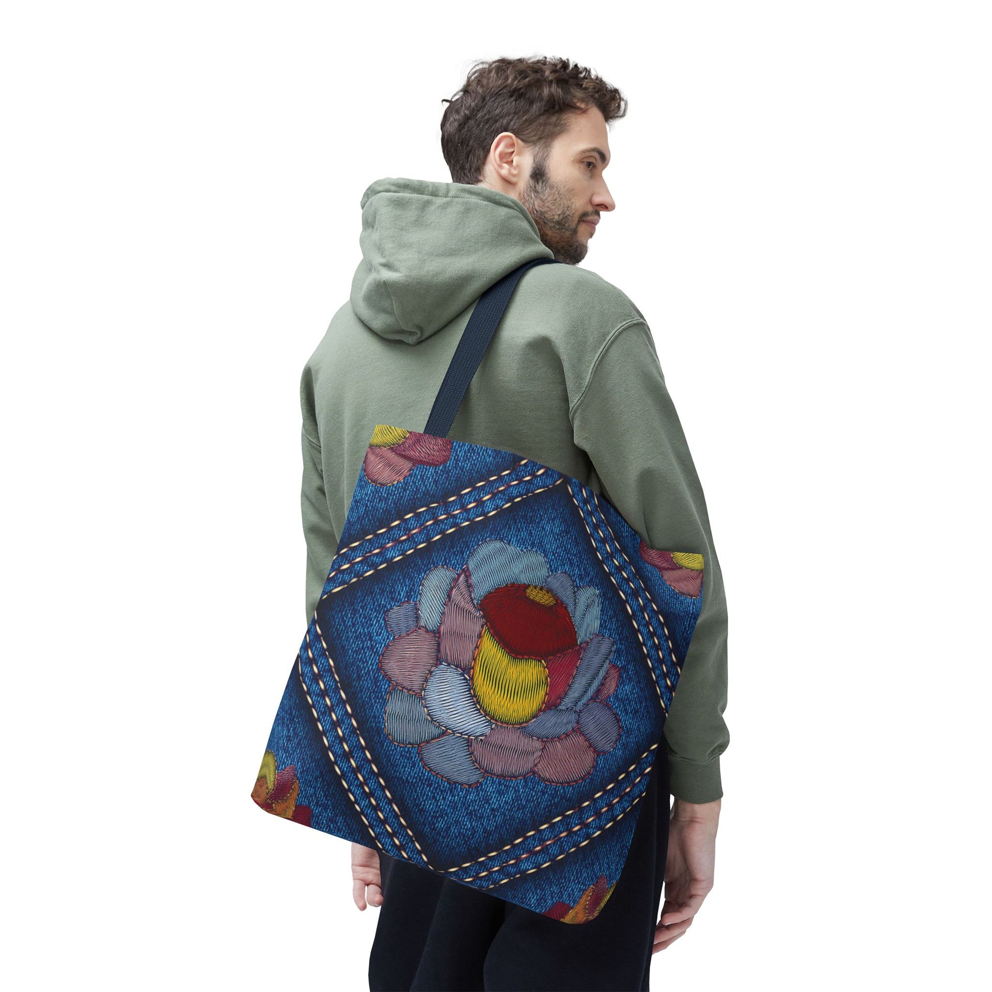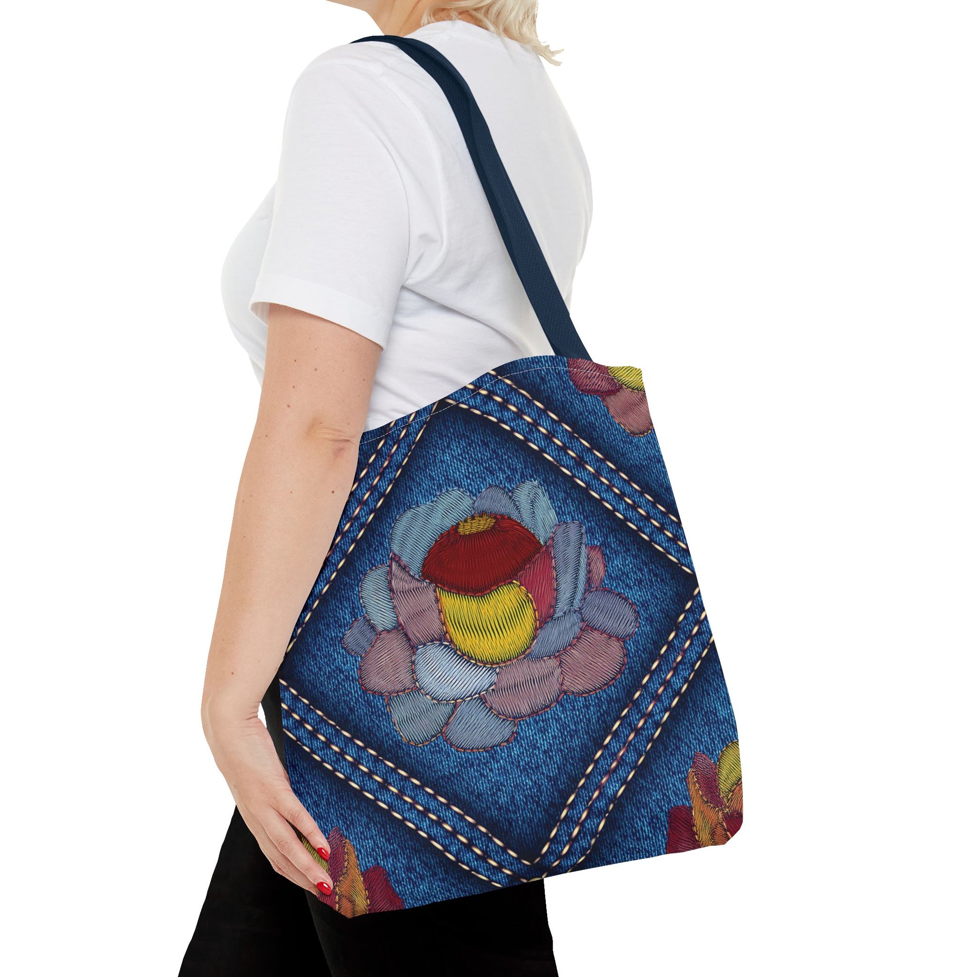 Denim Print Canvas Tote Bag – Elegant Poly Shoulder Bag - Enhance everyday functionality with timeless style in our Denim Print Canvas Tote Bag. Designed for versatility, this custom-printed tote is available in three convenient sizes and offers multiple handle color options to perfectly complement your look. Crafted from premium spun polyester, it delivers exceptional durability with double-stitched seams, sturdy cotton webbing straps, and a non-woven laminate interior.