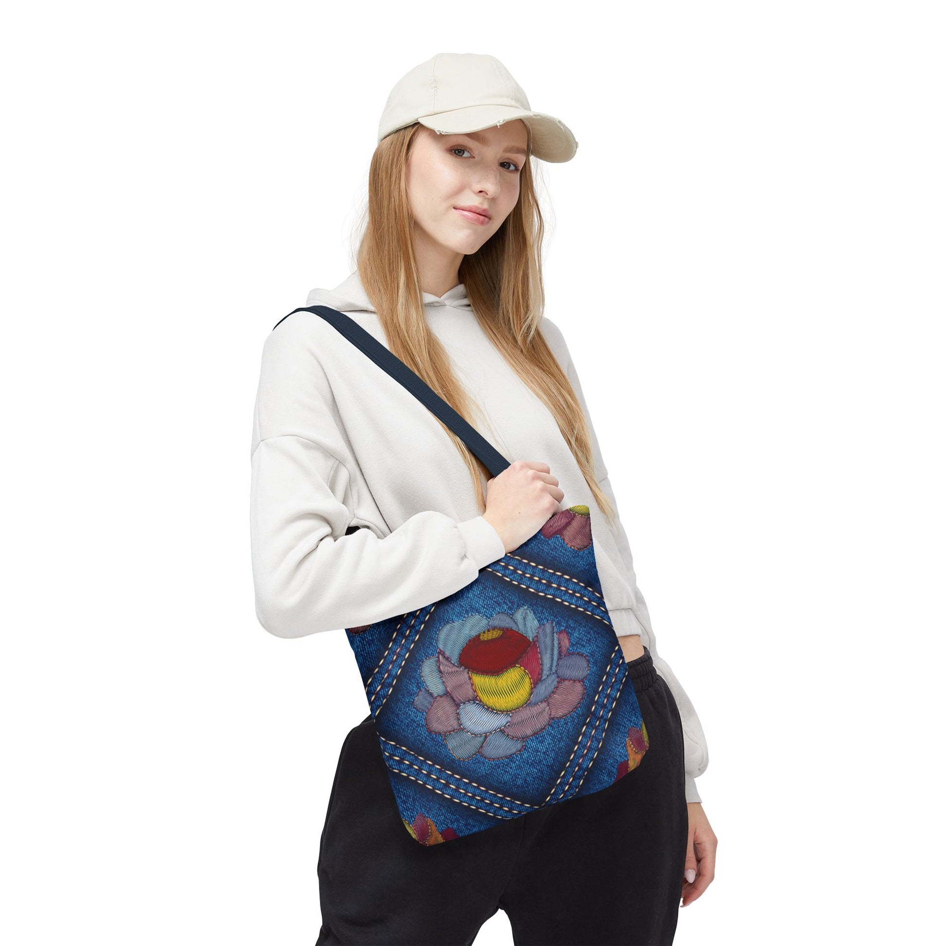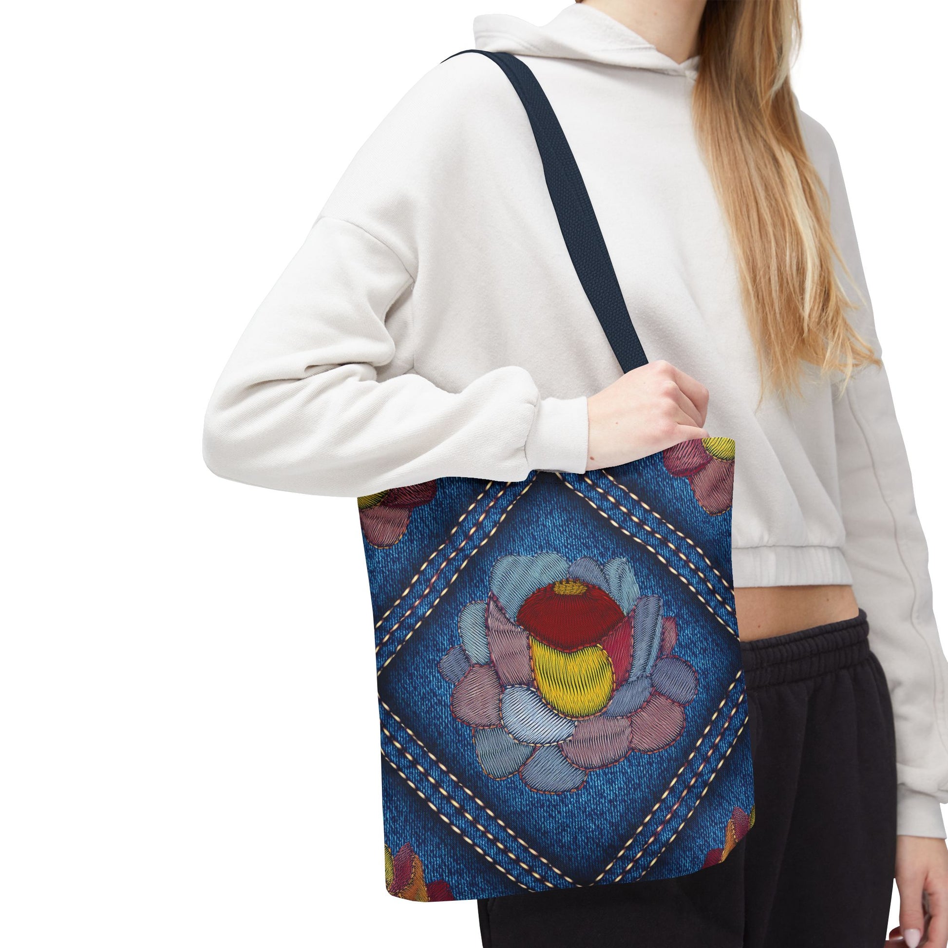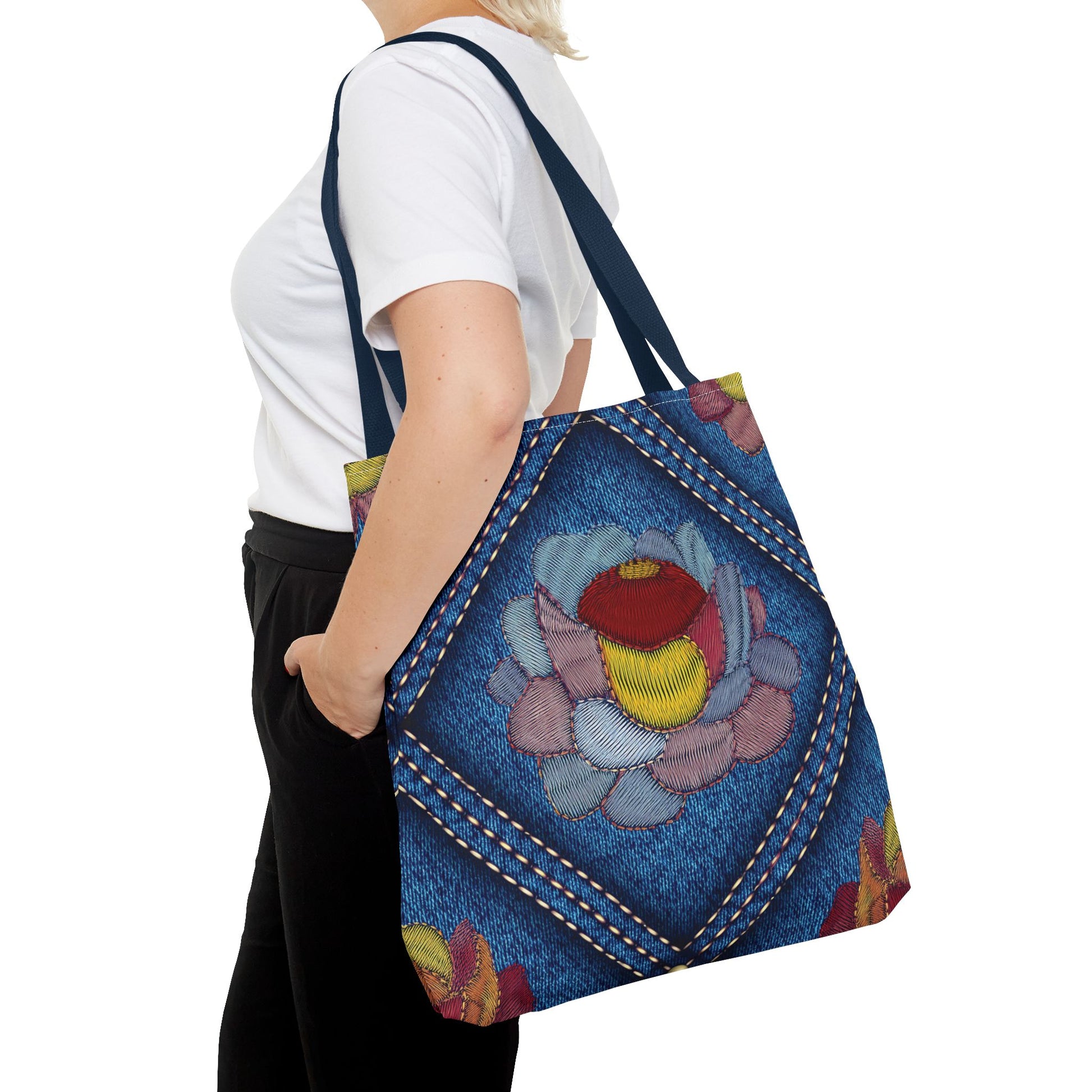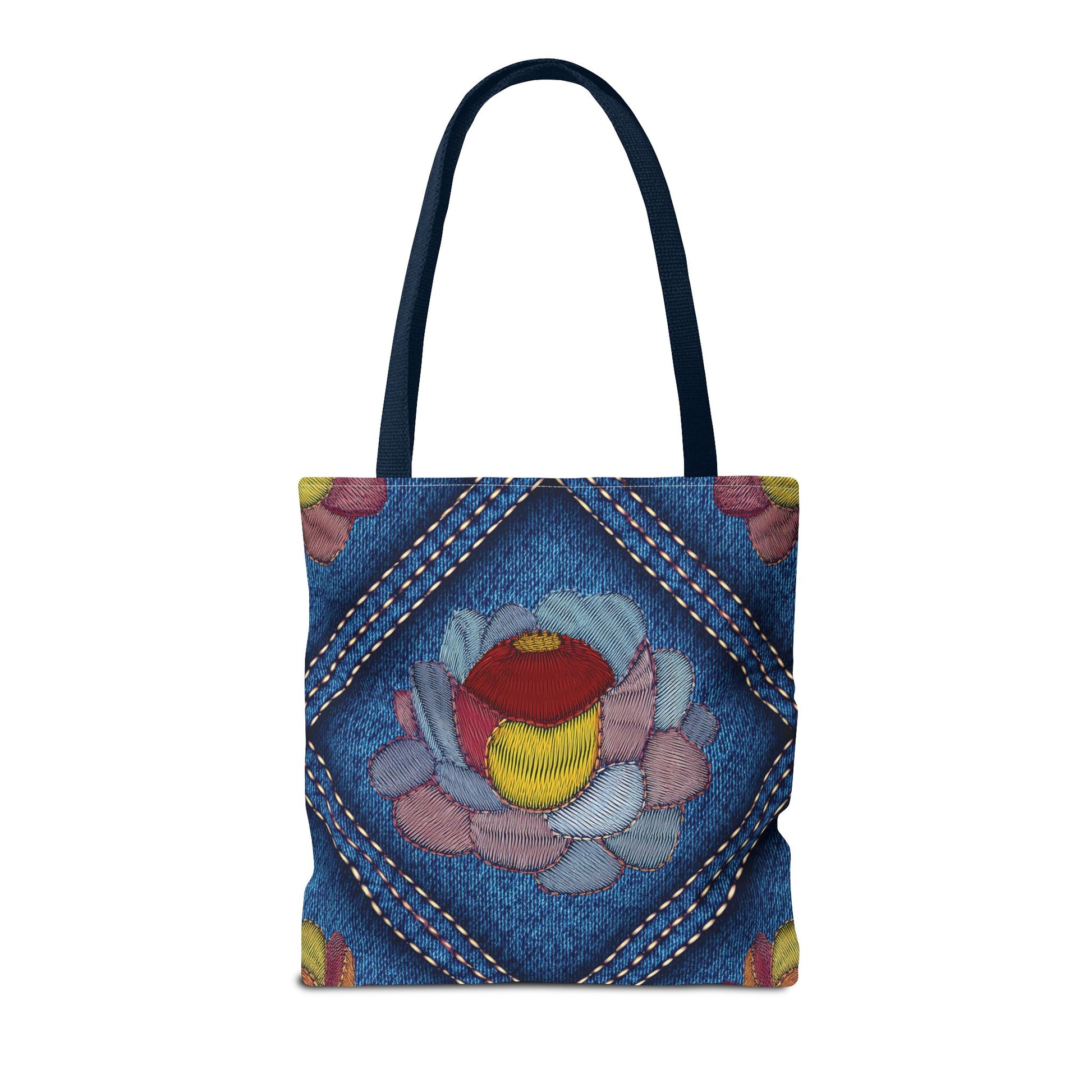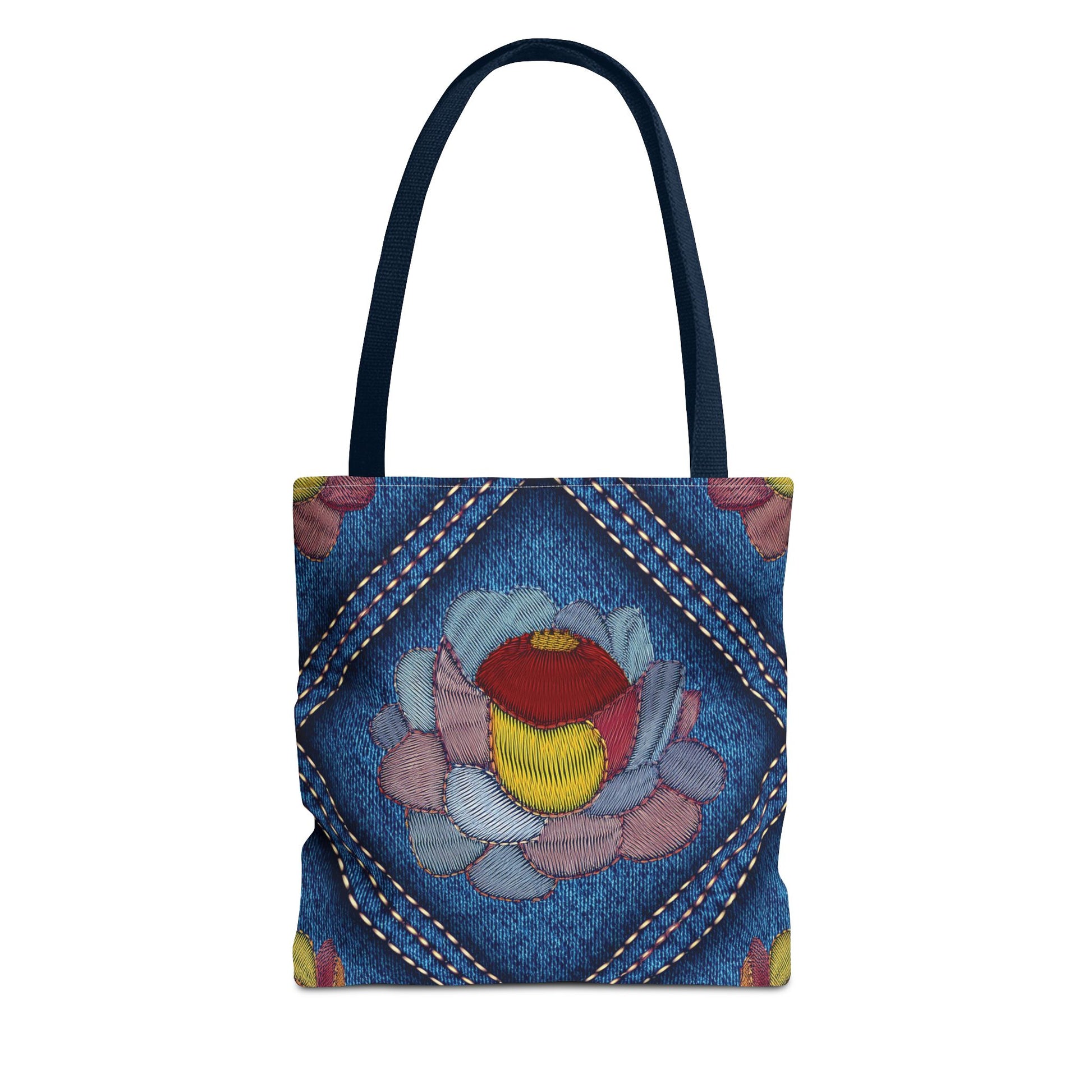 Denim Print Canvas Tote Bag – Elegant Poly Shoulder Bag - Enhance everyday functionality with timeless style in our Denim Print Canvas Tote Bag. Designed for versatility, this custom-printed tote is available in three convenient sizes and offers multiple handle color options to perfectly complement your look. Crafted from premium spun polyester, it delivers exceptional durability with double-stitched seams, sturdy cotton webbing straps, and a non-woven laminate interior.