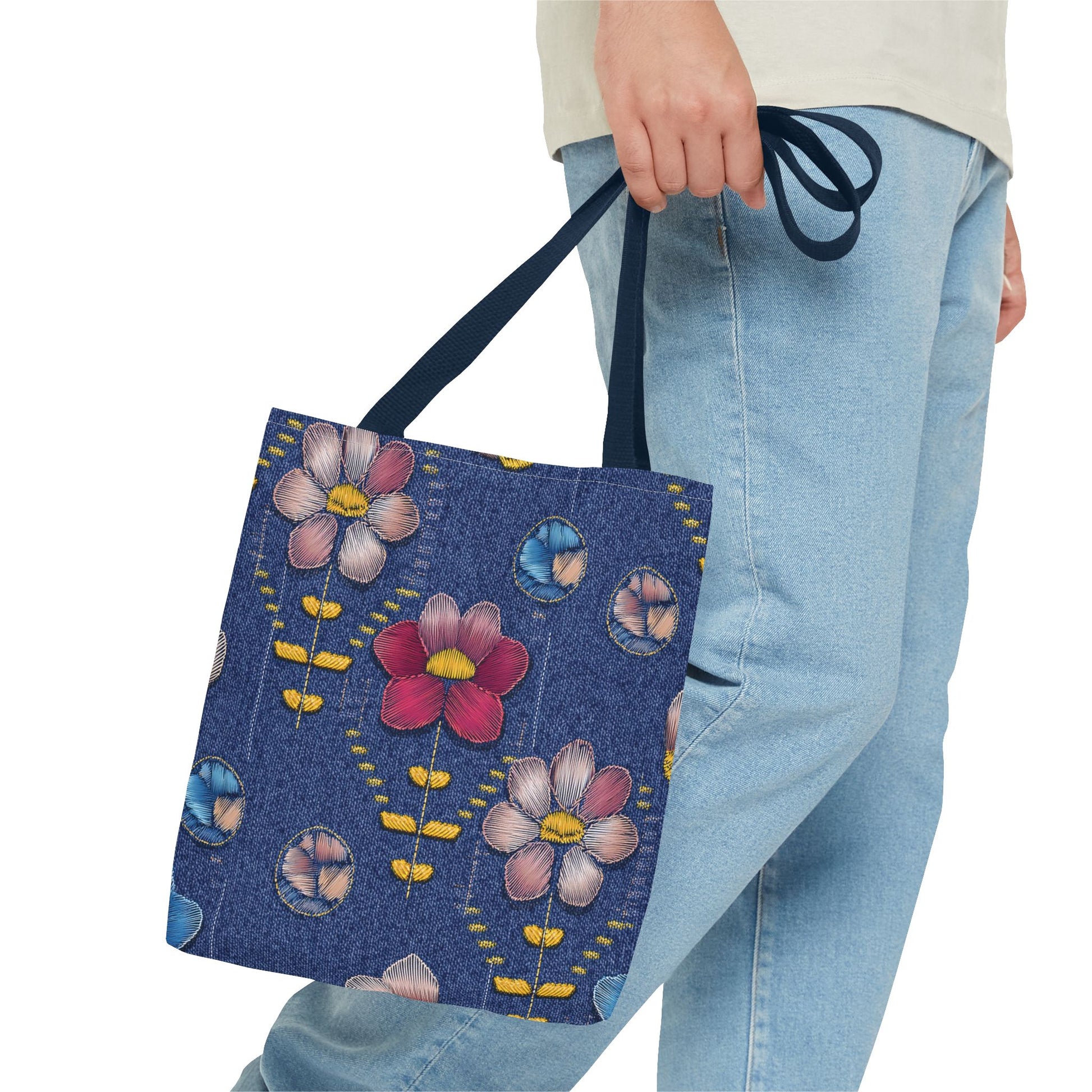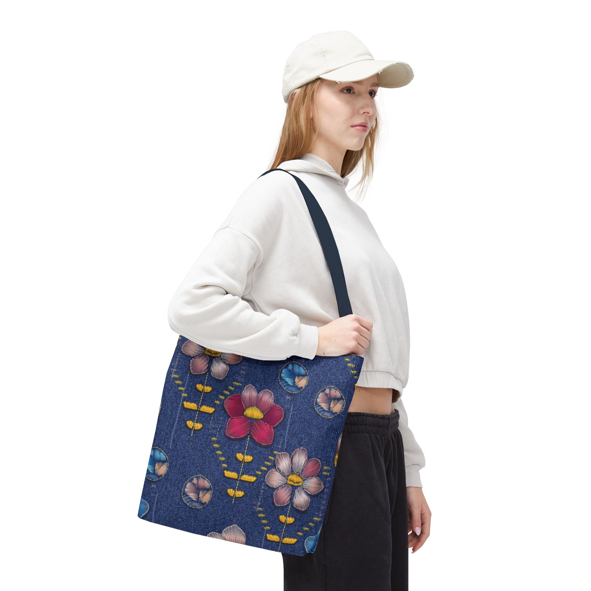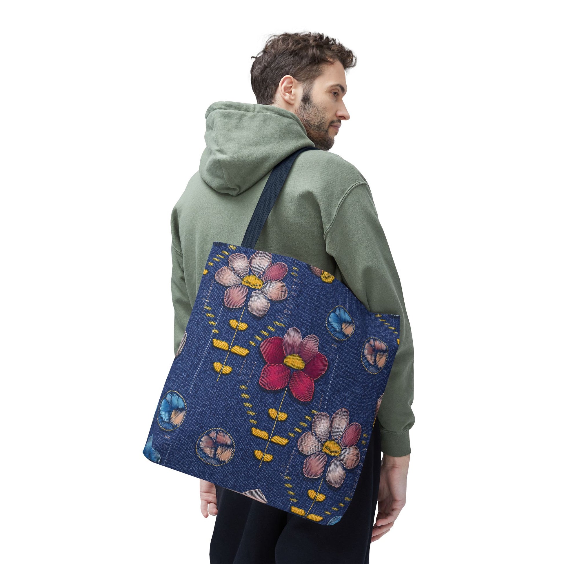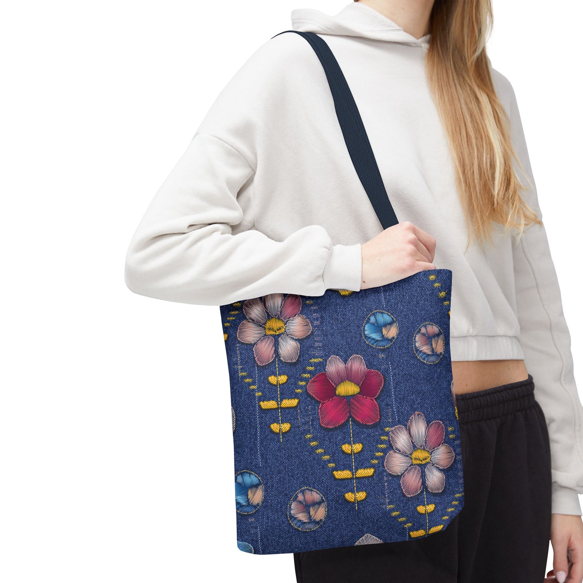 Denim Print Canvas Tote Bag – Elegant Poly Shoulder Bag - Enhance everyday functionality with timeless style in our Denim Print Canvas Tote Bag. Designed for versatility, this custom-printed tote is available in three convenient sizes and offers multiple handle color options to perfectly complement your look. Crafted from premium spun polyester, it delivers exceptional durability with double-stitched seams, sturdy cotton webbing straps, and a non-woven laminate interior.