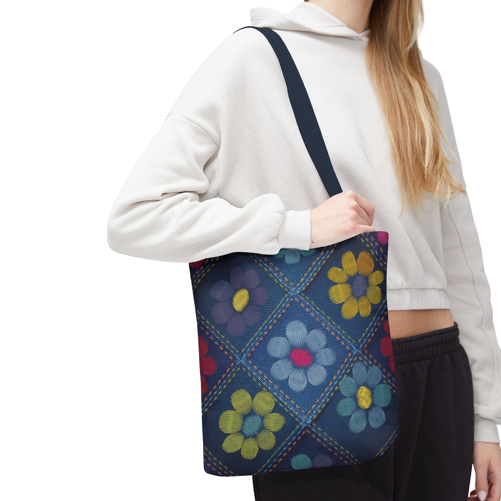 Denim Print Canvas Tote Bag – Elegant Poly Shoulder Bag - Enhance everyday functionality with timeless style in our Denim Print Canvas Tote Bag. Designed for versatility, this custom-printed tote is available in three convenient sizes and offers multiple handle color options to perfectly complement your look. Crafted from premium spun polyester, it delivers exceptional durability with double-stitched seams, sturdy cotton webbing straps, and a non-woven laminate interior.
