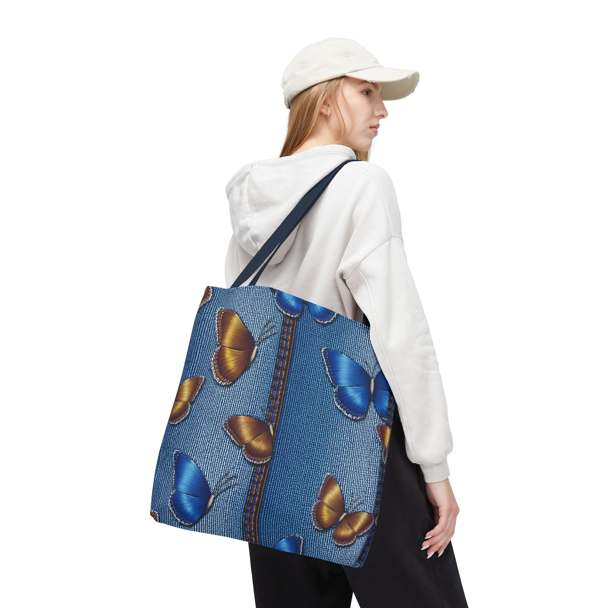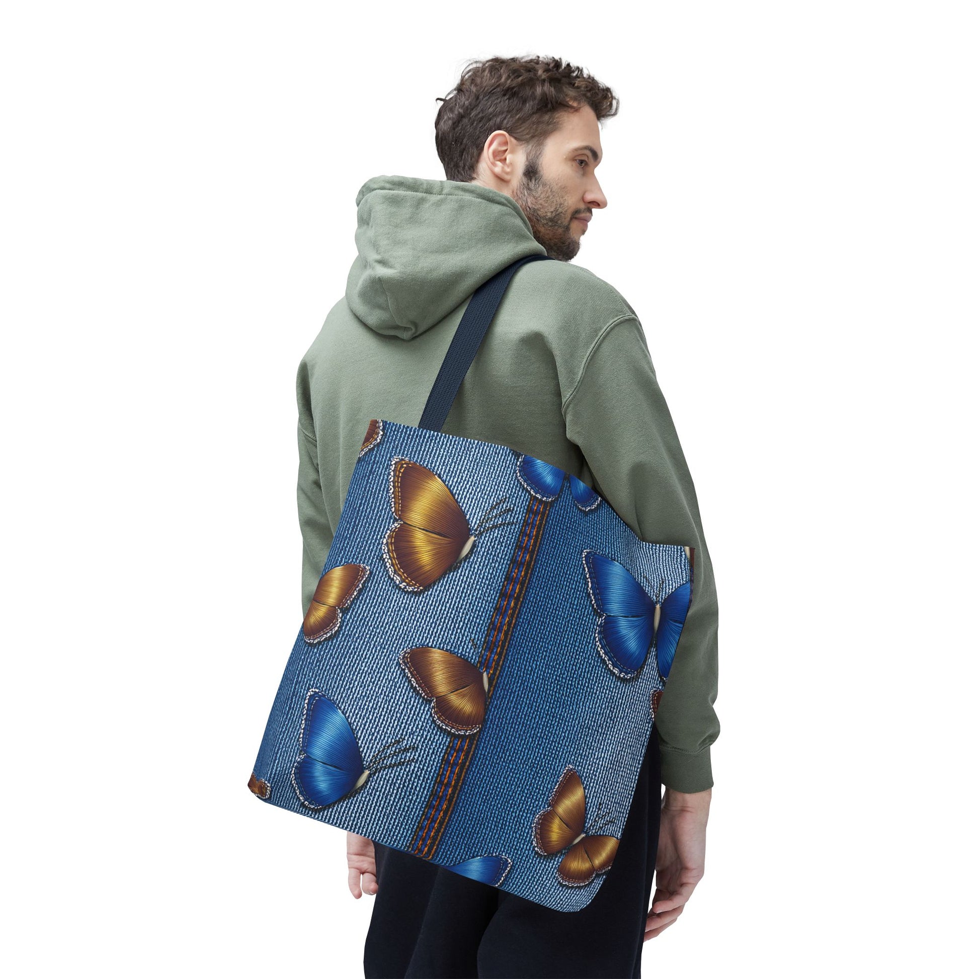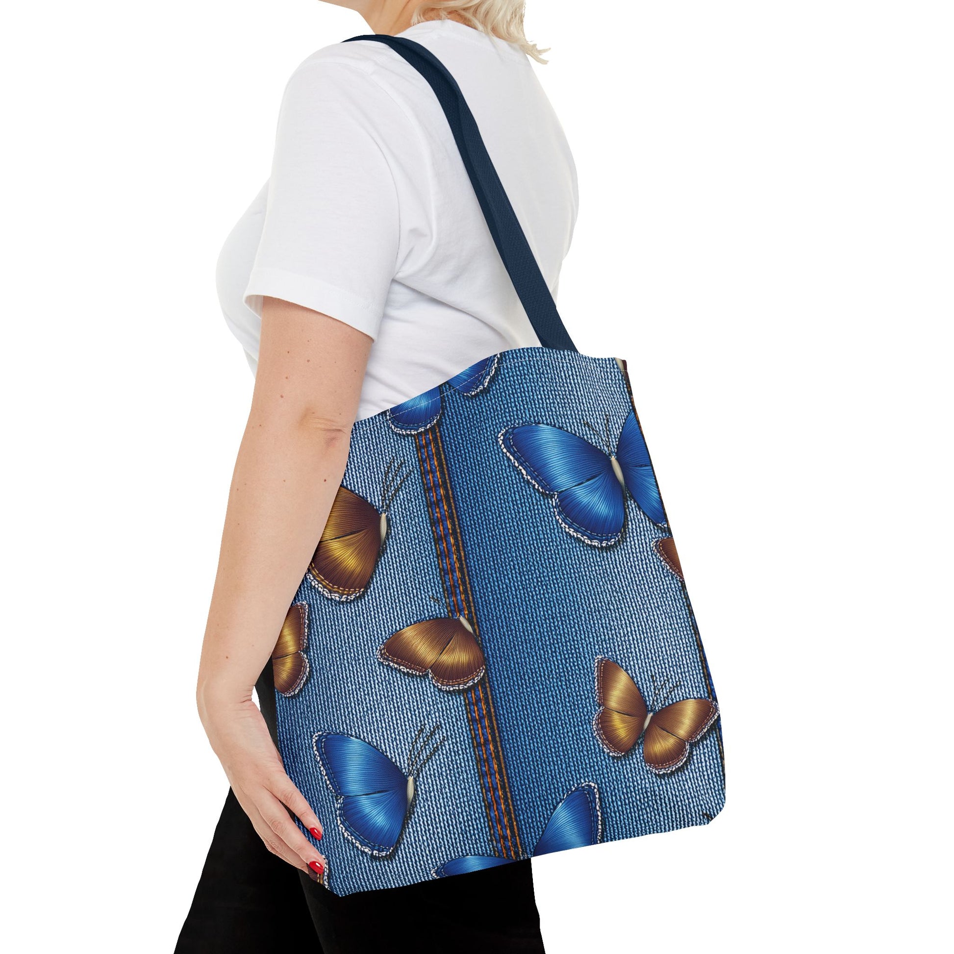 Denim Print Canvas Tote Bag – Elegant Poly Shoulder Bag - Enhance everyday functionality with timeless style in our Denim Print Canvas Tote Bag. Designed for versatility, this custom-printed tote is available in three convenient sizes and offers multiple handle color options to perfectly complement your look. Crafted from premium spun polyester, it delivers exceptional durability with double-stitched seams, sturdy cotton webbing straps, and a non-woven laminate interior.