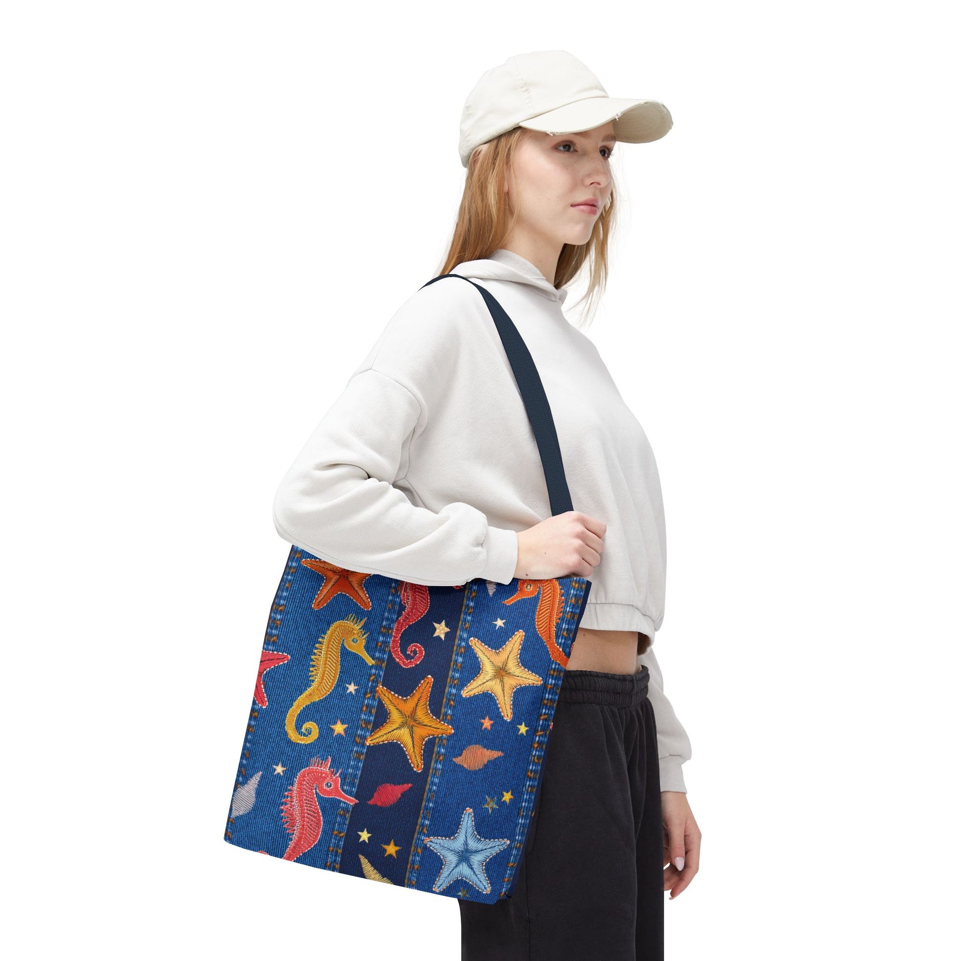 Denim Print Canvas Tote Bag – Elegant Poly Shoulder Bag - Enhance everyday functionality with timeless style in our Denim Print Canvas Tote Bag. Designed for versatility, this custom-printed tote is available in three convenient sizes and offers multiple handle color options to perfectly complement your look. Crafted from premium spun polyester, it delivers exceptional durability with double-stitched seams, sturdy cotton webbing straps, and a non-woven laminate interior.