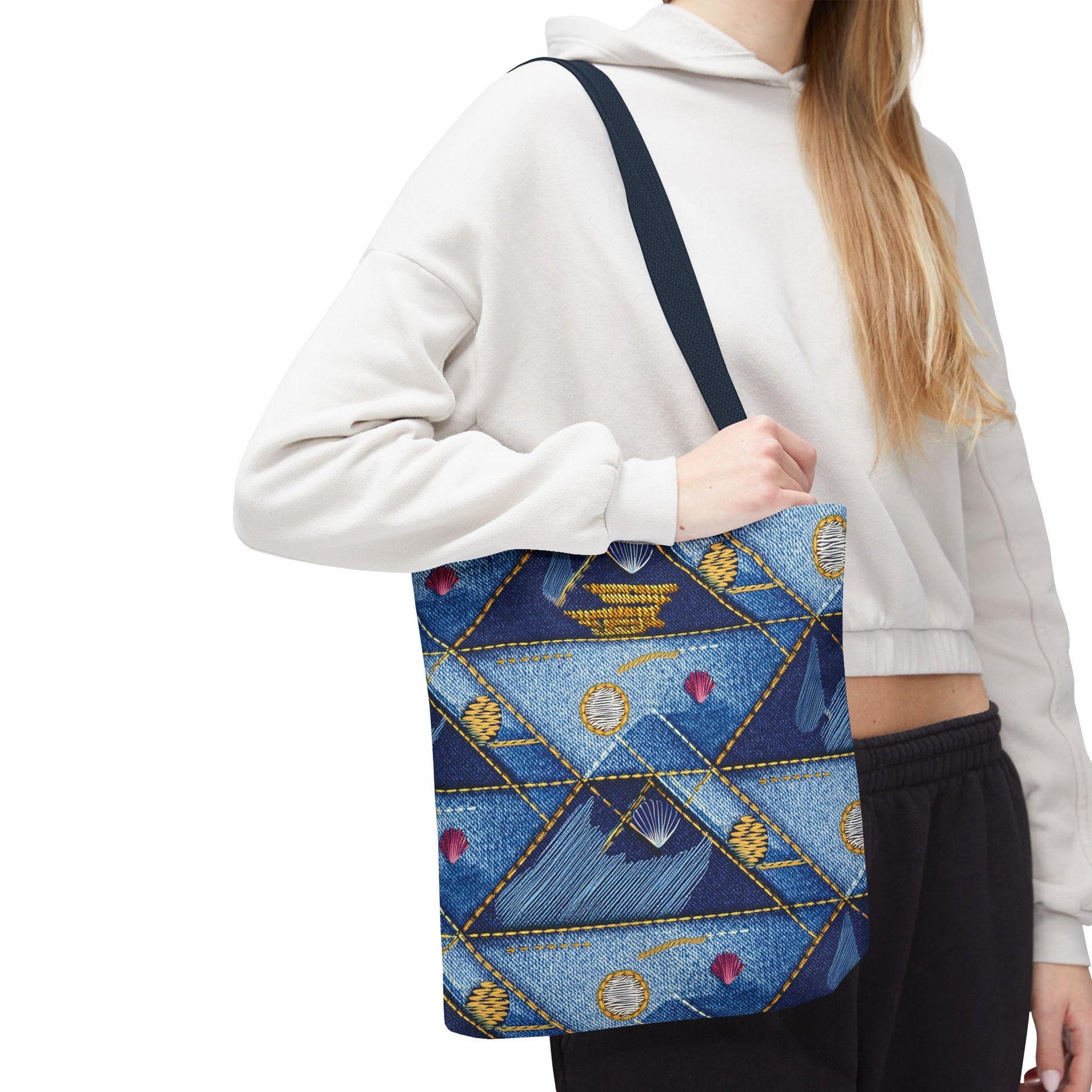 Denim Print Canvas Tote Bag – Elegant Poly Shoulder Bag - Enhance everyday functionality with timeless style in our Denim Print Canvas Tote Bag. Designed for versatility, this custom-printed tote is available in three convenient sizes and offers multiple handle color options to perfectly complement your look. Crafted from premium spun polyester, it delivers exceptional durability with double-stitched seams, sturdy cotton webbing straps, and a non-woven laminate interior.