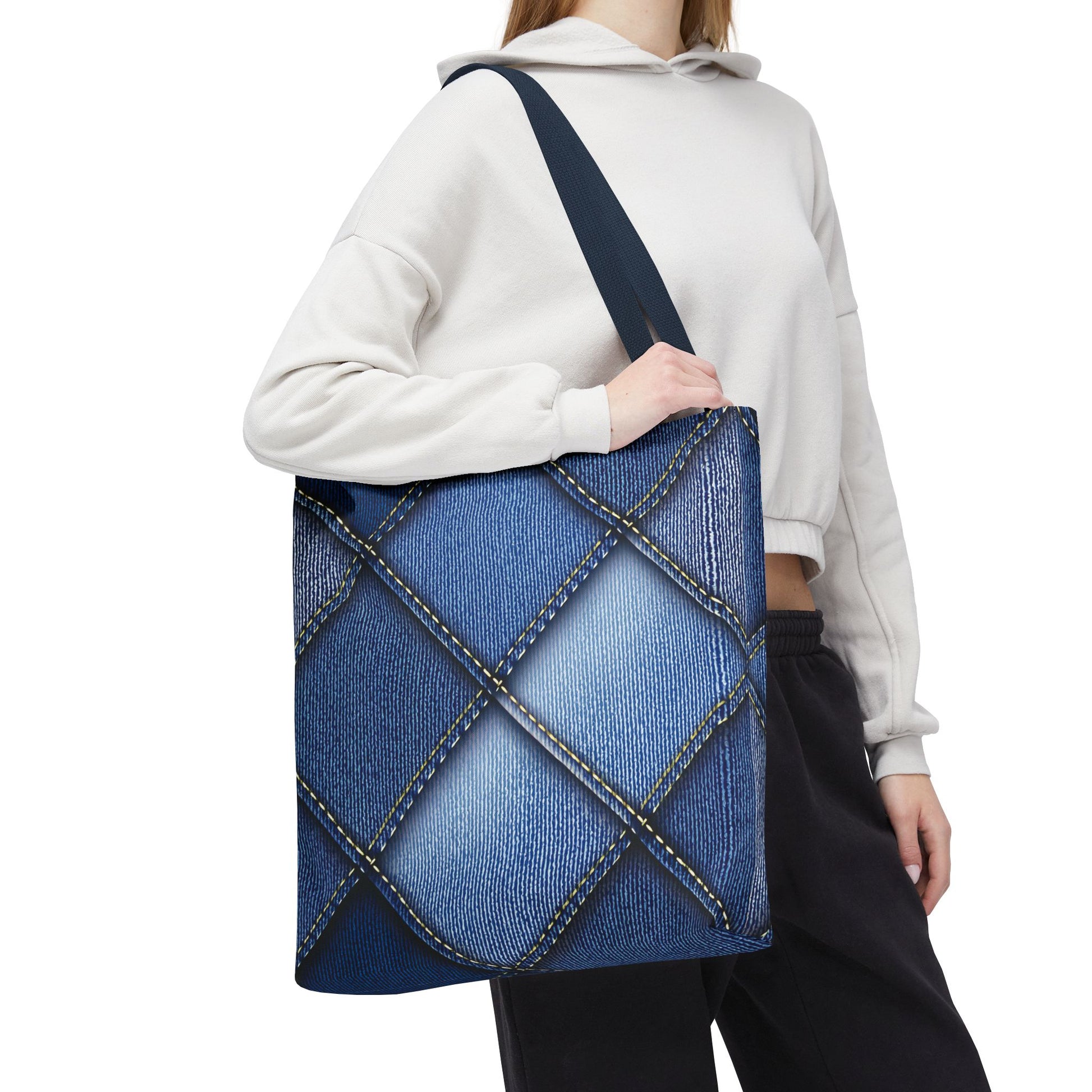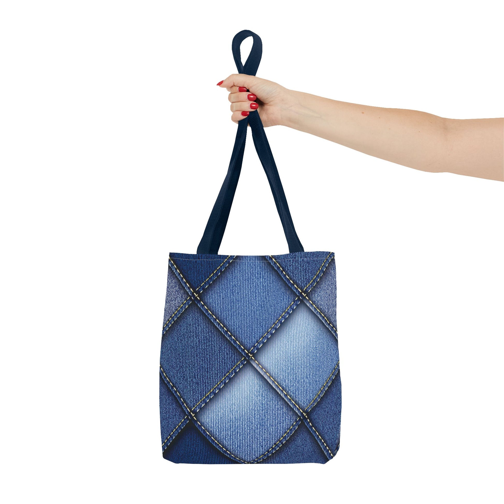 Denim Print Canvas Tote Bag – Elegant Poly Shoulder Bag - Enhance everyday functionality with timeless style in our Denim Print Canvas Tote Bag. Designed for versatility, this custom-printed tote is available in three convenient sizes and offers multiple handle color options to perfectly complement your look. Crafted from premium spun polyester, it delivers exceptional durability with double-stitched seams, sturdy cotton webbing straps, and a non-woven laminate interior.