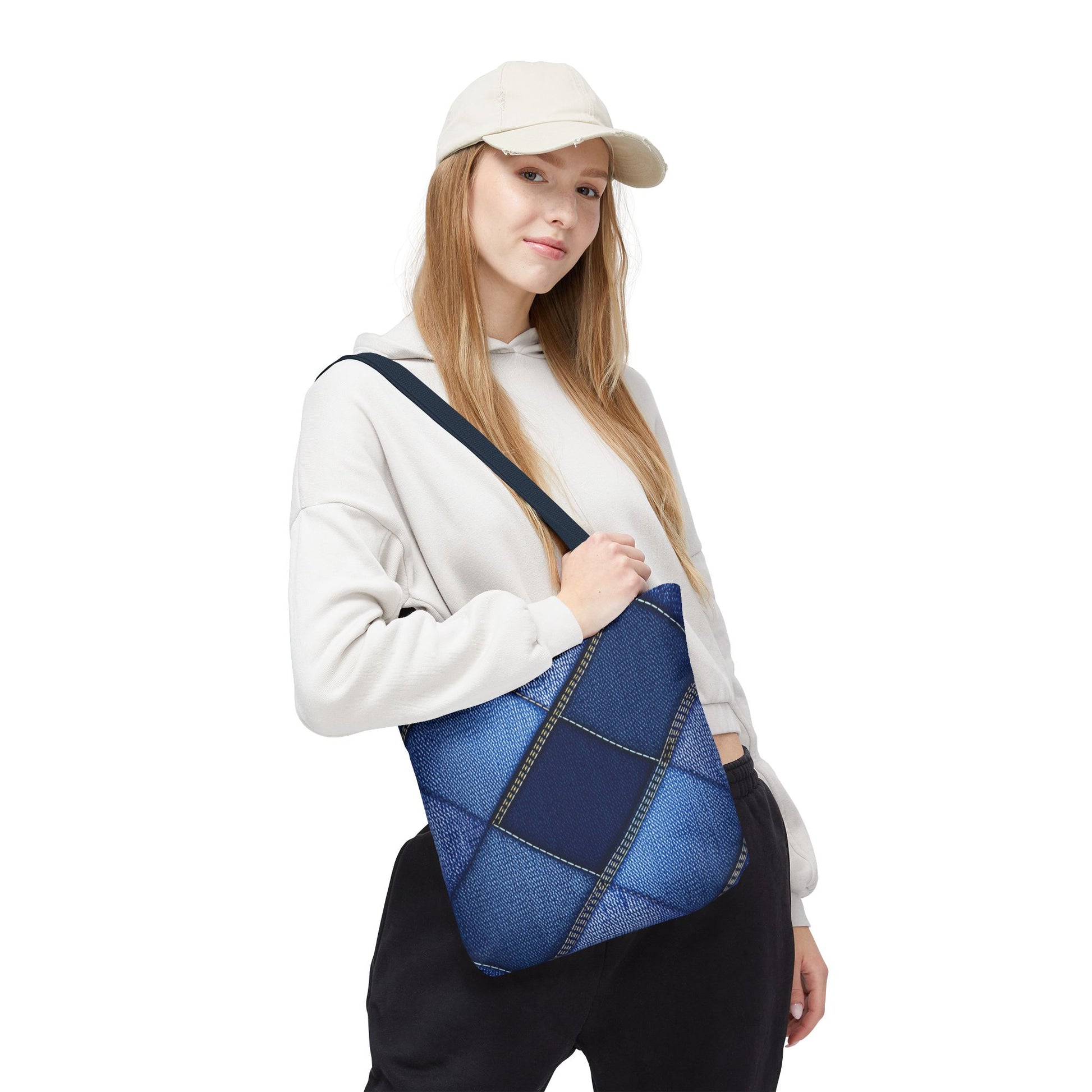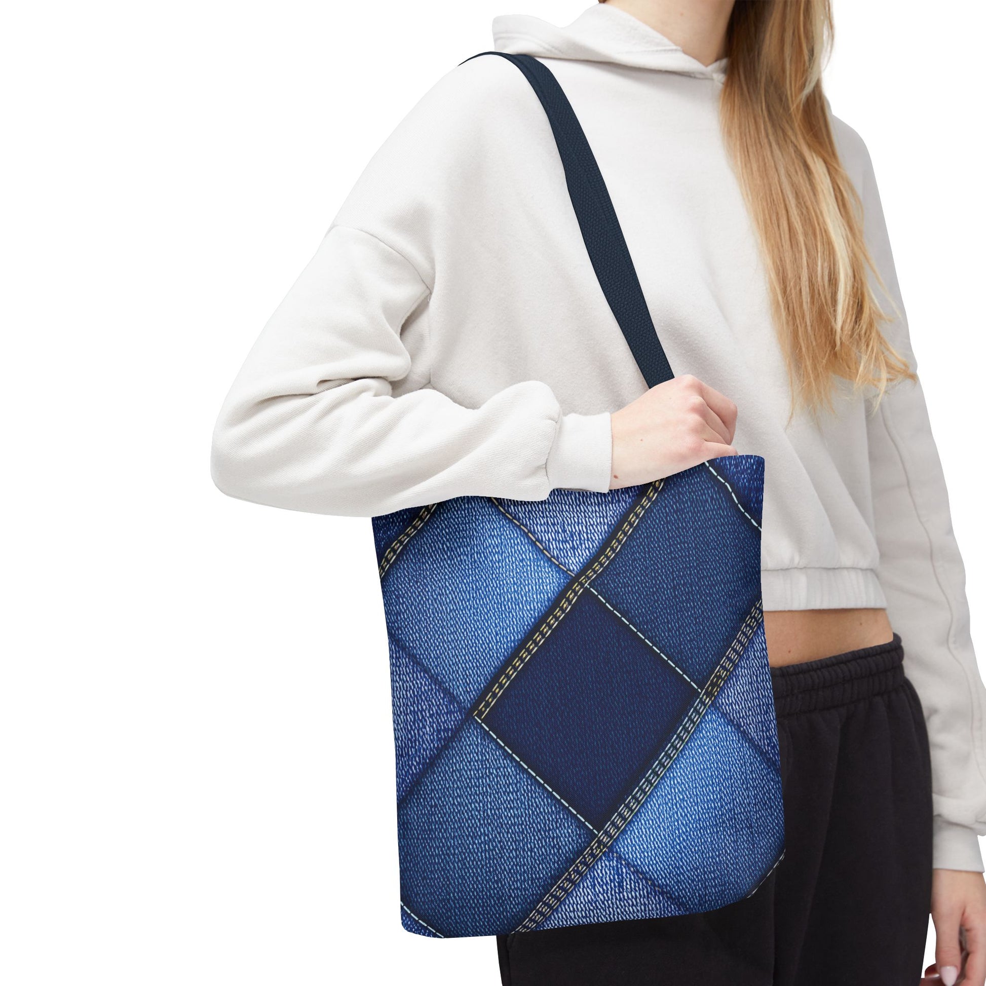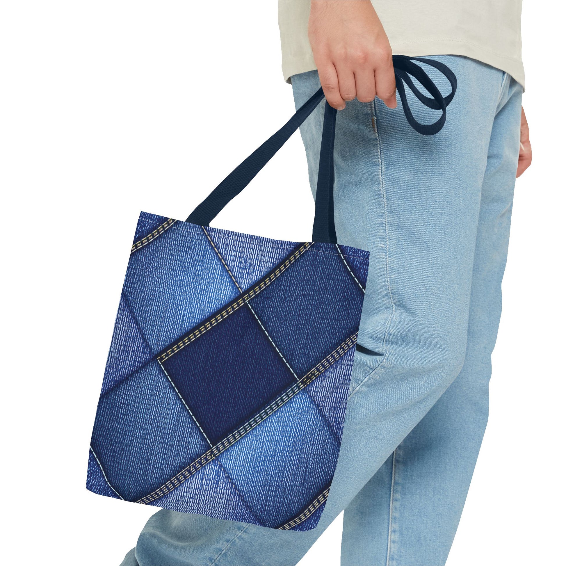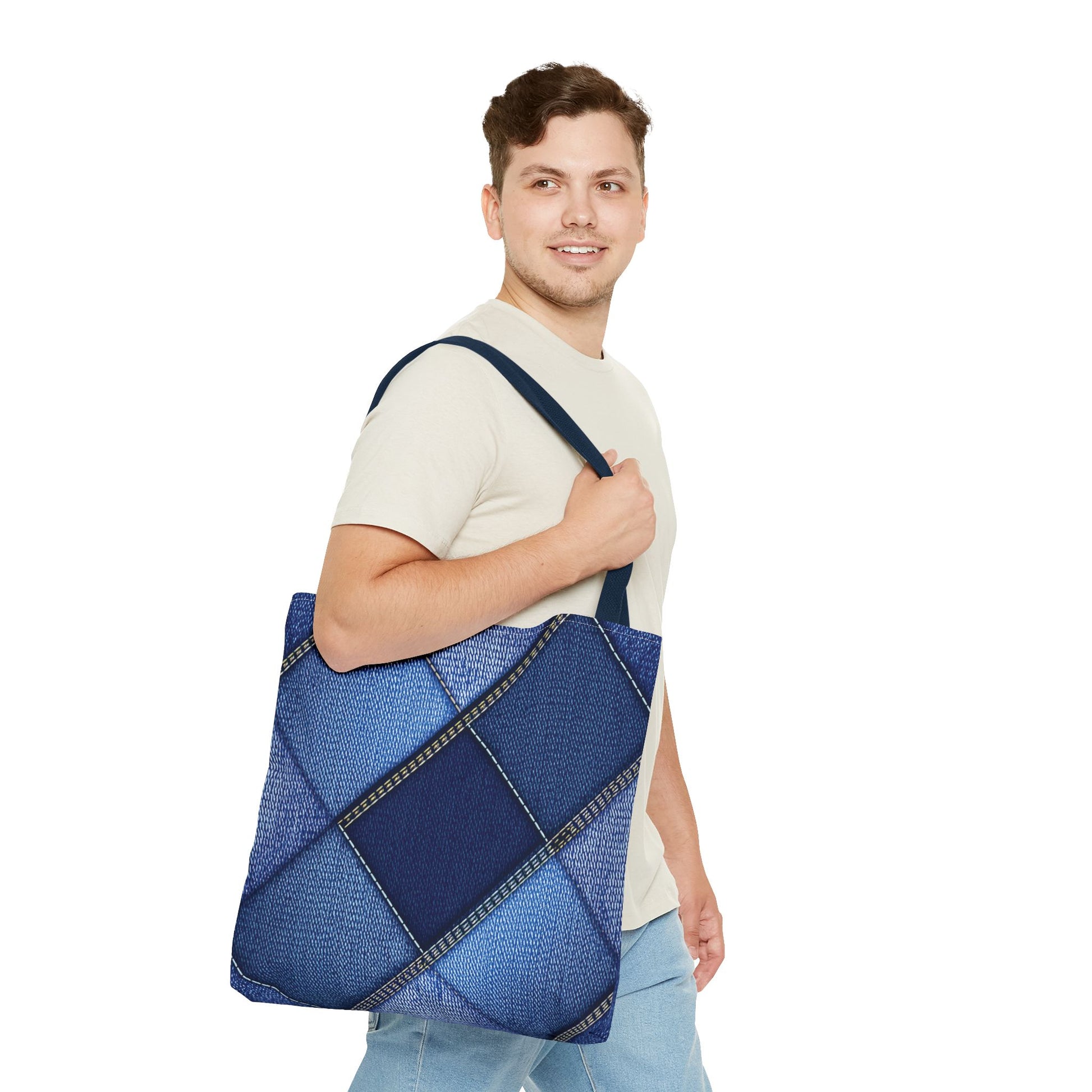 Denim Print Canvas Tote Bag – Elegant Poly Shoulder Bag - Enhance everyday functionality with timeless style in our Denim Print Canvas Tote Bag. Designed for versatility, this custom-printed tote is available in three convenient sizes and offers multiple handle color options to perfectly complement your look. Crafted from premium spun polyester, it delivers exceptional durability with double-stitched seams, sturdy cotton webbing straps, and a non-woven laminate interior.