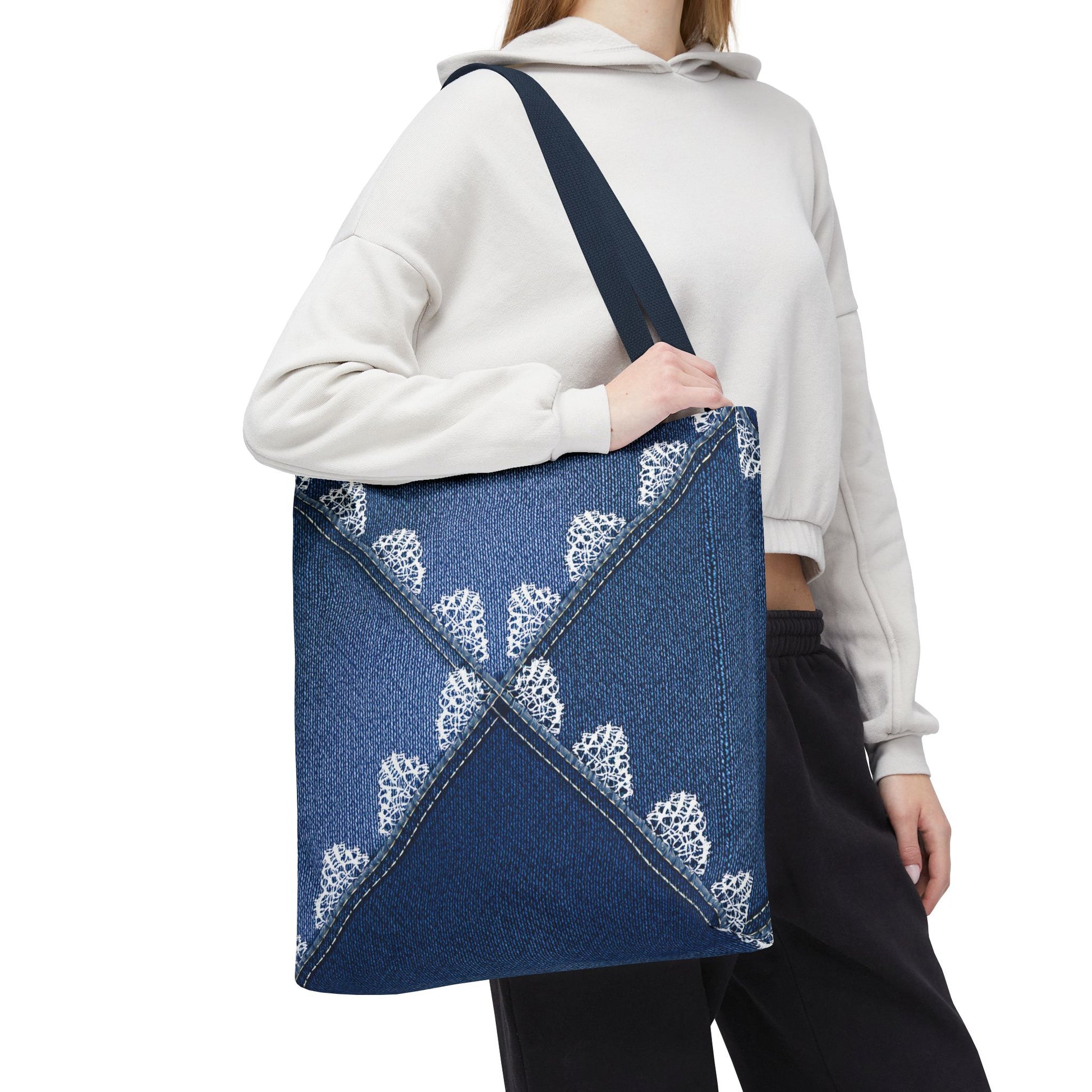 Denim Print Canvas Tote Bag – Elegant Poly Shoulder Bag - Enhance everyday functionality with timeless style in our Denim Print Canvas Tote Bag. Designed for versatility, this custom-printed tote is available in three convenient sizes and offers multiple handle color options to perfectly complement your look. Crafted from premium spun polyester, it delivers exceptional durability with double-stitched seams, sturdy cotton webbing straps, and a non-woven laminate interior.