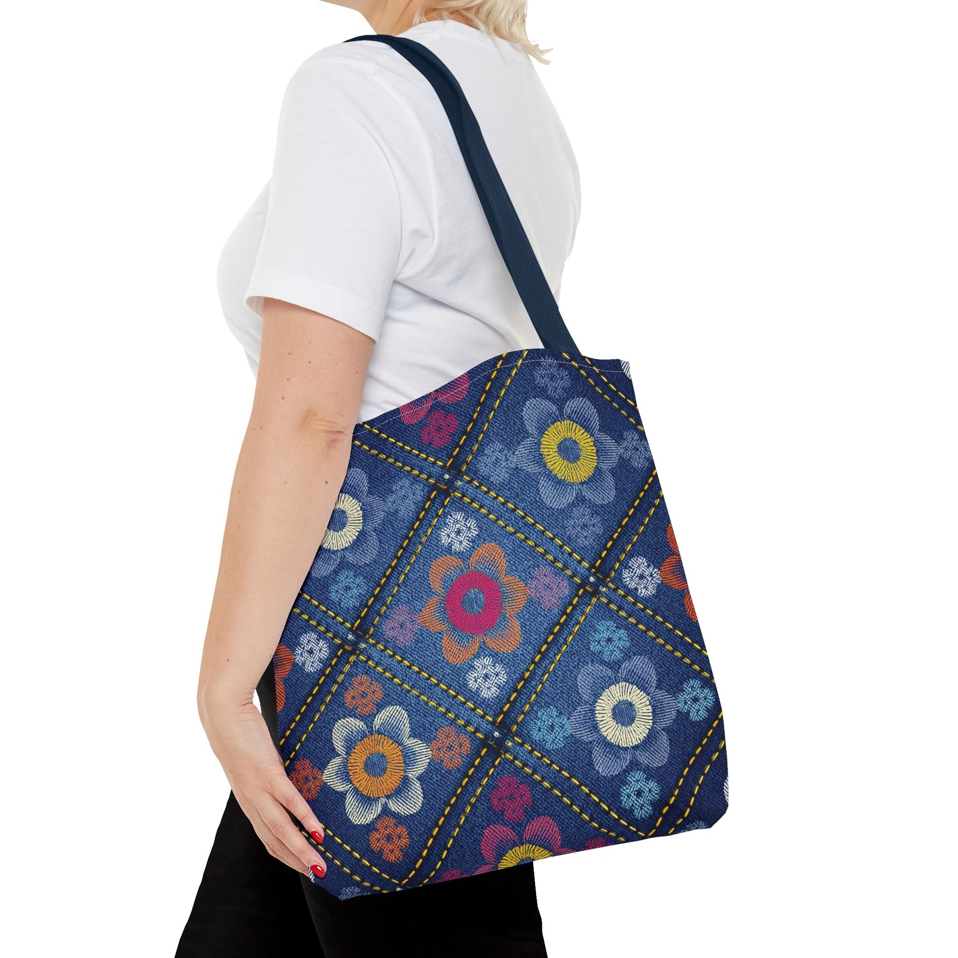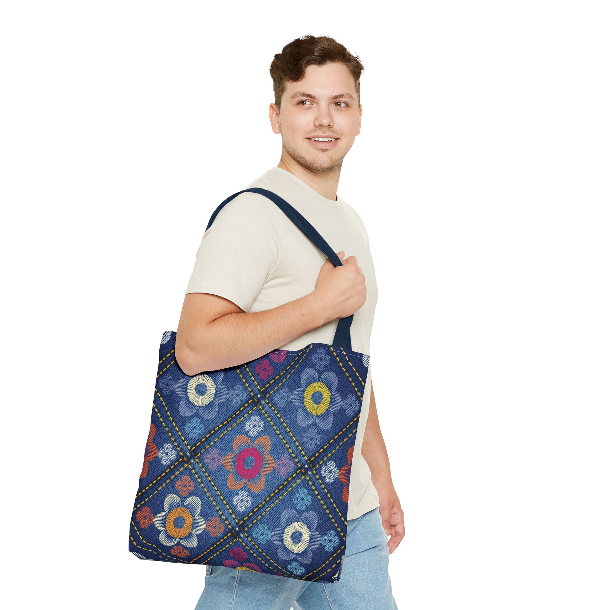 Denim Print Canvas Tote Bag – Elegant Poly Shoulder Bag - Enhance everyday functionality with timeless style in our Denim Print Canvas Tote Bag. Designed for versatility, this custom-printed tote is available in three convenient sizes and offers multiple handle color options to perfectly complement your look. Crafted from premium spun polyester, it delivers exceptional durability with double-stitched seams, sturdy cotton webbing straps, and a non-woven laminate interior.