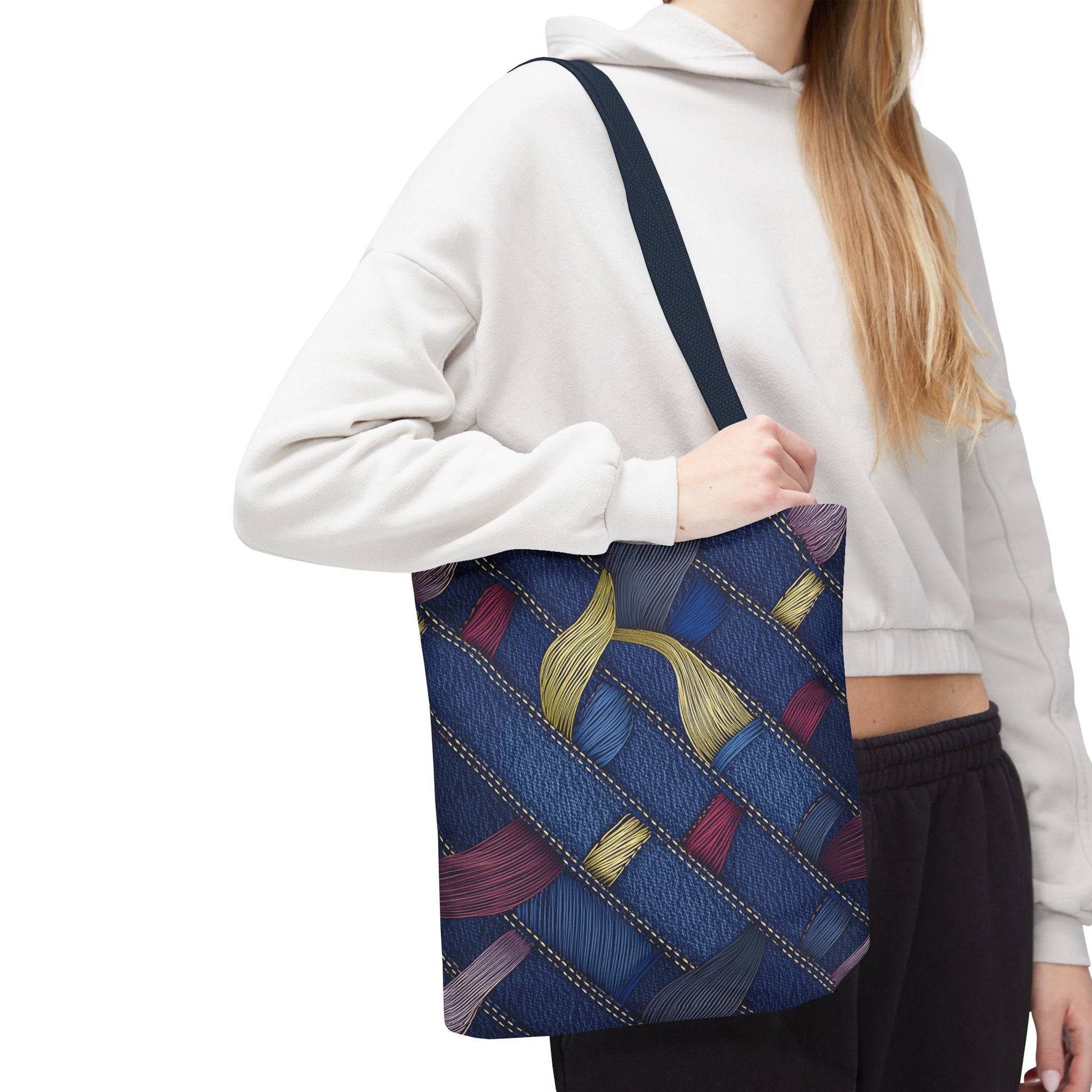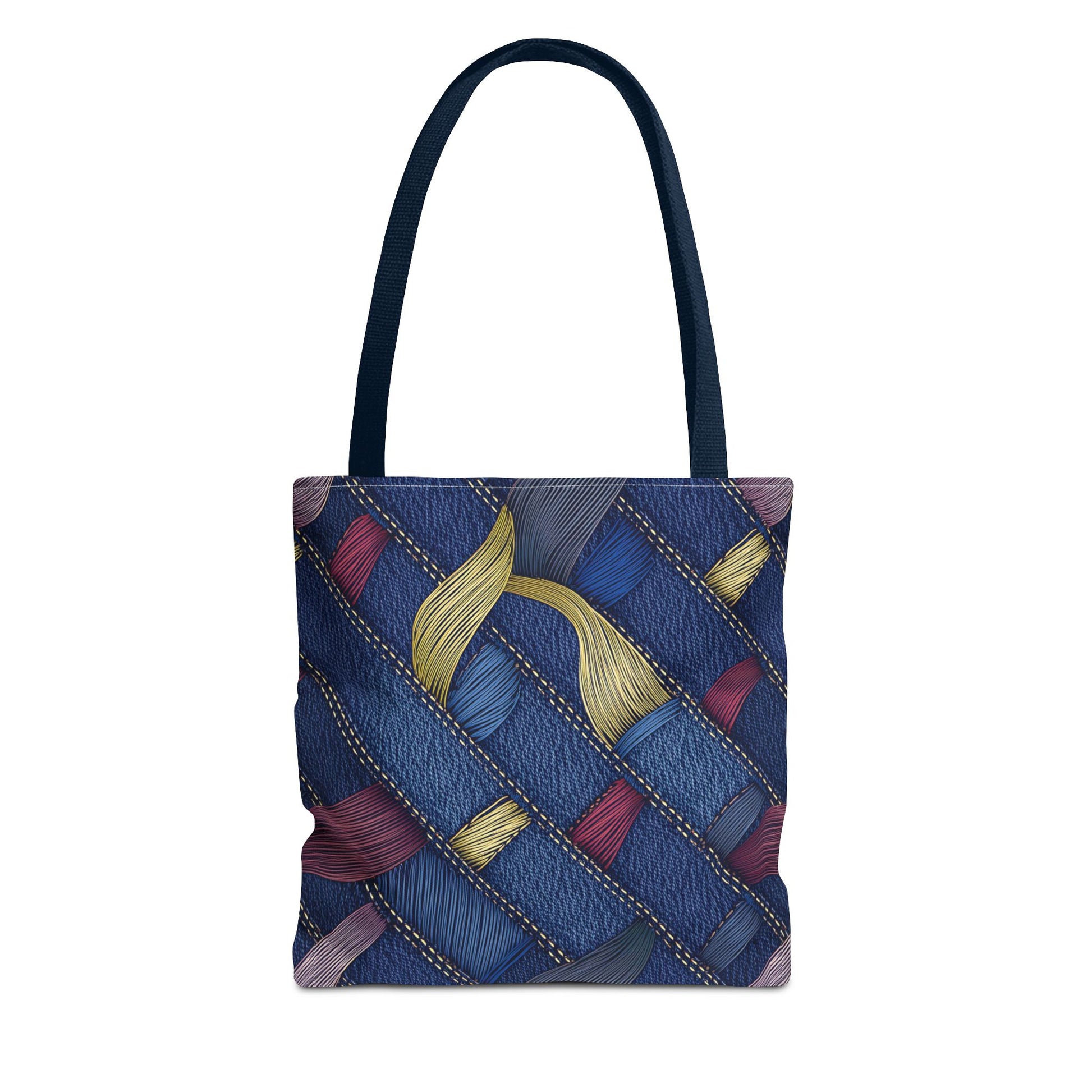 Denim Print Canvas Tote Bag – Elegant Poly Shoulder Bag - Enhance everyday functionality with timeless style in our Denim Print Canvas Tote Bag. Designed for versatility, this custom-printed tote is available in three convenient sizes and offers multiple handle color options to perfectly complement your look. Crafted from premium spun polyester, it delivers exceptional durability with double-stitched seams, sturdy cotton webbing straps, and a non-woven laminate interior.