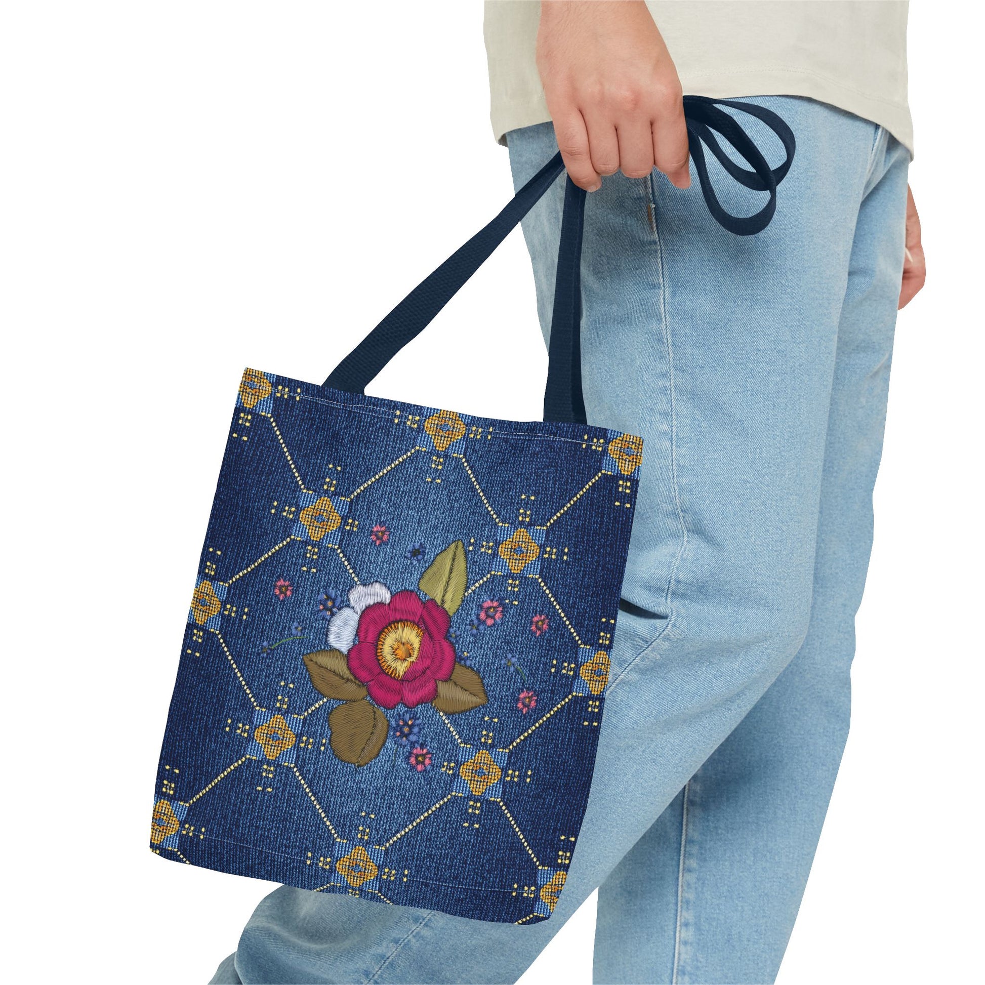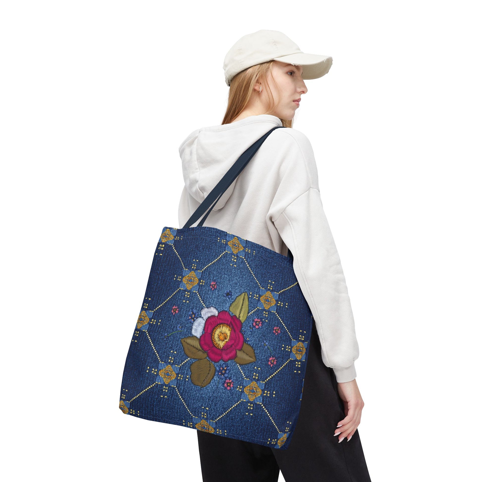 Denim Print Canvas Tote Bag – Elegant Poly Shoulder Bag - Enhance everyday functionality with timeless style in our Denim Print Canvas Tote Bag. Designed for versatility, this custom-printed tote is available in three convenient sizes and offers multiple handle color options to perfectly complement your look. Crafted from premium spun polyester, it delivers exceptional durability with double-stitched seams, sturdy cotton webbing straps, and a non-woven laminate interior.