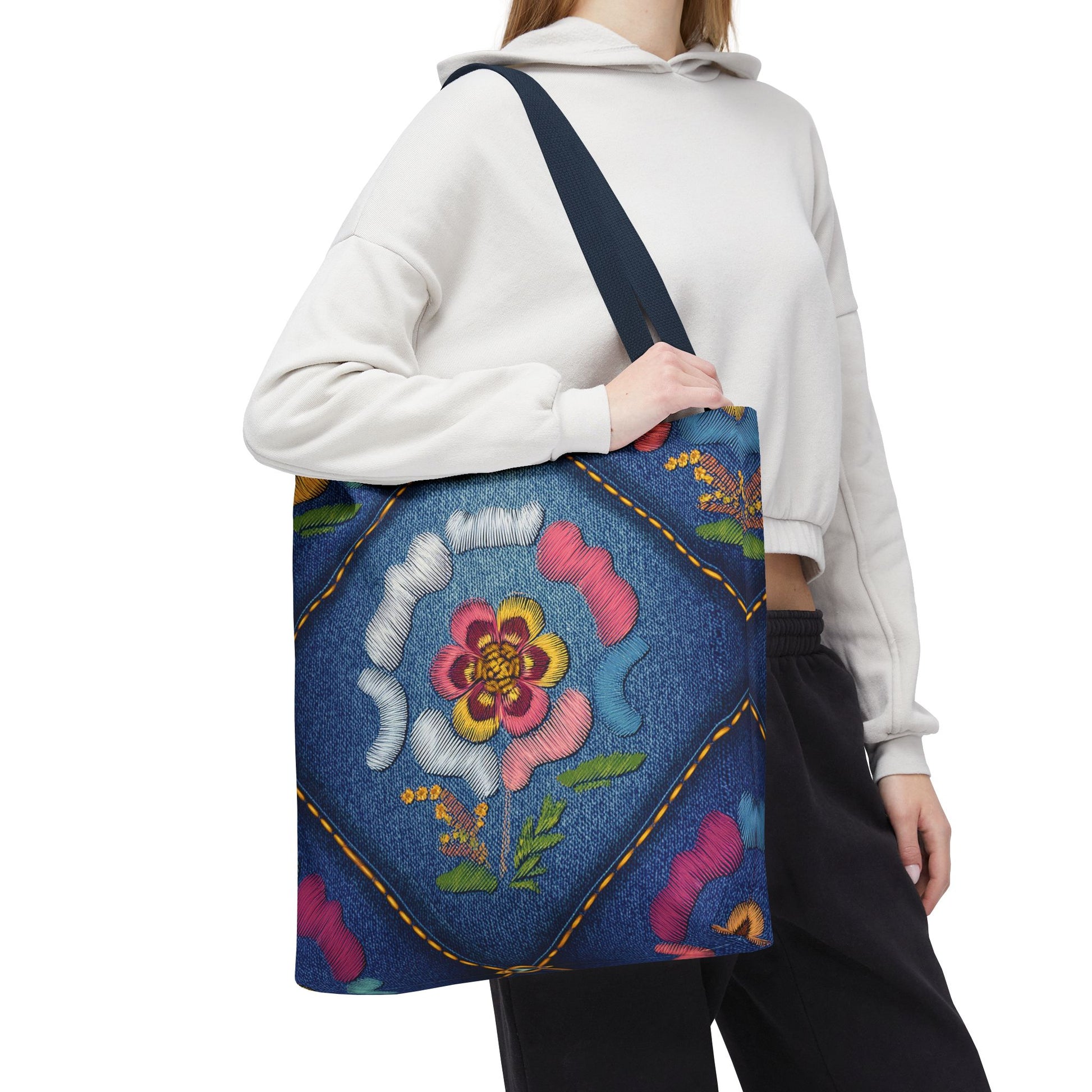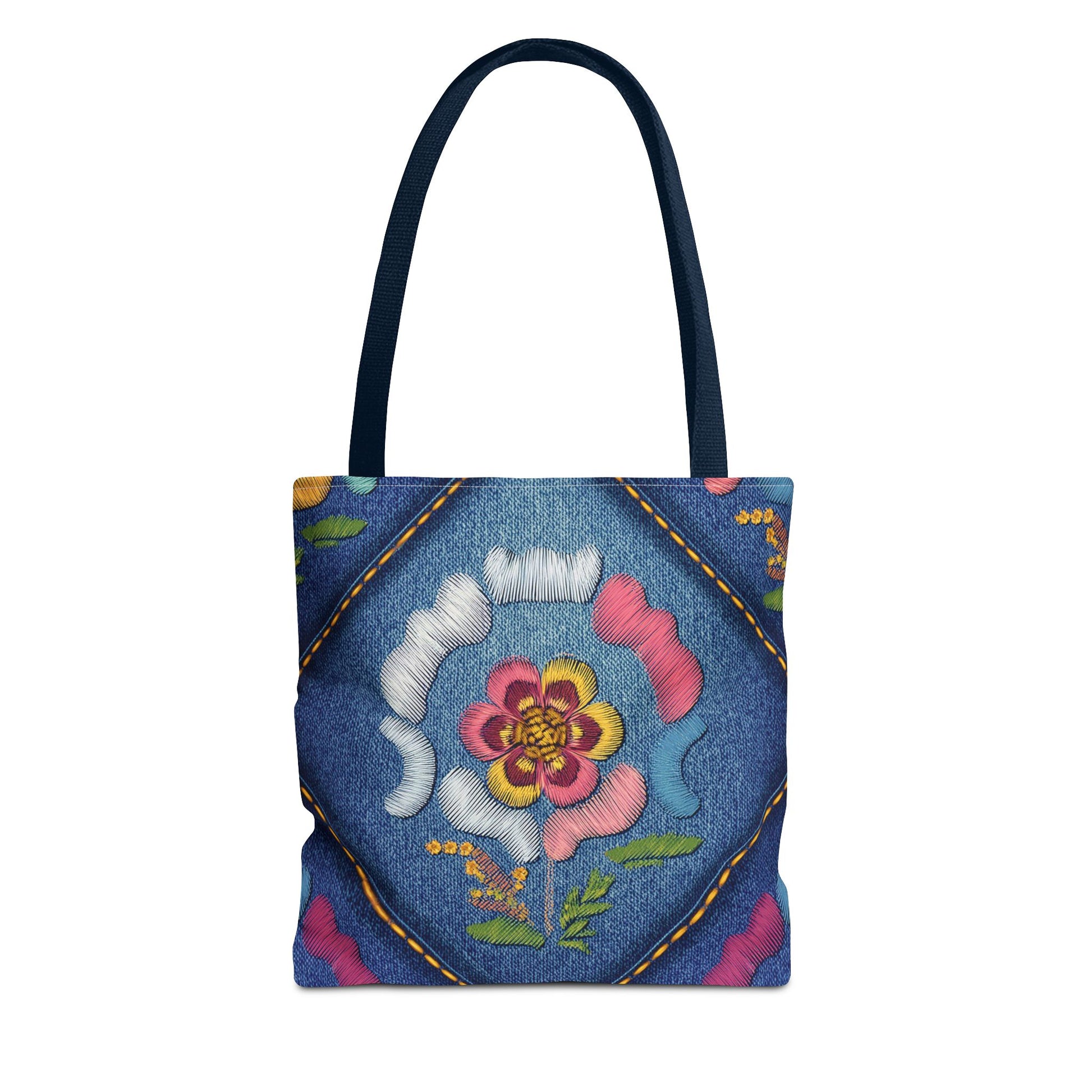 Denim Print Canvas Tote Bag – Elegant Poly Shoulder Bag - Enhance everyday functionality with timeless style in our Denim Print Canvas Tote Bag. Designed for versatility, this custom-printed tote is available in three convenient sizes and offers multiple handle color options to perfectly complement your look. Crafted from premium spun polyester, it delivers exceptional durability with double-stitched seams, sturdy cotton webbing straps, and a non-woven laminate interior.