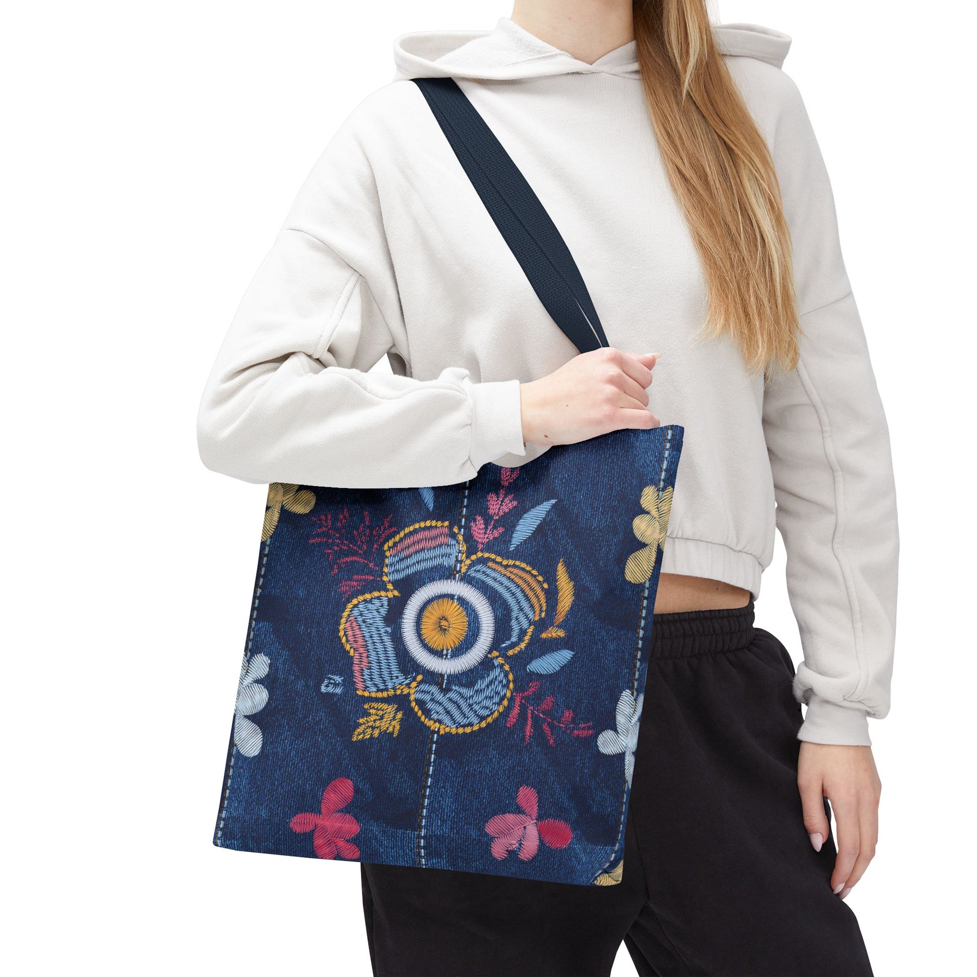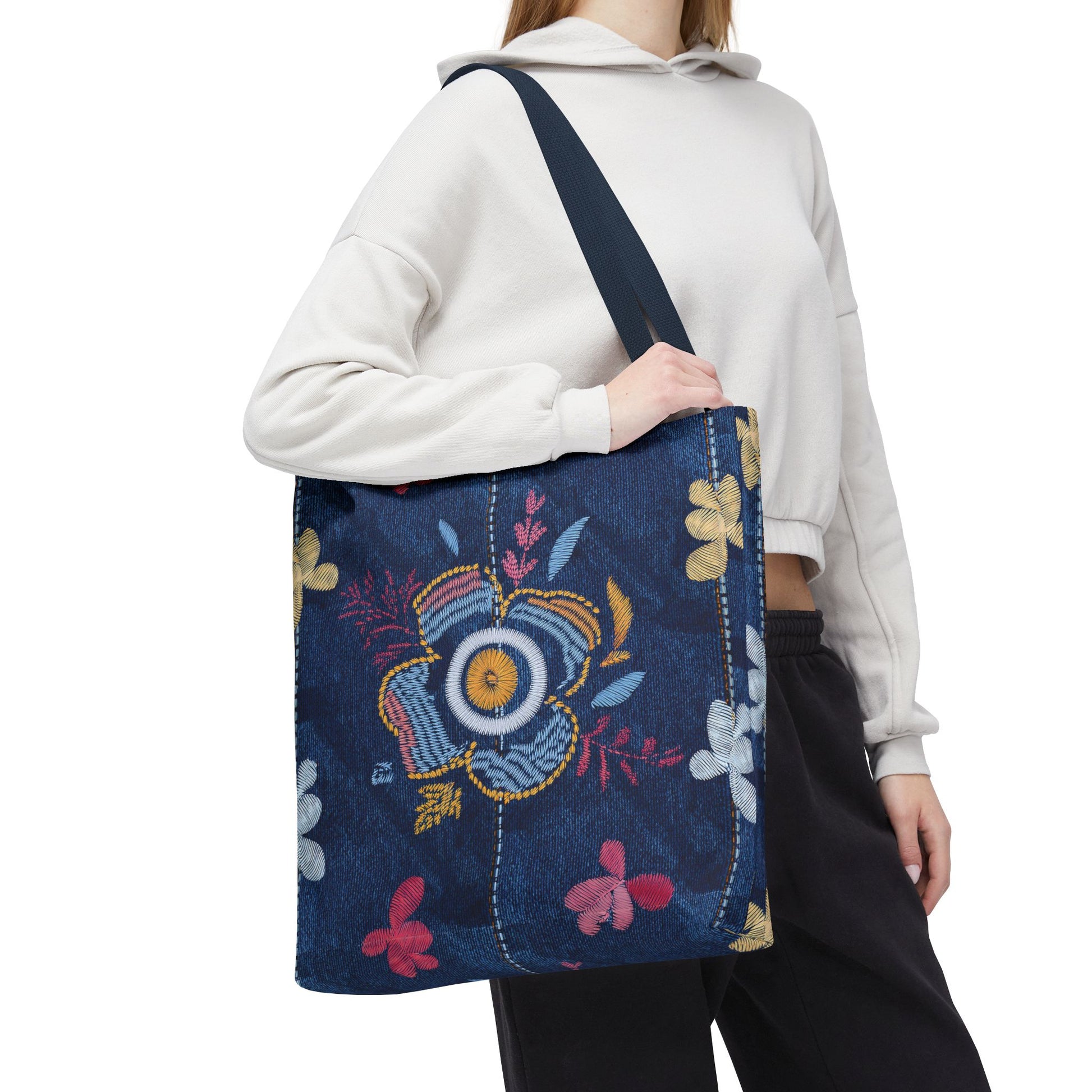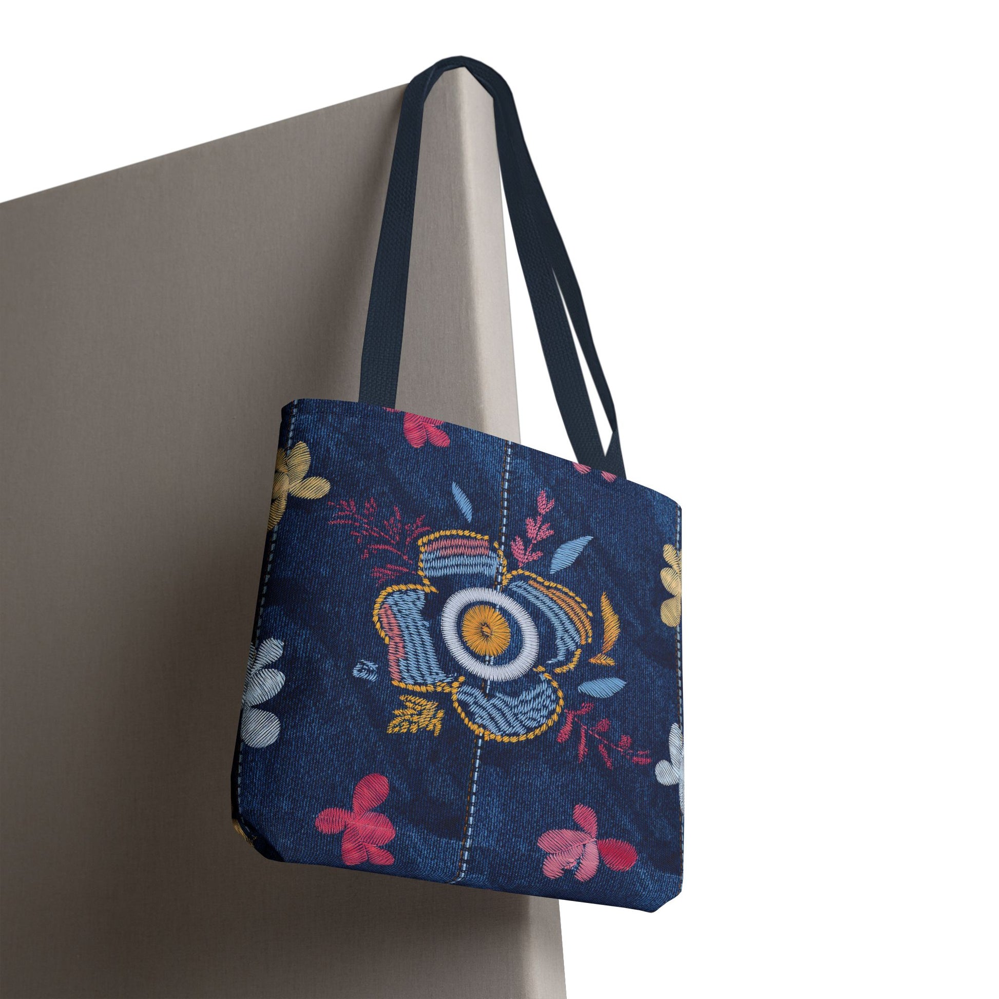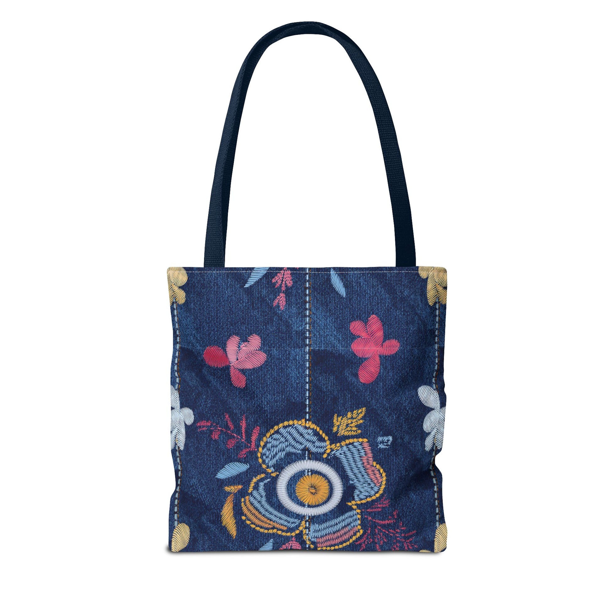 Denim Print Canvas Tote Bag – Elegant Poly Shoulder Bag - Enhance everyday functionality with timeless style in our Denim Print Canvas Tote Bag. Designed for versatility, this custom-printed tote is available in three convenient sizes and offers multiple handle color options to perfectly complement your look. Crafted from premium spun polyester, it delivers exceptional durability with double-stitched seams, sturdy cotton webbing straps, and a non-woven laminate interior.