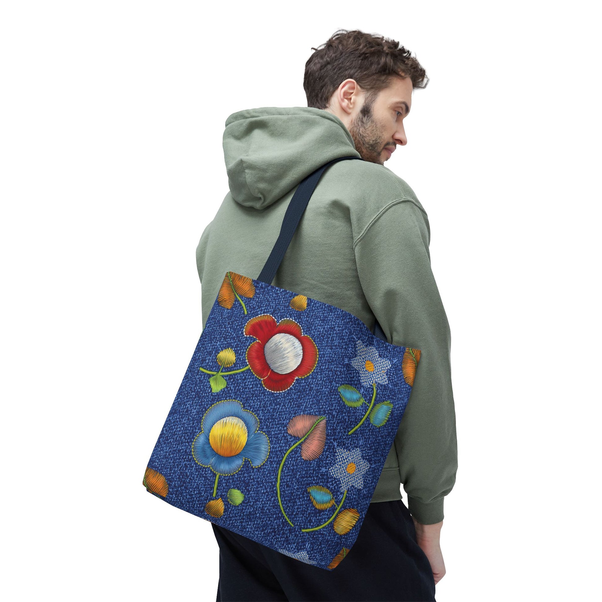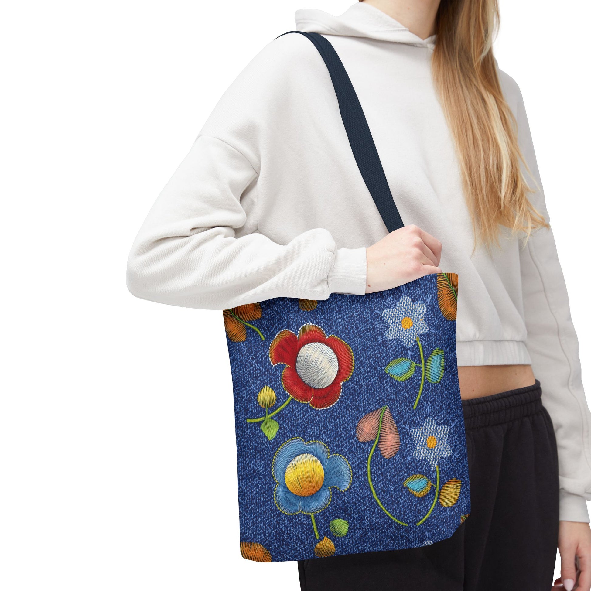 Denim Print Canvas Tote Bag – Elegant Poly Shoulder Bag - Enhance everyday functionality with timeless style in our Denim Print Canvas Tote Bag. Designed for versatility, this custom-printed tote is available in three convenient sizes and offers multiple handle color options to perfectly complement your look. Crafted from premium spun polyester, it delivers exceptional durability with double-stitched seams, sturdy cotton webbing straps, and a non-woven laminate interior.