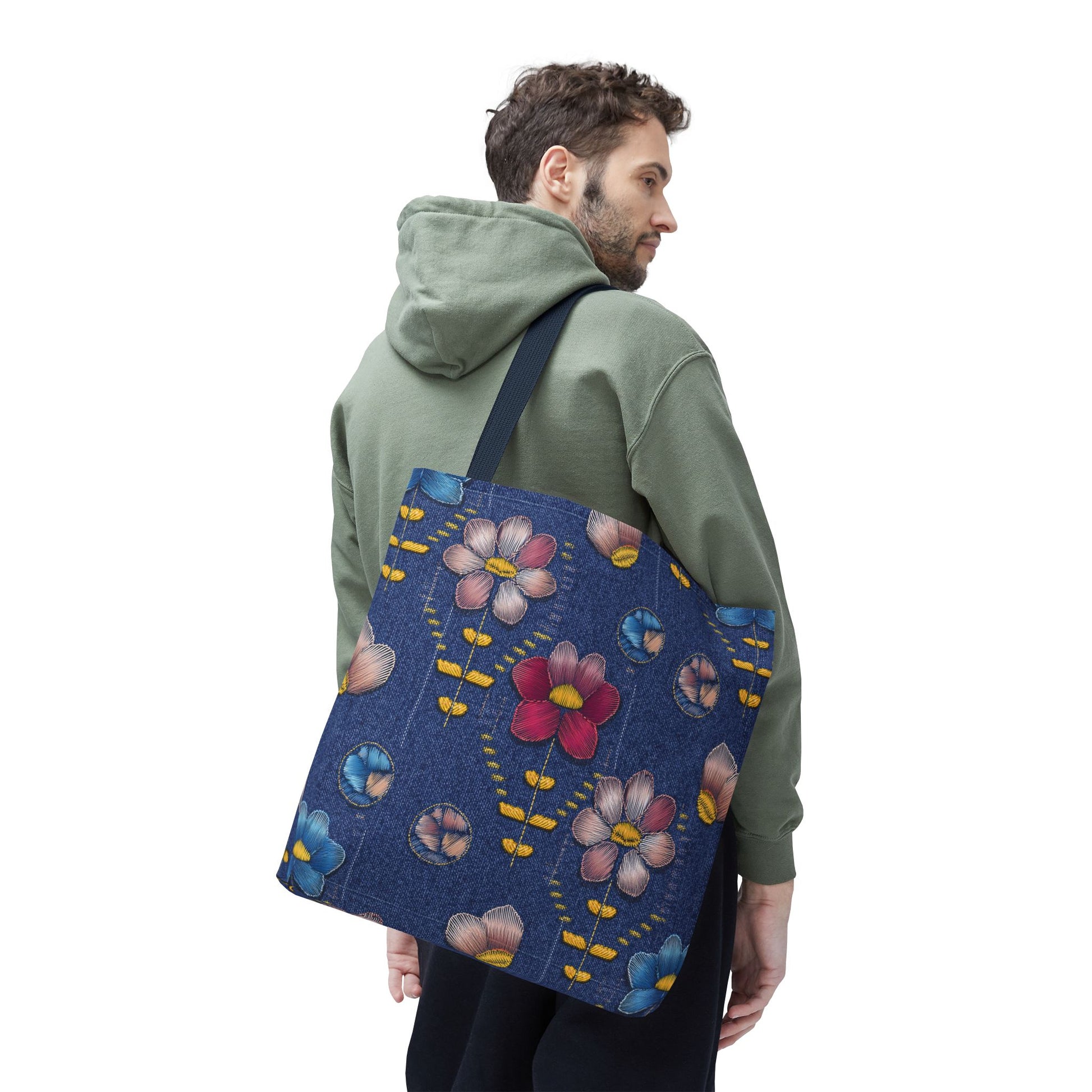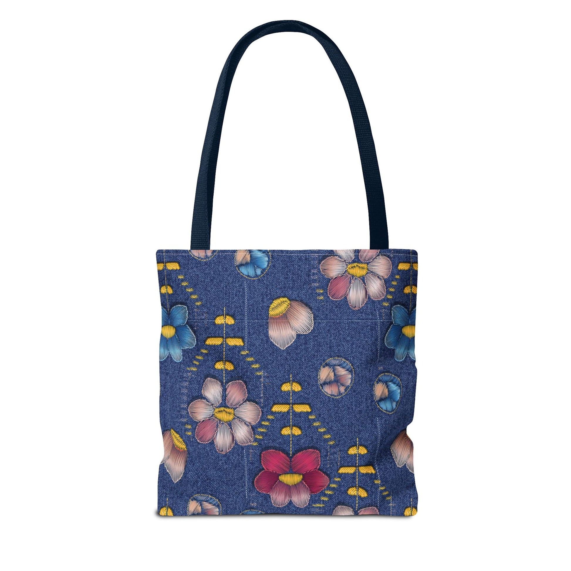 Denim Print Canvas Tote Bag – Elegant Poly Shoulder Bag - Enhance everyday functionality with timeless style in our Denim Print Canvas Tote Bag. Designed for versatility, this custom-printed tote is available in three convenient sizes and offers multiple handle color options to perfectly complement your look. Crafted from premium spun polyester, it delivers exceptional durability with double-stitched seams, sturdy cotton webbing straps, and a non-woven laminate interior.