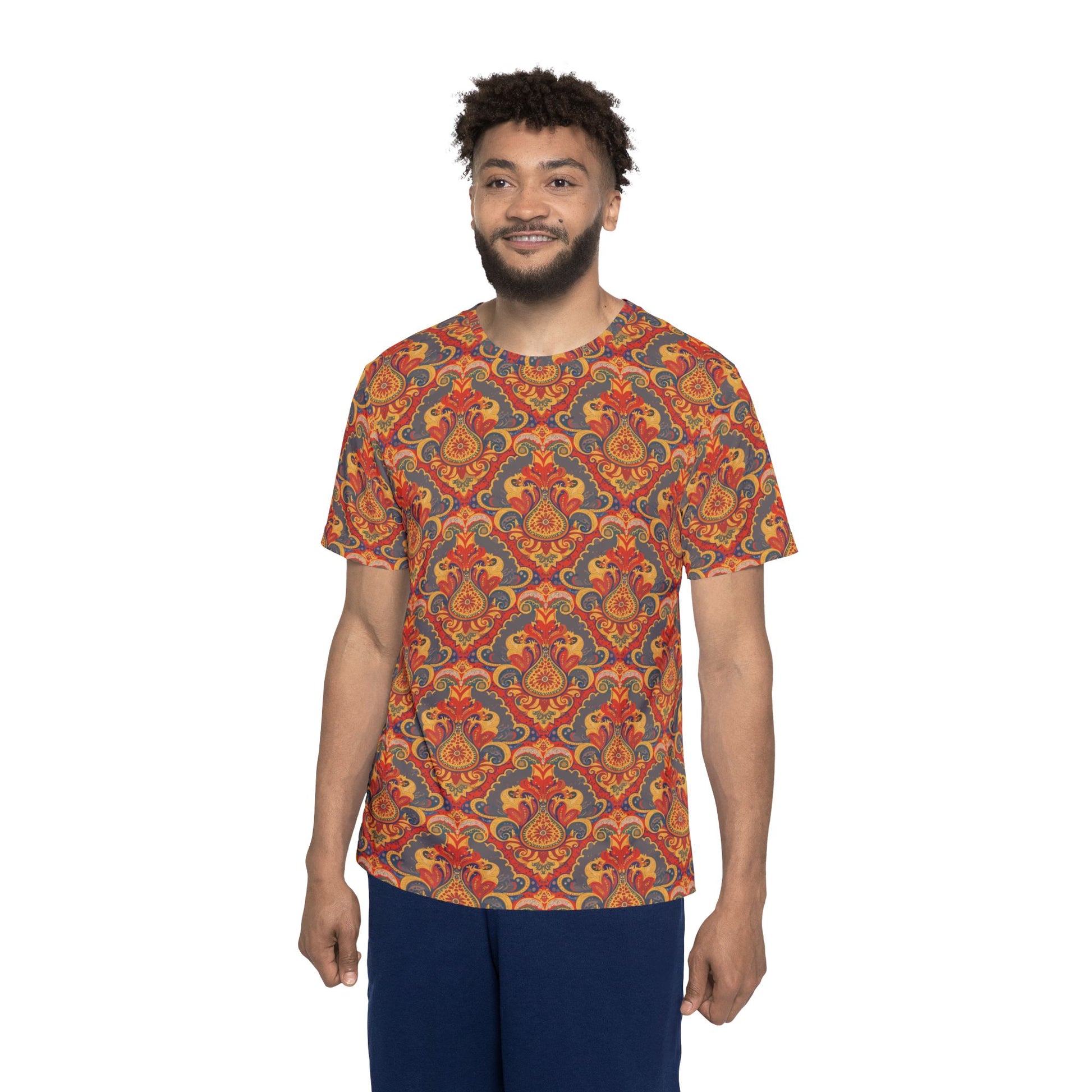 Unisex Ornament Shirt, Shirt with Ornament – Made from 100% moisture-wicking performance polyester, this extra-light fabric (4.13 oz/yd²) ensures breathability and comfort. Designed for active lifestyles, its stretchy, durable material provides both style and performance. Featuring a unique all-over print, this nature-inspired jersey offers a bold, timeless look. This Poly Tee combines fashion and function, making it the perfect choice for any adventure or workout.