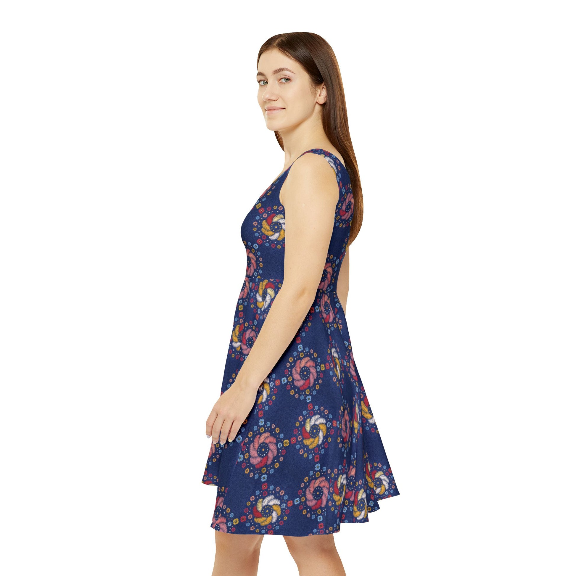 Designed for movement and comfort, this mid-length skater dress features a soft polyester-spandex blend with a high scoop neckline and an asymmetrical skirt that flows with every step. Durable double-needle stitching and vibrant dye-sublimation printing ensure long-lasting shape and color.