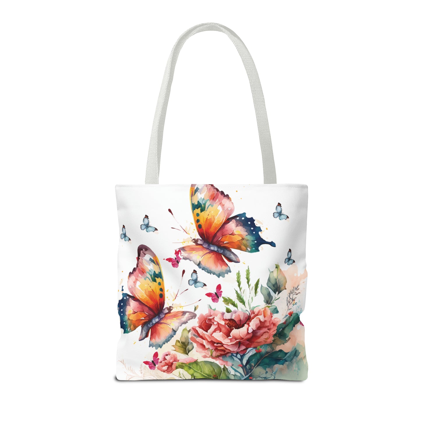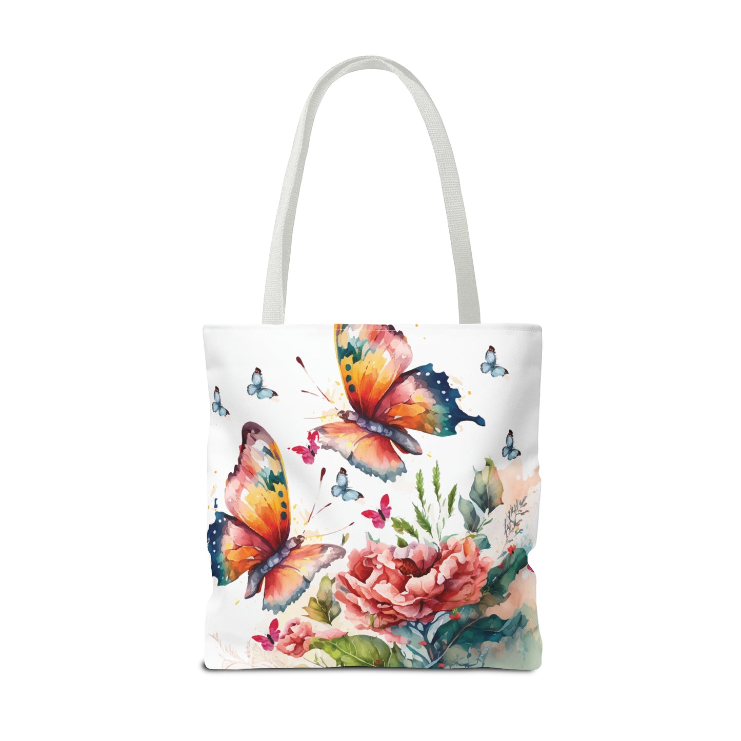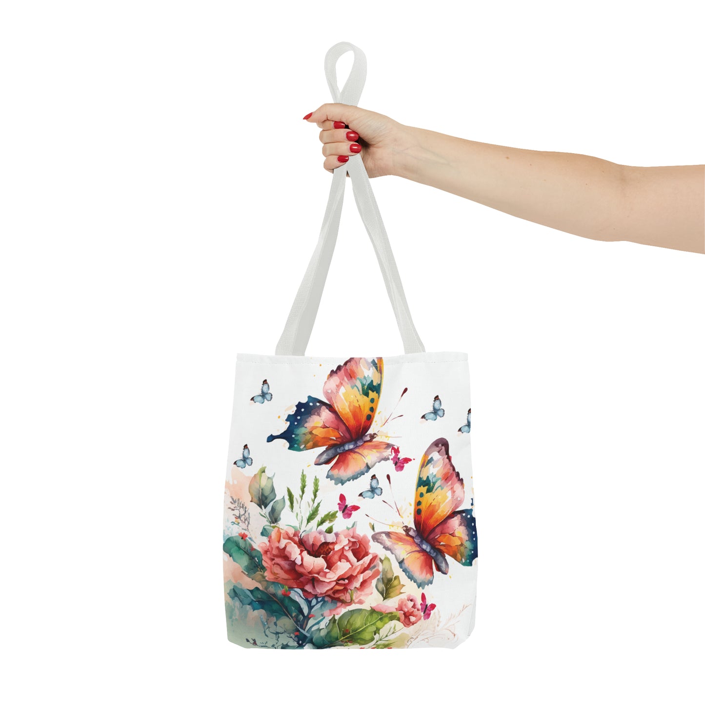 Butterfly Canvas Tote - Elegant Poly Shoulder Bag Enhance both functionality and style with our beautiful bags, available in three sizes. These custom-printed bags offer versatility with multiple handle colors to complement your outfit. Crafted from spun polyester, these bags boast high-end durability with double-stitched seams, cotton webbing straps, and a nonwoven laminate lining.