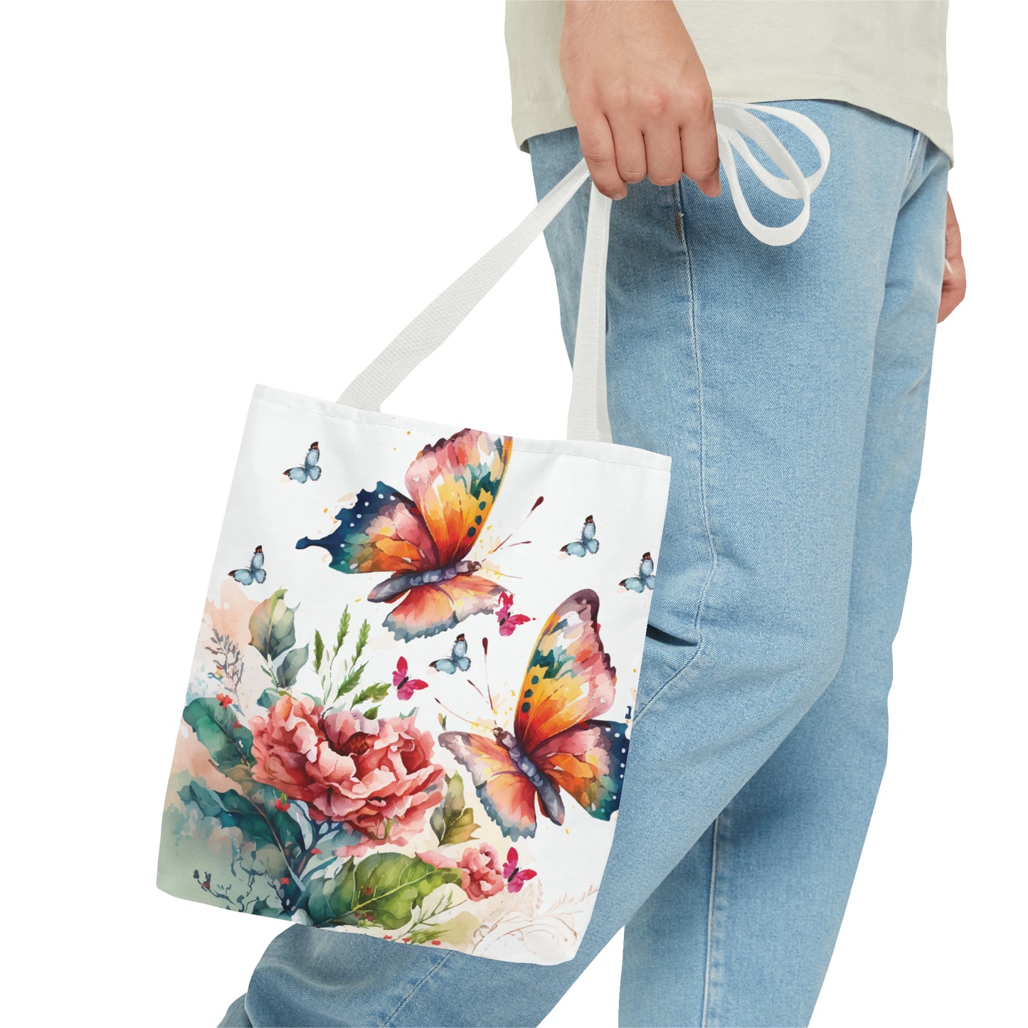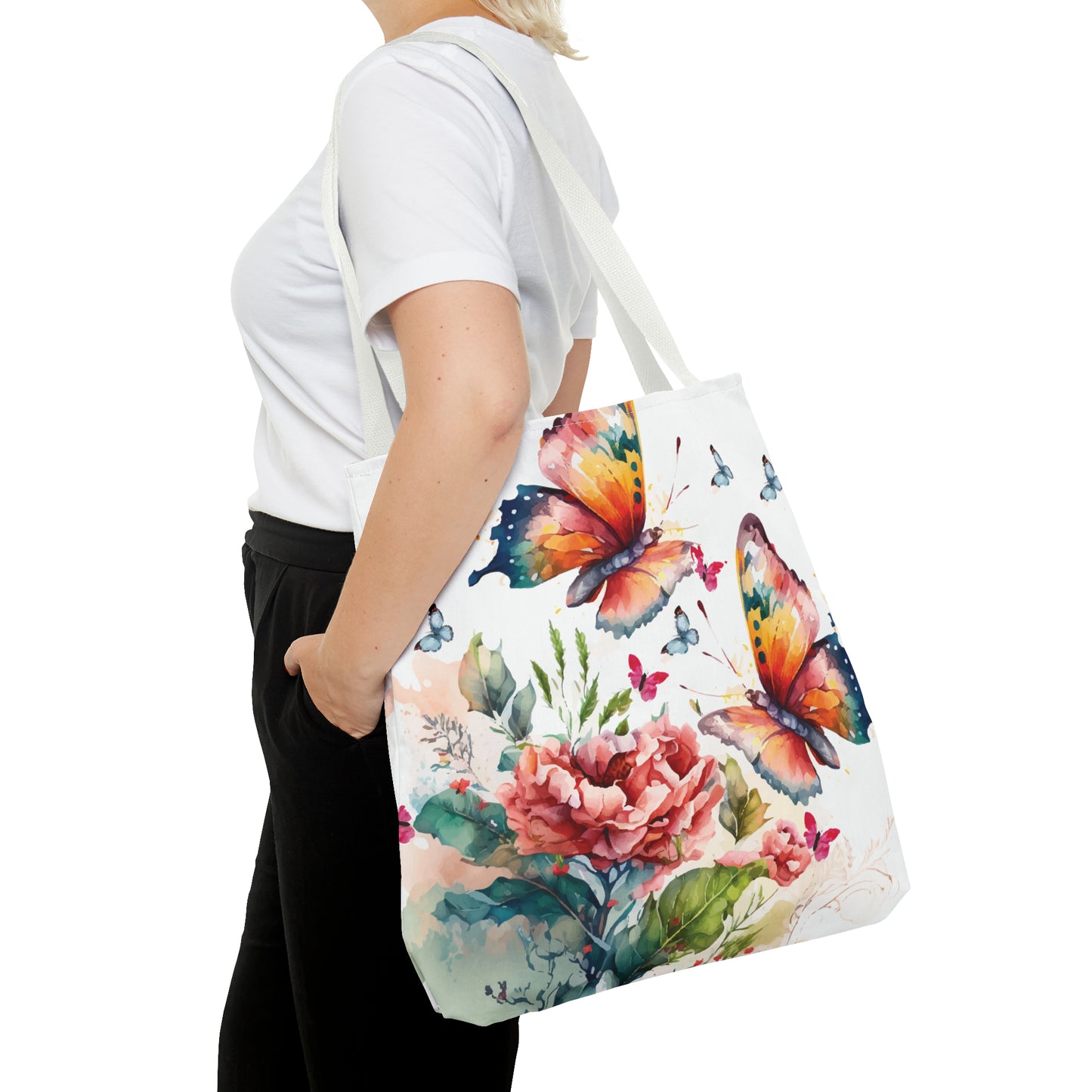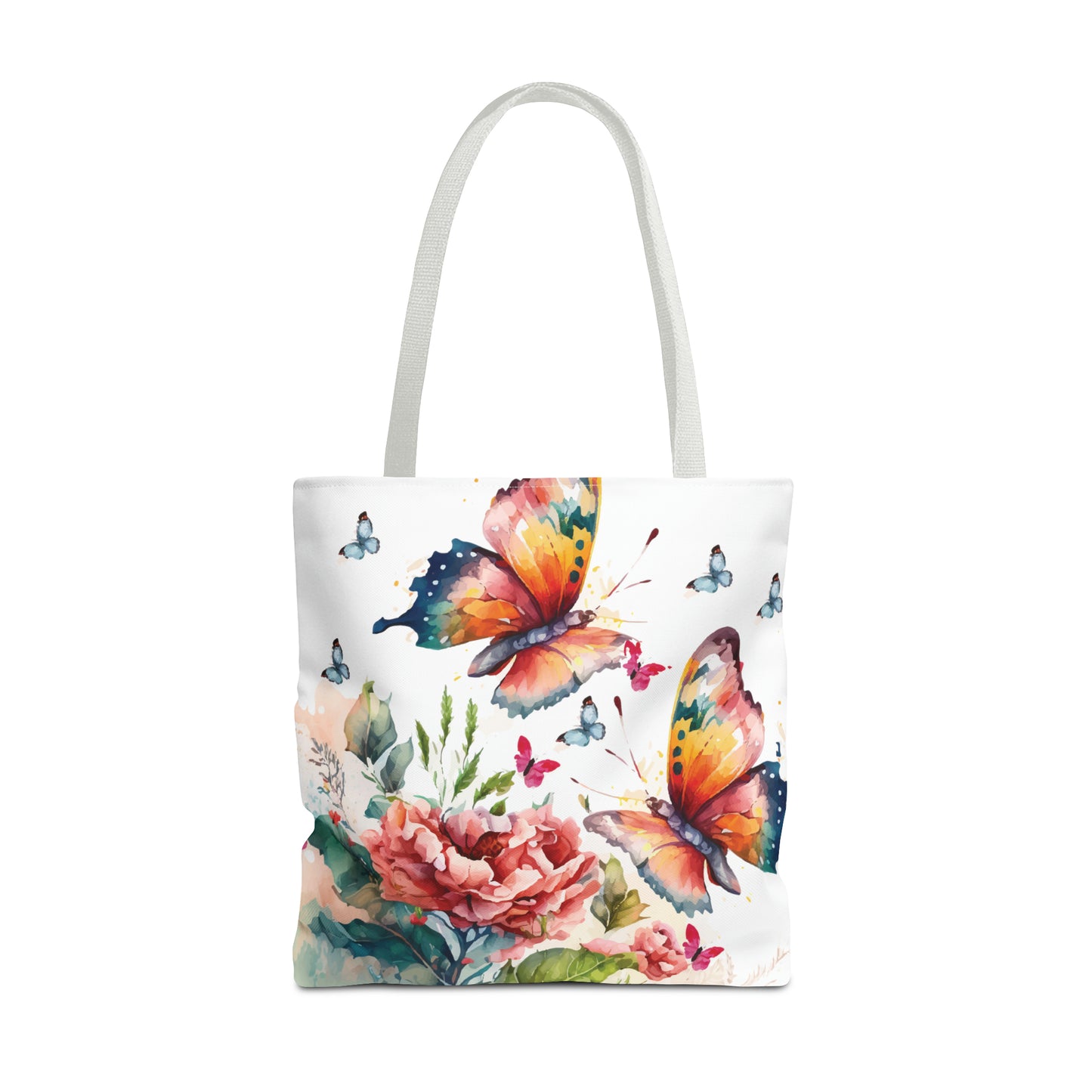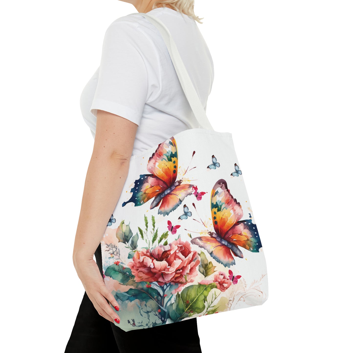 Butterfly Canvas Tote - Elegant Poly Shoulder Bag Enhance both functionality and style with our beautiful bags, available in three sizes. These custom-printed bags offer versatility with multiple handle colors to complement your outfit. Crafted from spun polyester, these bags boast high-end durability with double-stitched seams, cotton webbing straps, and a nonwoven laminate lining.
