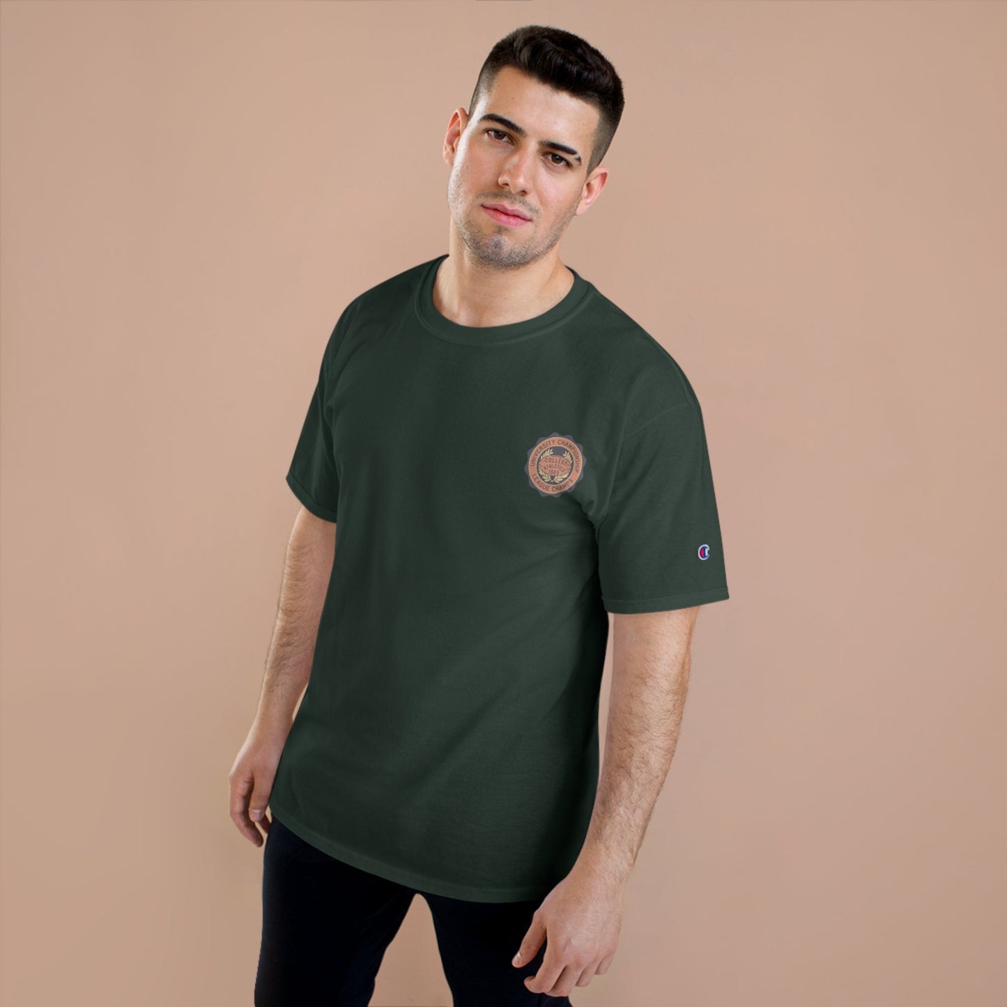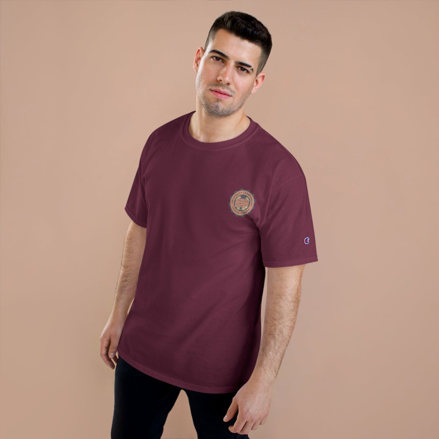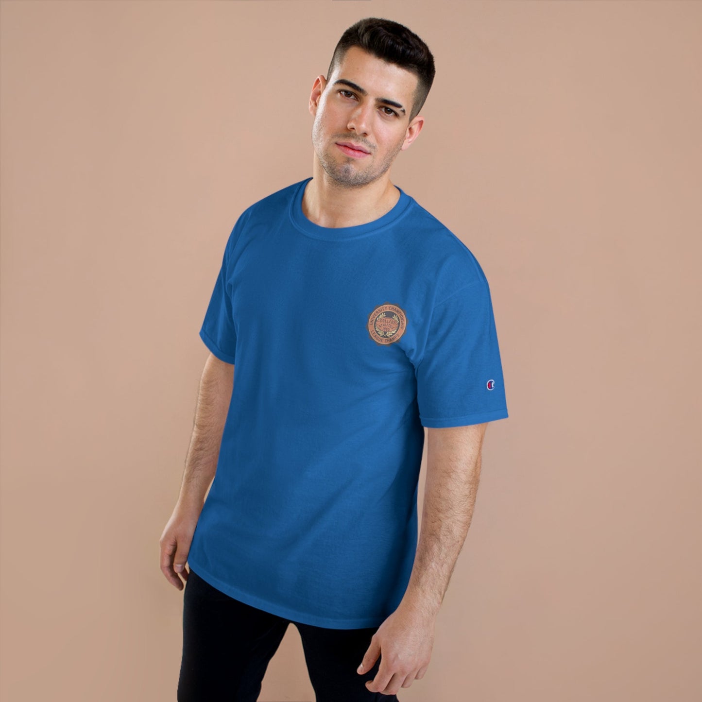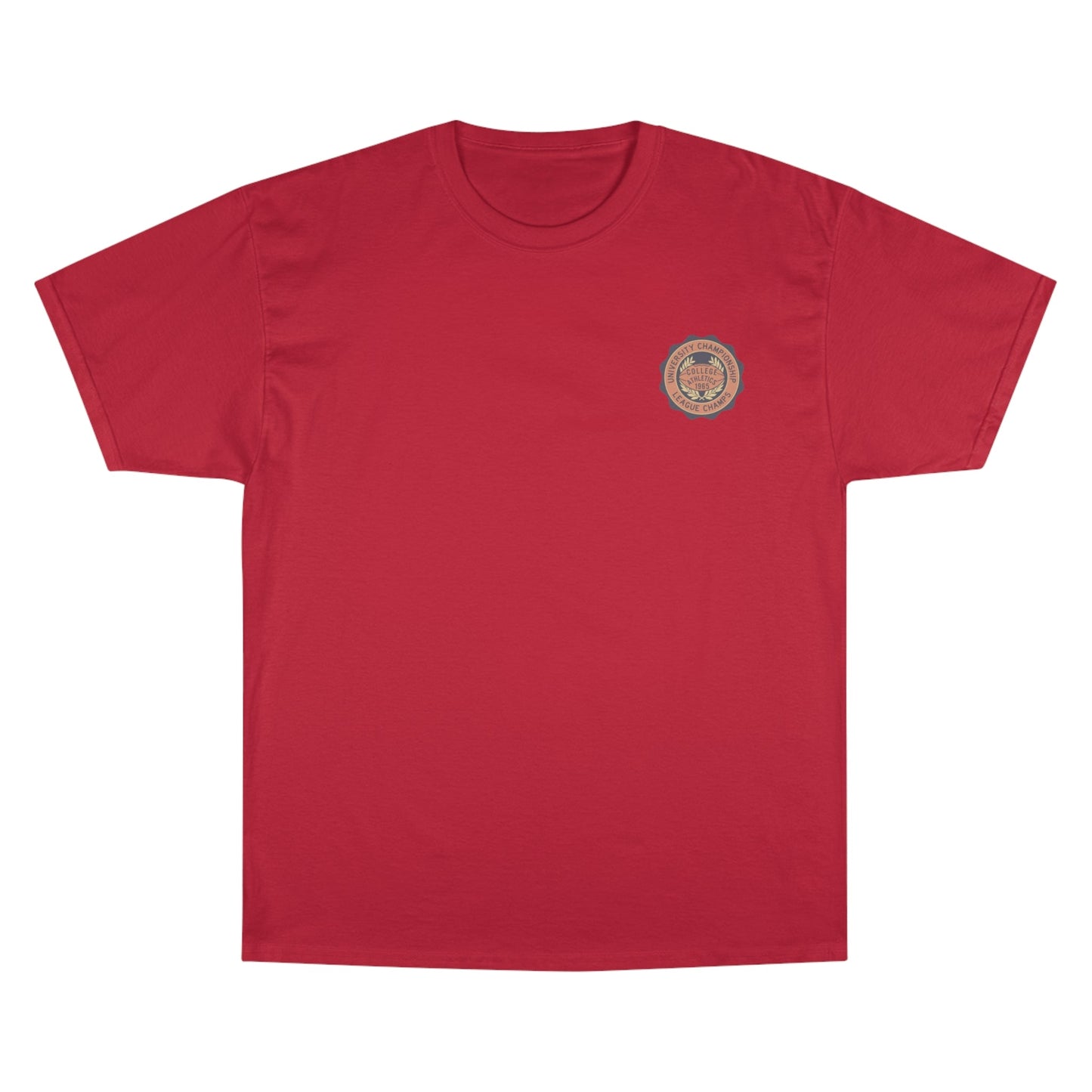 Champion Logo Shirt- Fit Information: The relaxed fit keeps the wearer comfy in both casual and semi-formal settings while the crew neckline delivers that classic, neat style which makes it perfect for accessorizing.