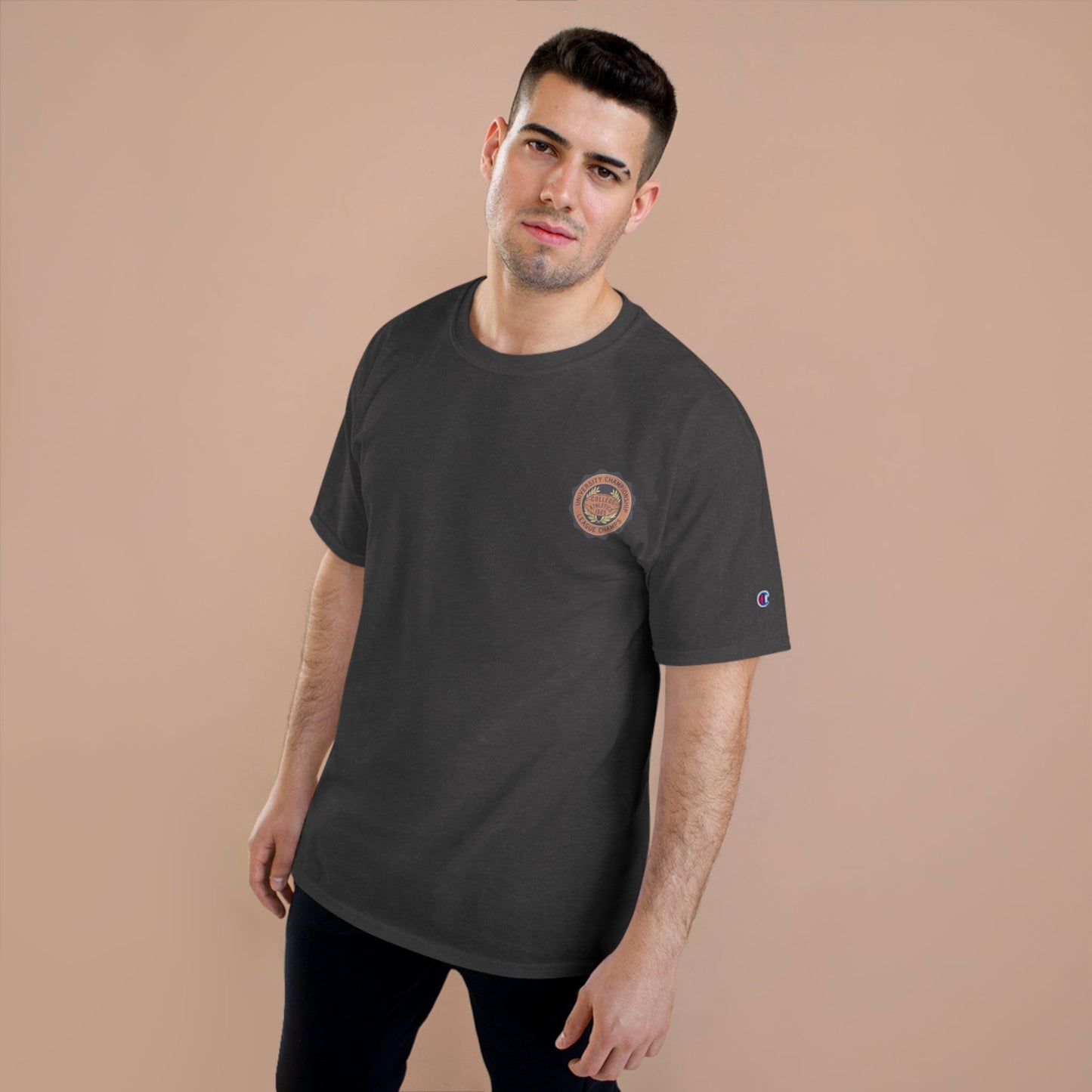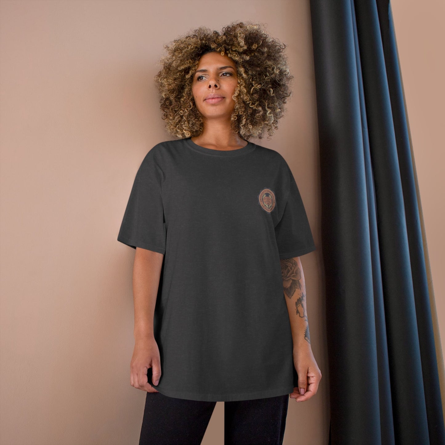 Champion Logo Shirt - Champion brand shirt made using 100% US cotton that is ethically grown and harvested medium fabric (6.1 oz/yd² (206.8 g/m²)). The heritage brand known for quality, short-sleeve unisex t-shirt. This Champion t-shirt has the iconic Champion "C" logo on the left sleeve and no tag on the neck label.