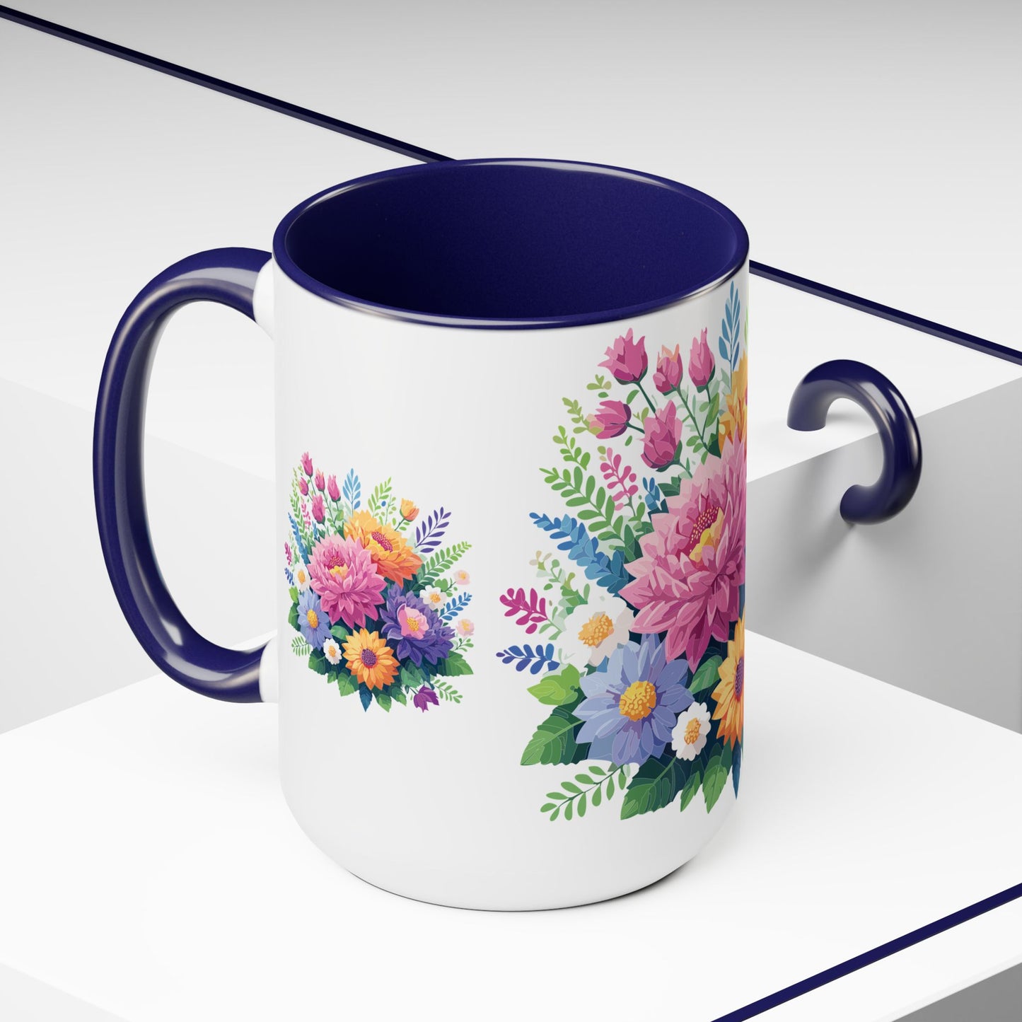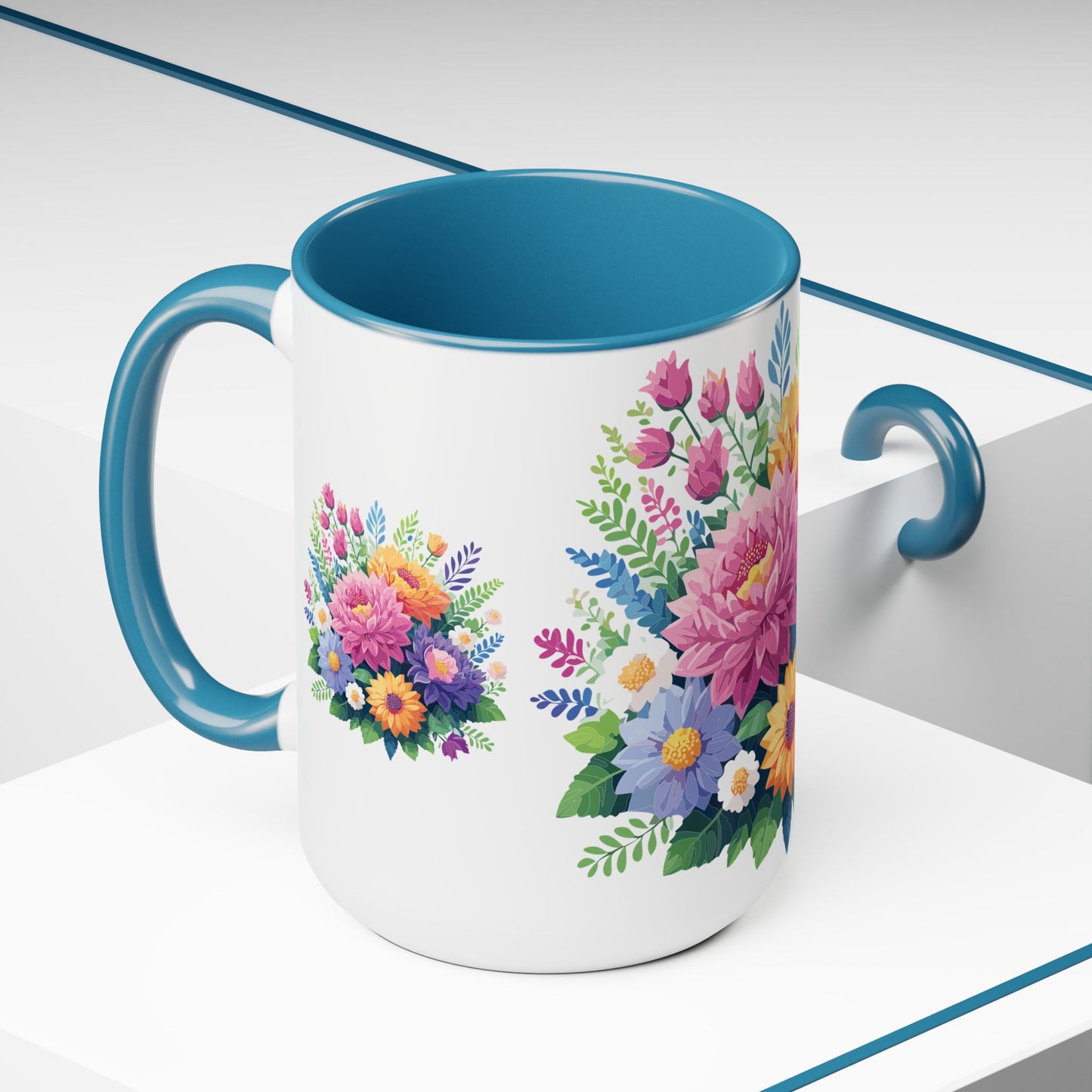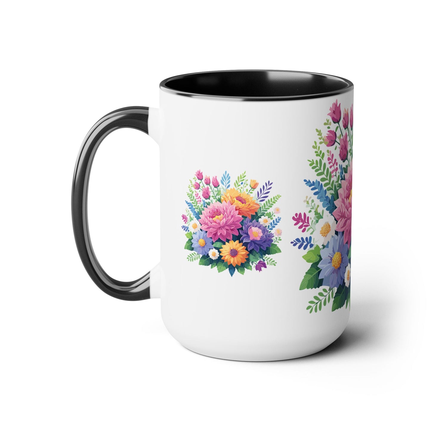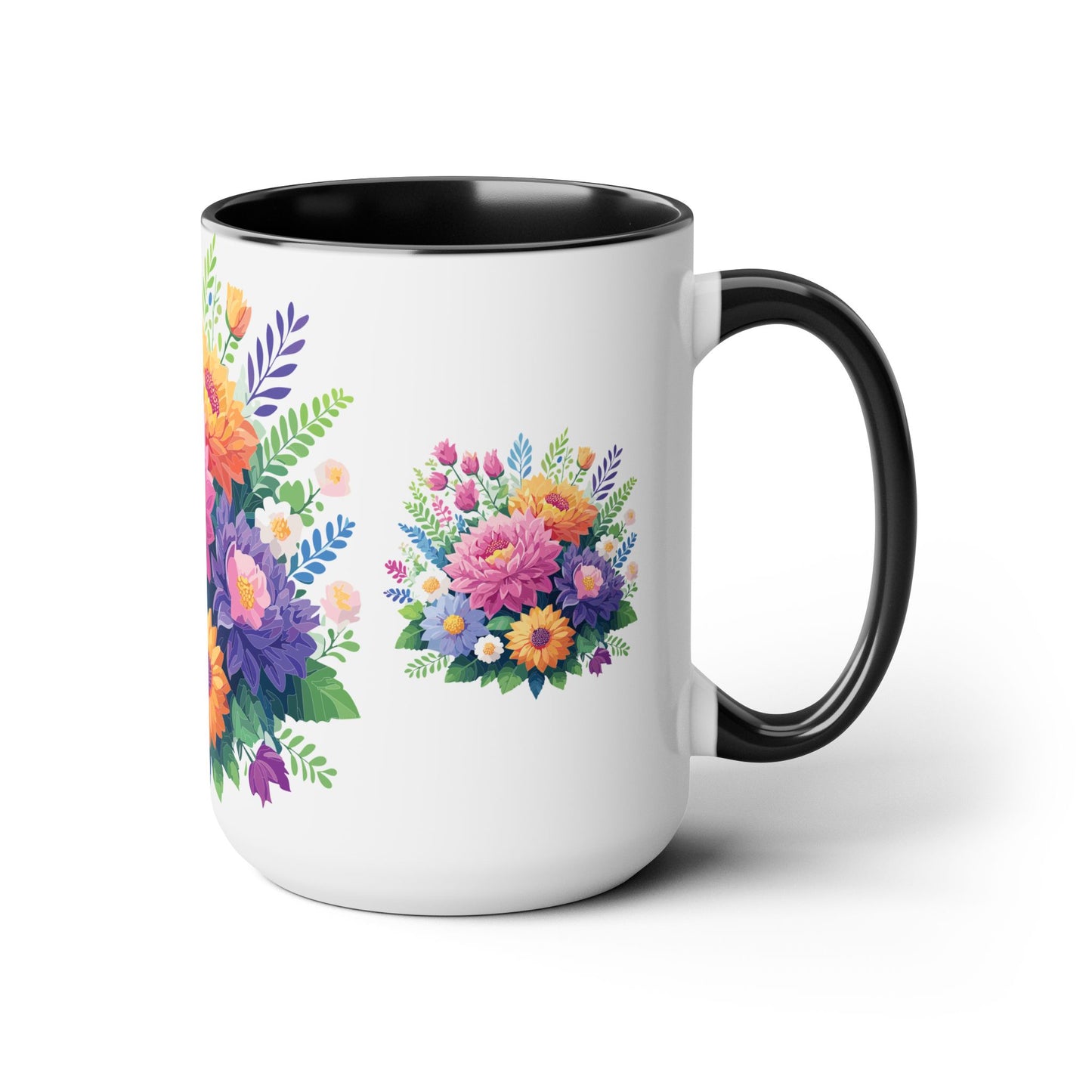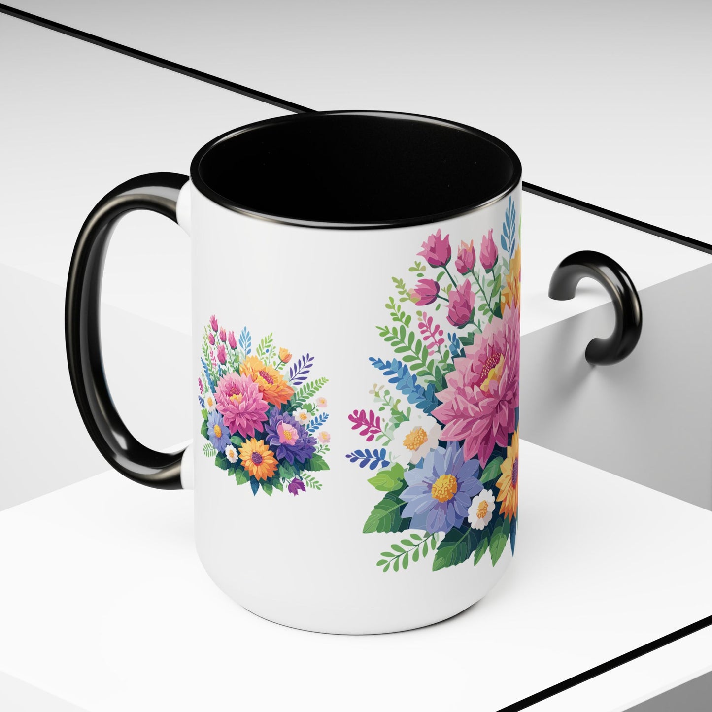 Floral Mug, Floral Cup – This 15oz two-tone coffee mug is crafted from white ceramic with a sleek glossy finish and striking color contrast. Designed for both style and comfort, it features an ergonomic C-shaped handle for a secure grip. Lead and BPA-free, it ensures safe sipping every time. Combining elegance and practicality, this mug is the perfect companion for elevating your daily coffee or tea experience.