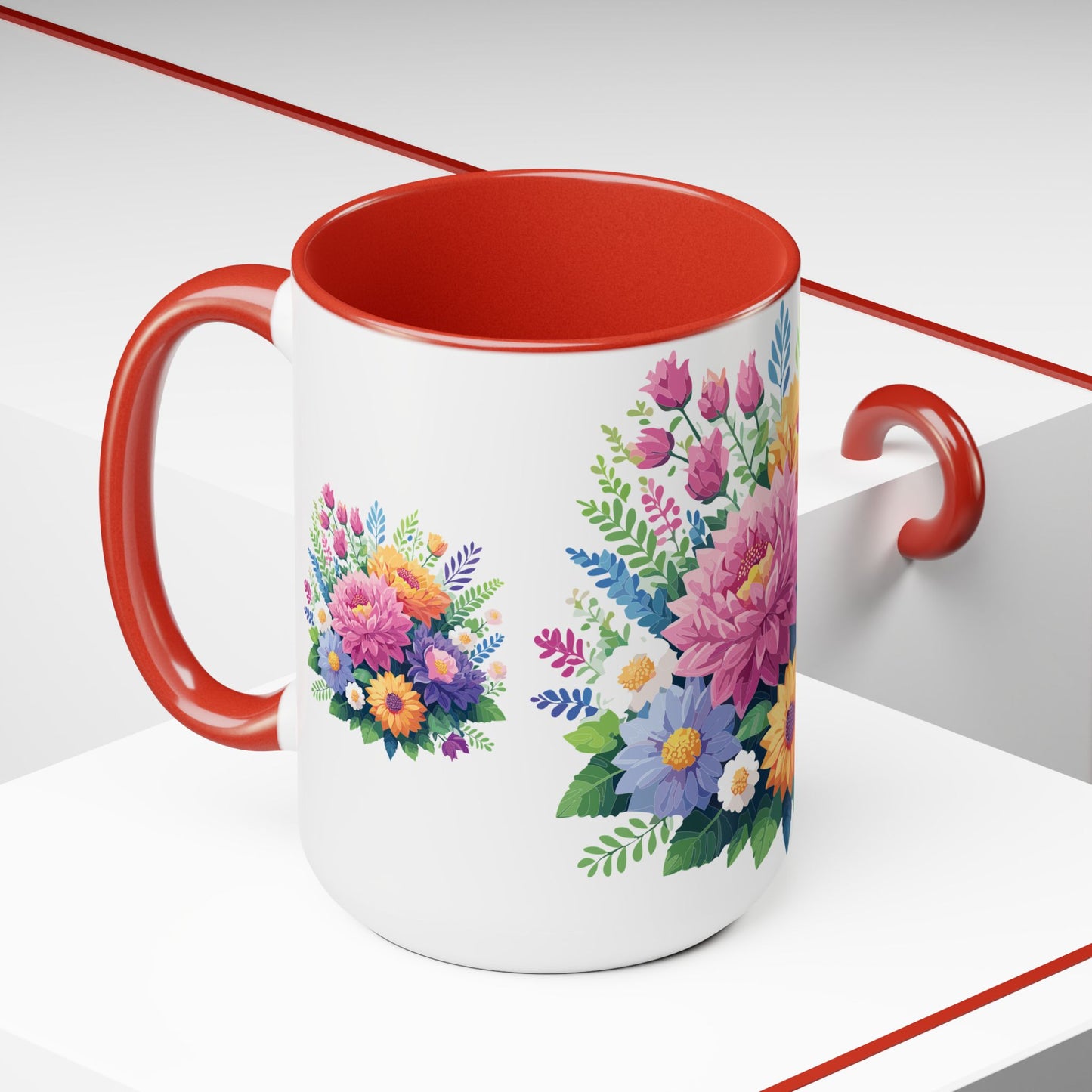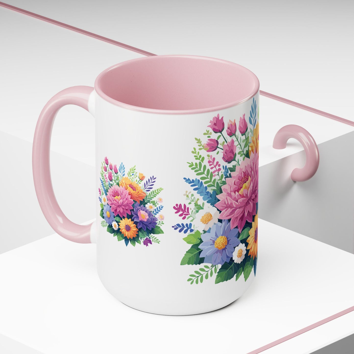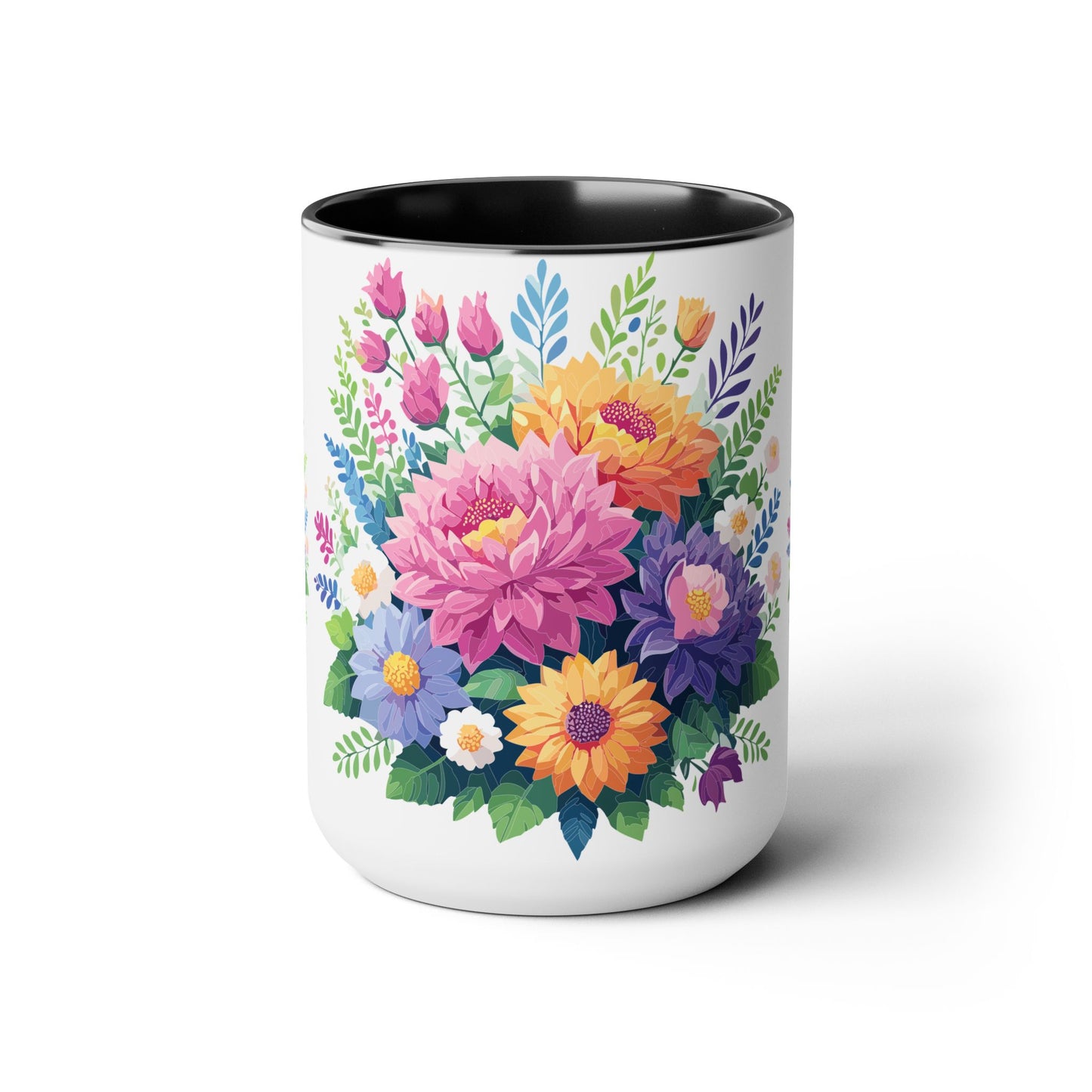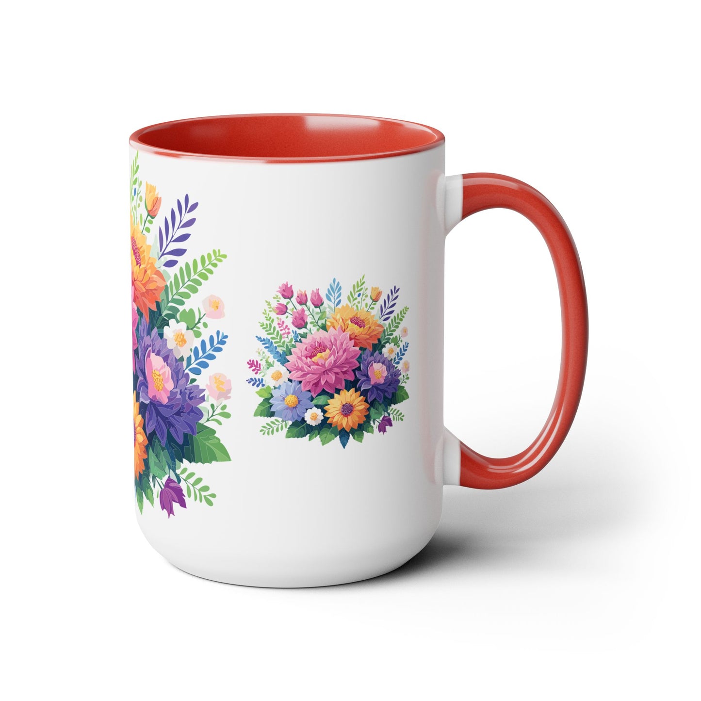 Floral Mug, Floral Cup – This 15oz two-tone coffee mug is crafted from white ceramic with a sleek glossy finish and striking color contrast. Designed for both style and comfort, it features an ergonomic C-shaped handle for a secure grip. Lead and BPA-free, it ensures safe sipping every time. Combining elegance and practicality, this mug is the perfect companion for elevating your daily coffee or tea experience.