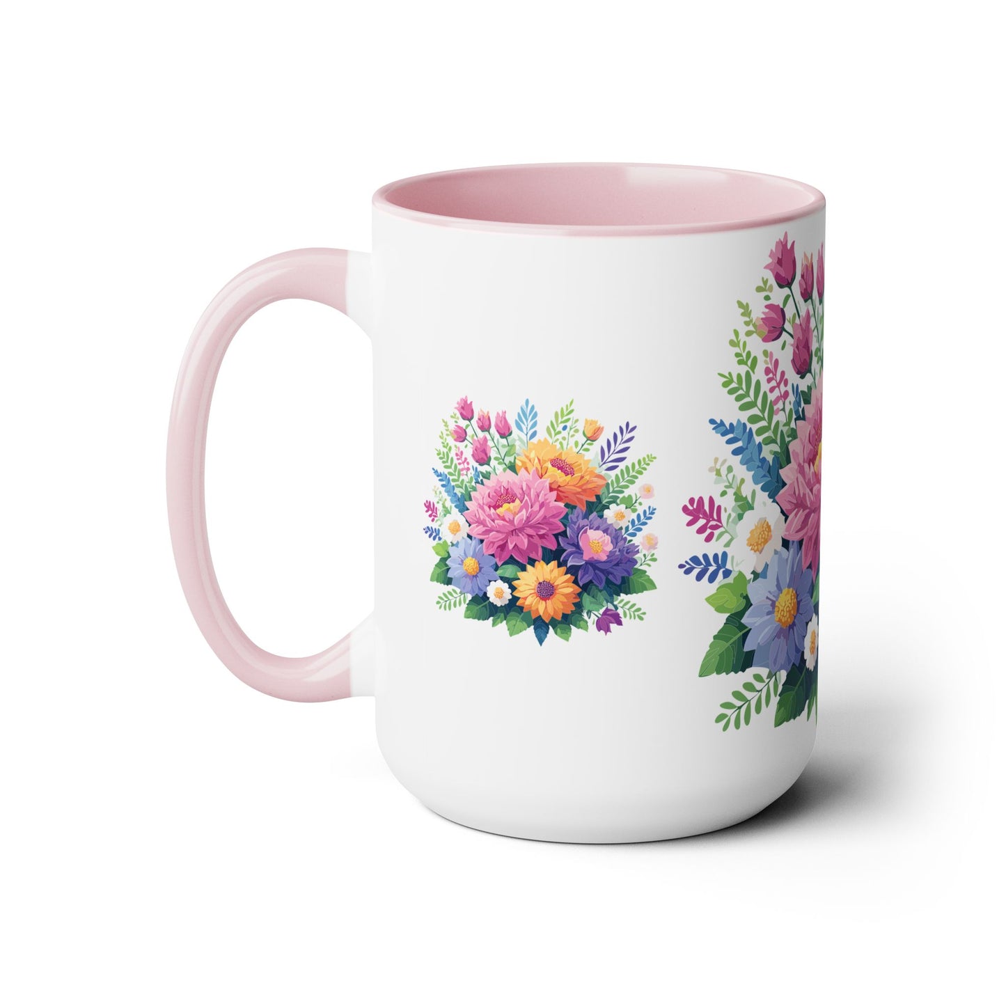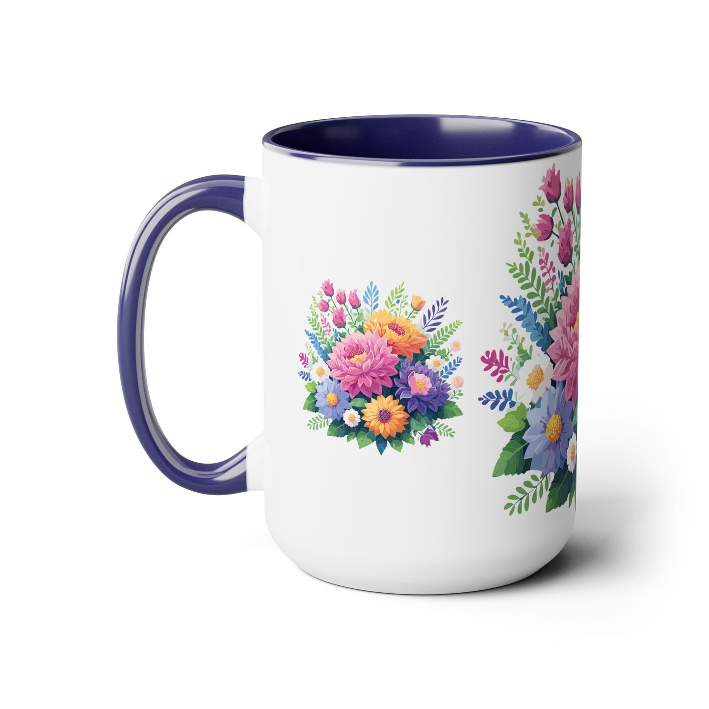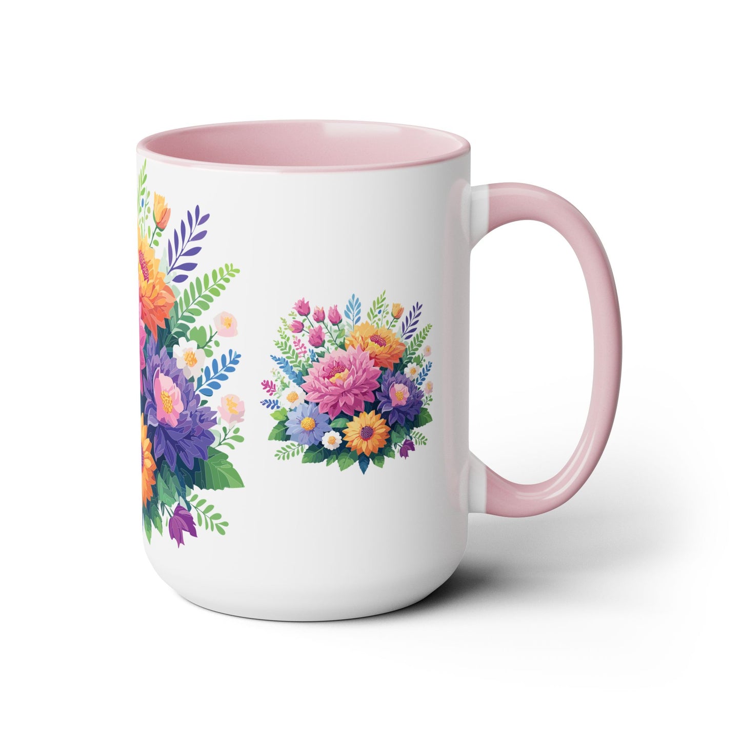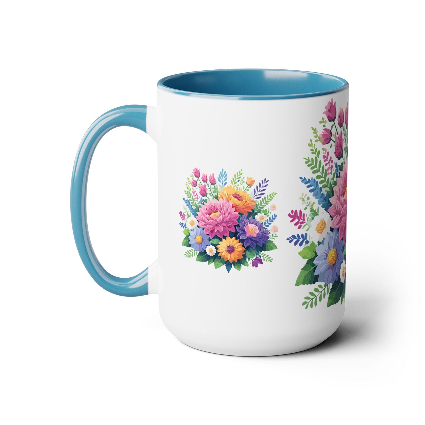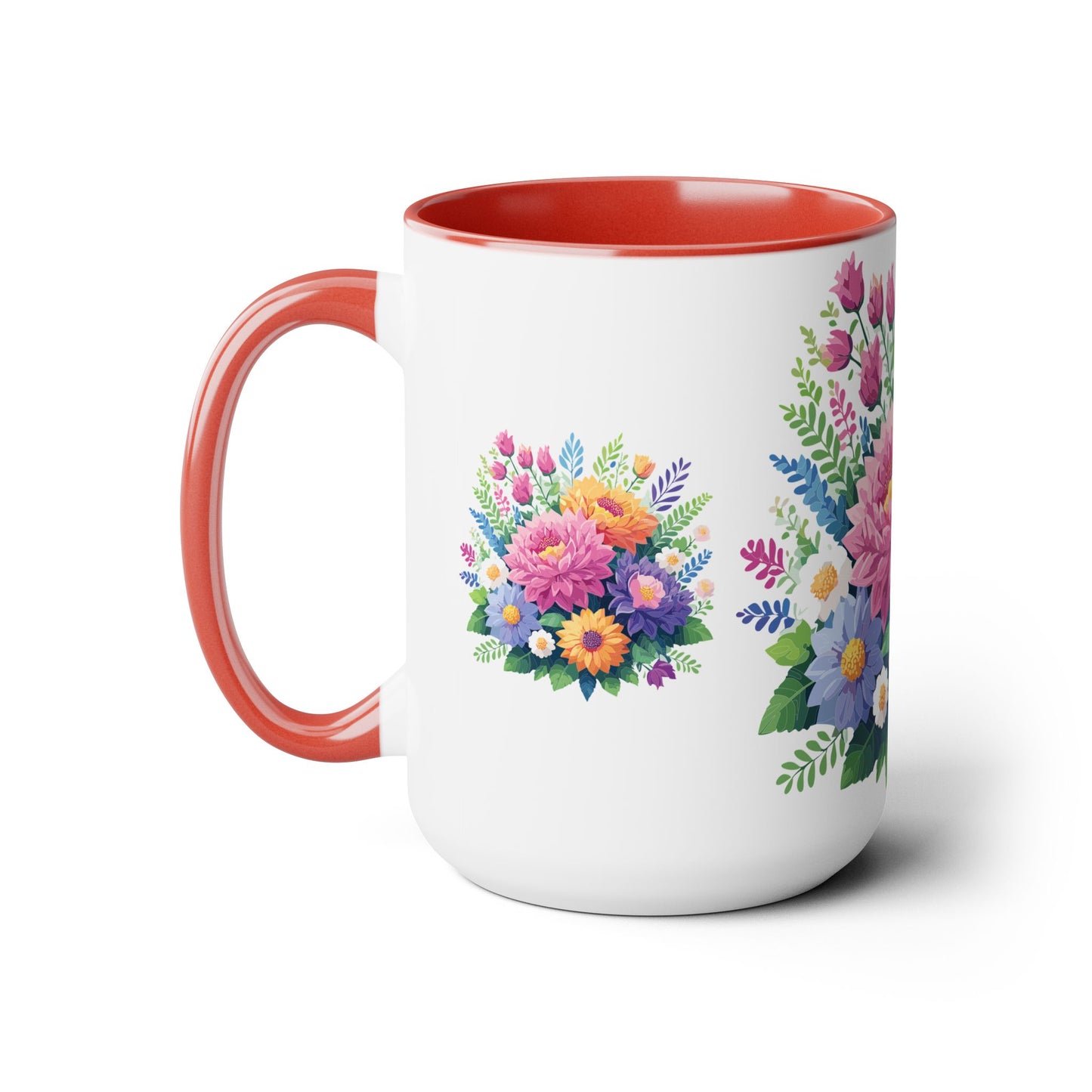 Floral Mug, Floral Cup – This 15oz two-tone coffee mug is crafted from white ceramic with a sleek glossy finish and striking color contrast. Designed for both style and comfort, it features an ergonomic C-shaped handle for a secure grip. Lead and BPA-free, it ensures safe sipping every time. Combining elegance and practicality, this mug is the perfect companion for elevating your daily coffee or tea experience.