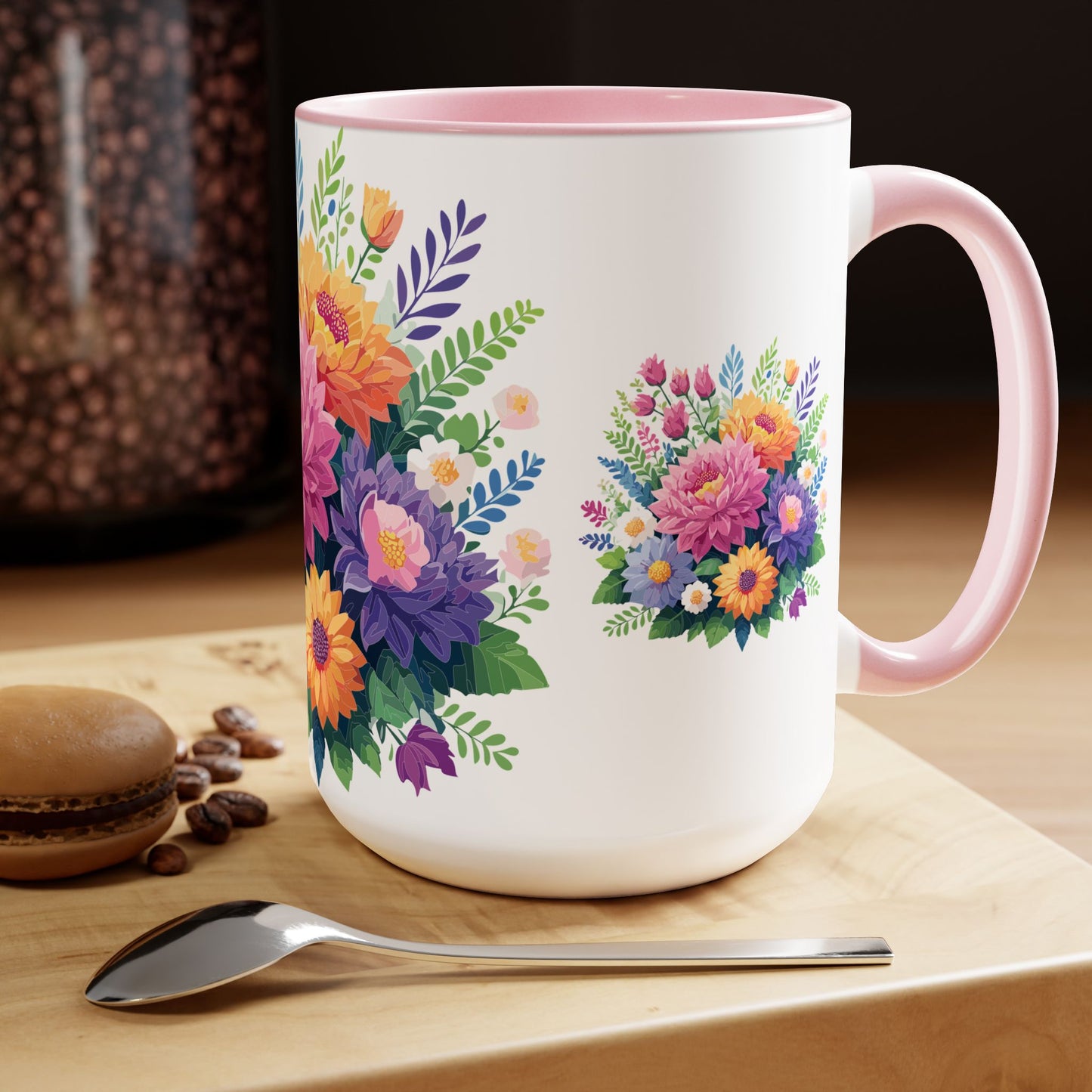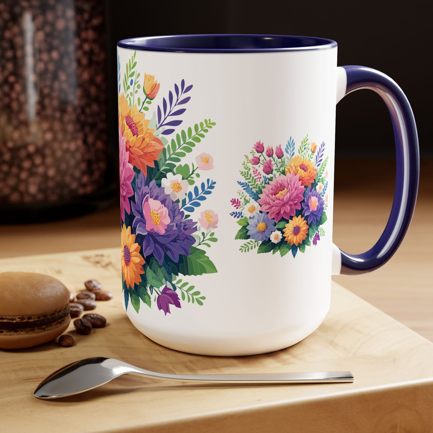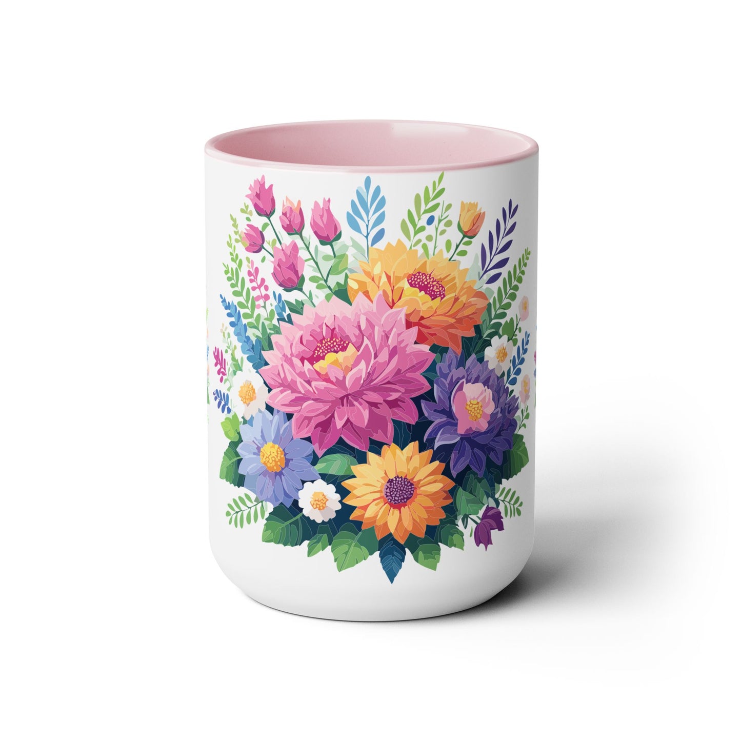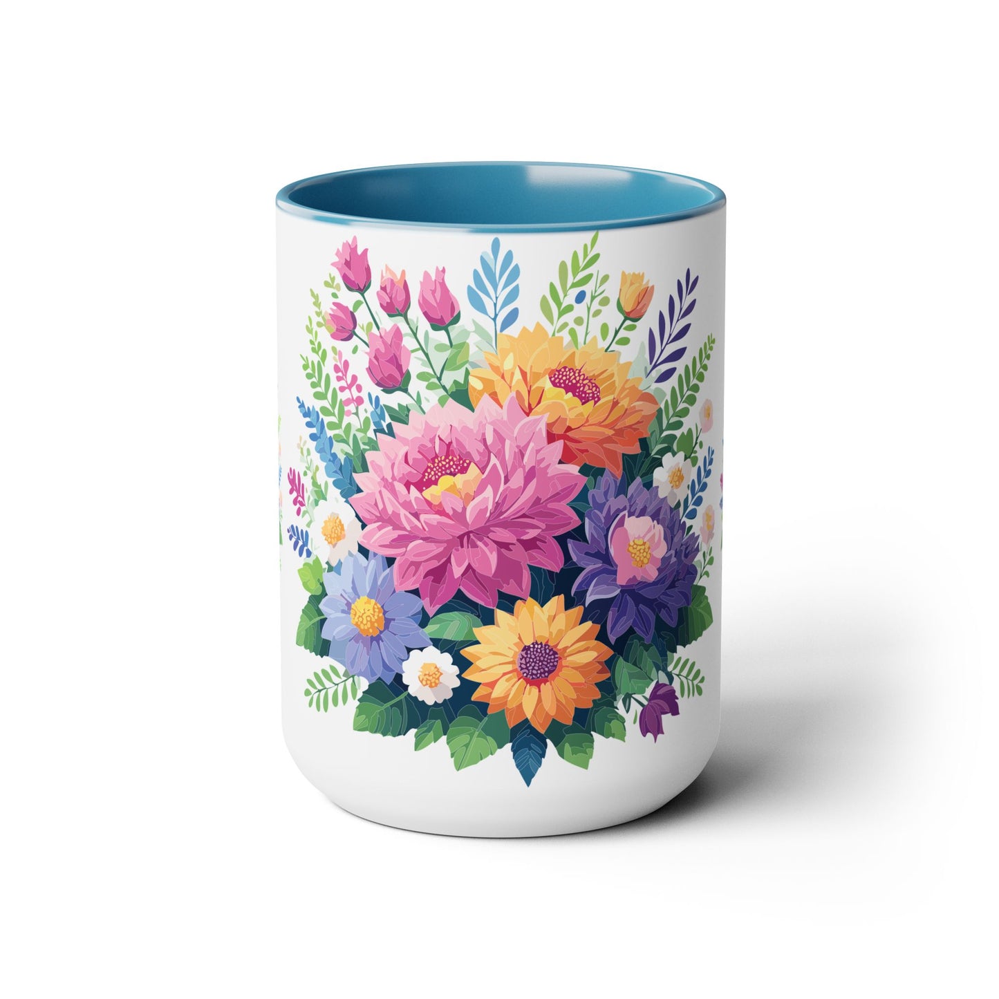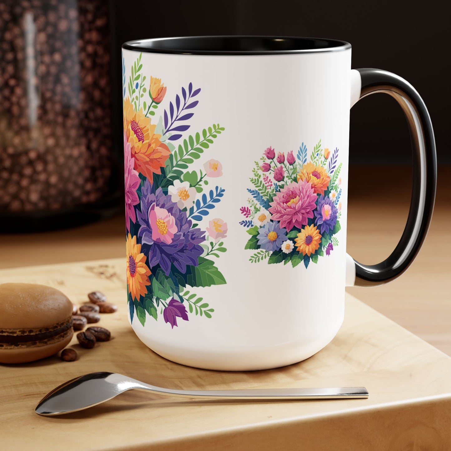 Floral Mug, Floral Cup – This 15oz two-tone coffee mug is crafted from white ceramic with a sleek glossy finish and striking color contrast. Designed for both style and comfort, it features an ergonomic C-shaped handle for a secure grip. Lead and BPA-free, it ensures safe sipping every time. Combining elegance and practicality, this mug is the perfect companion for elevating your daily coffee or tea experience.