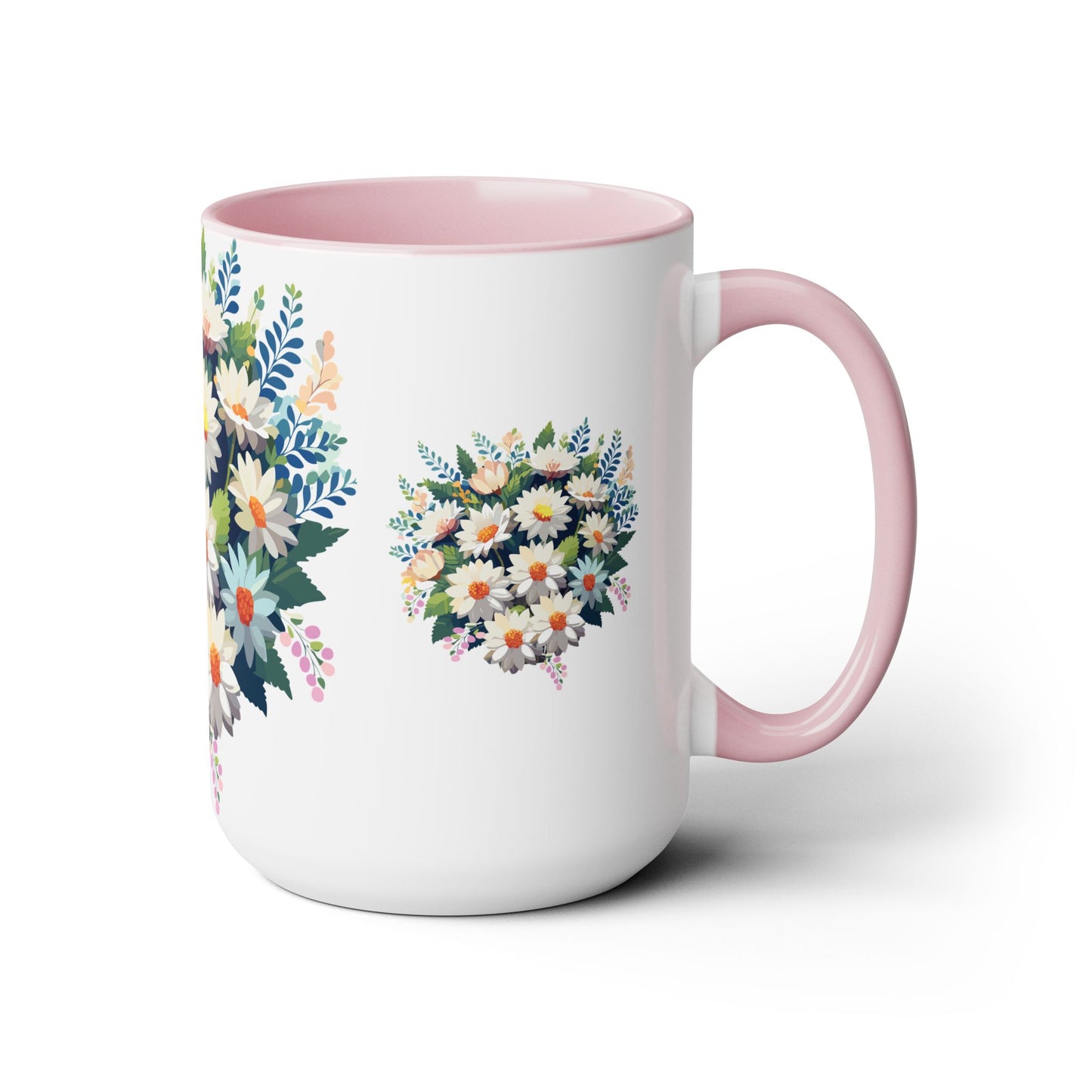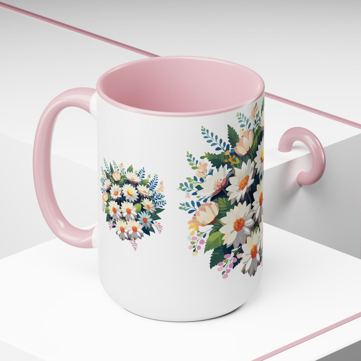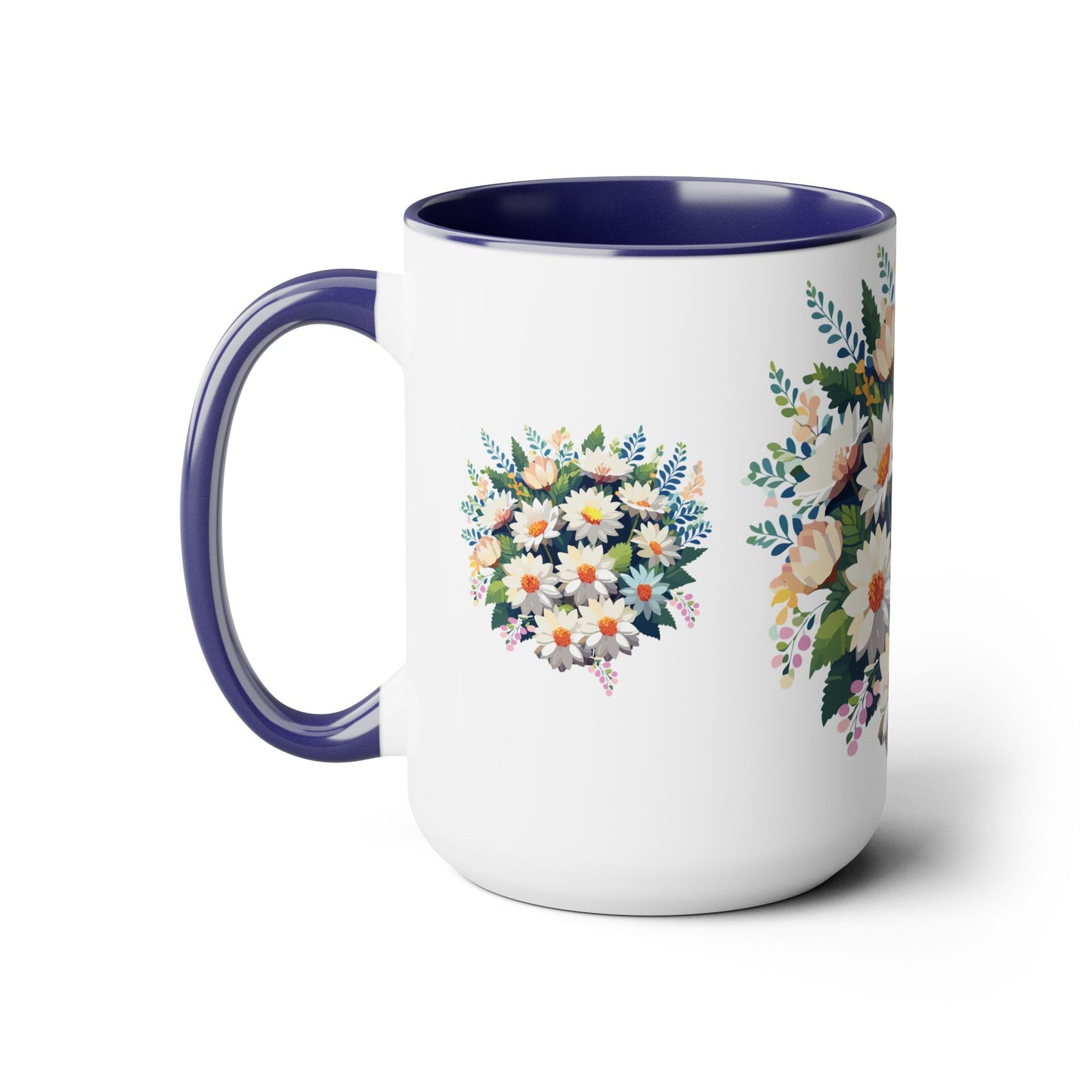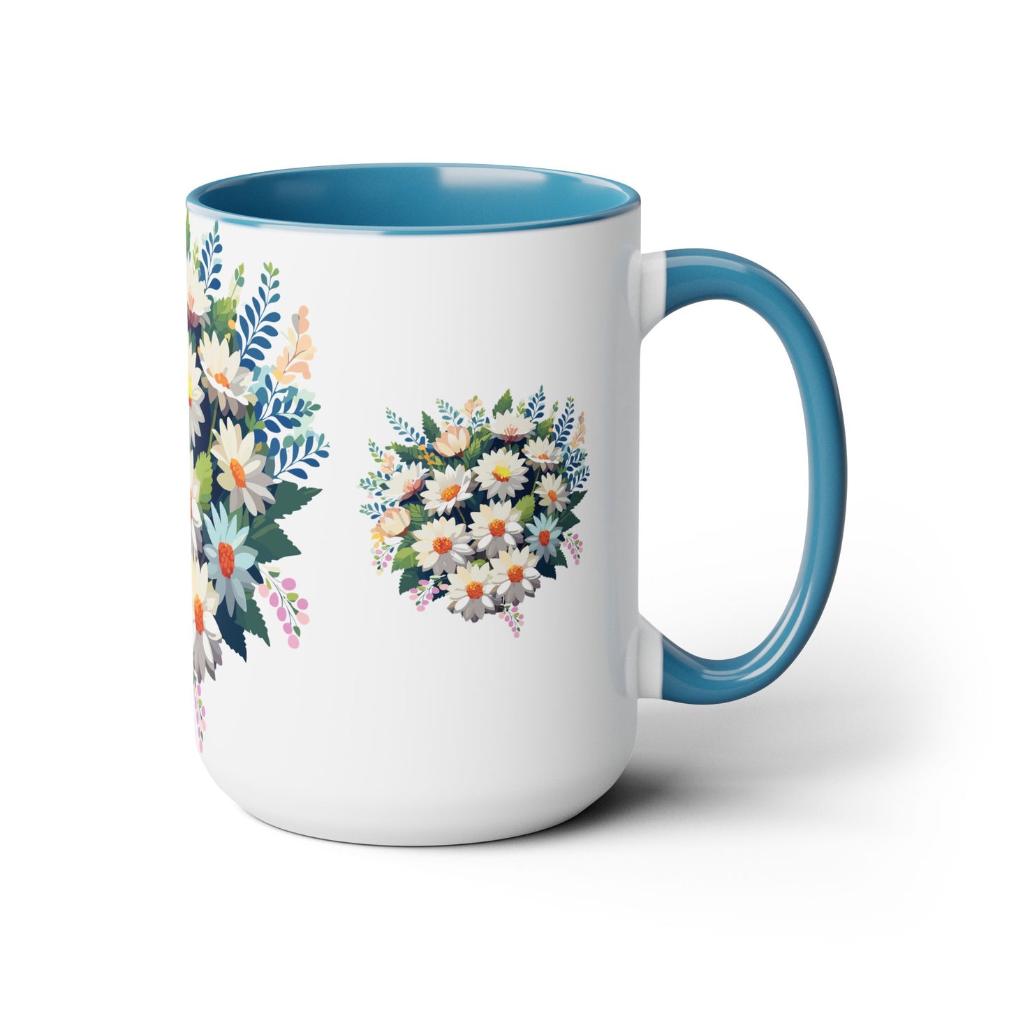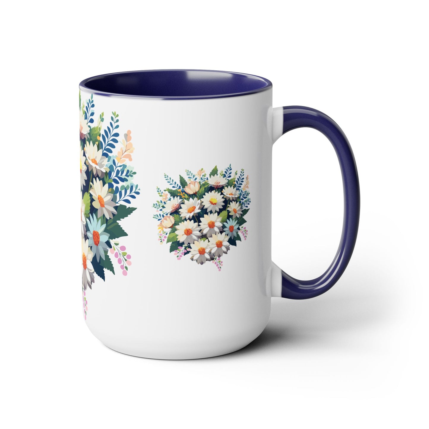 Floral Mug, Floral Cup – This 15oz two-tone coffee mug is crafted from white ceramic with a sleek glossy finish and striking color contrast. Designed for both style and comfort, it features an ergonomic C-shaped handle for a secure grip. Lead and BPA-free, it ensures safe sipping every time. Combining elegance and practicality, this mug is the perfect companion for elevating your daily coffee or tea experience.