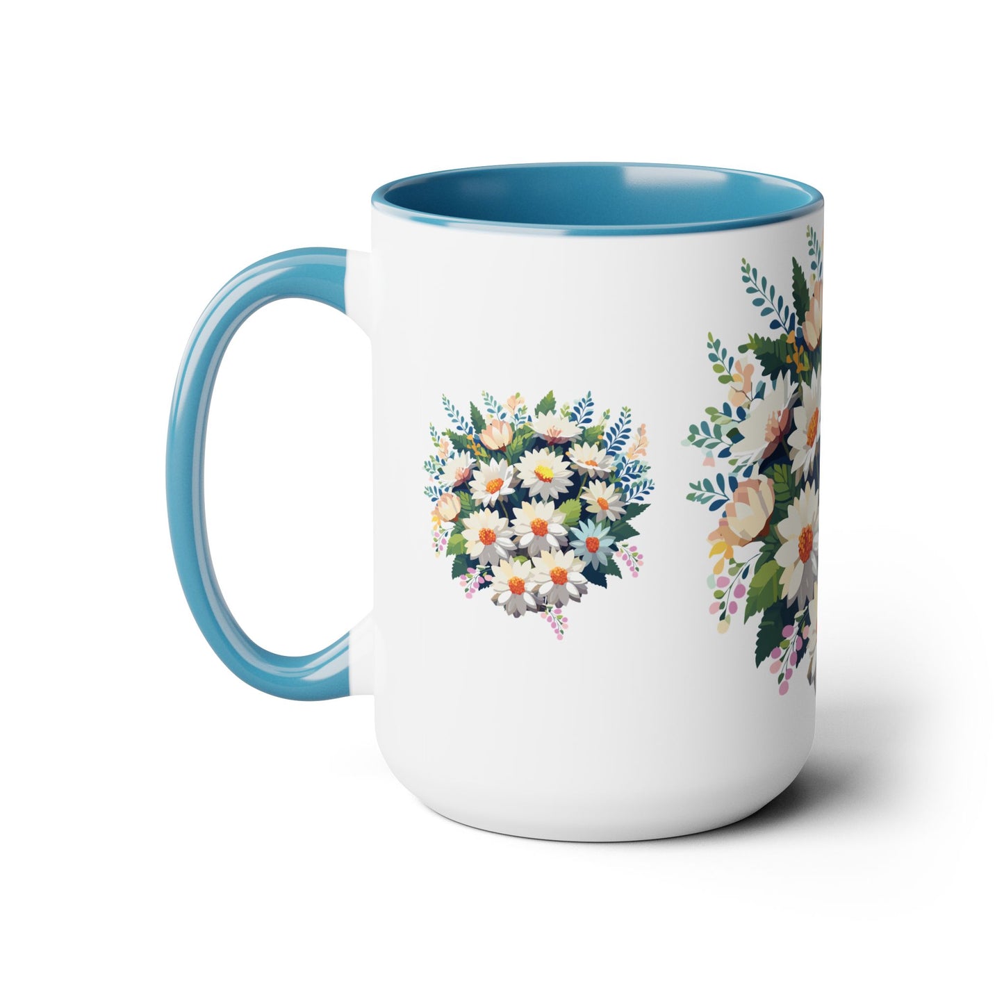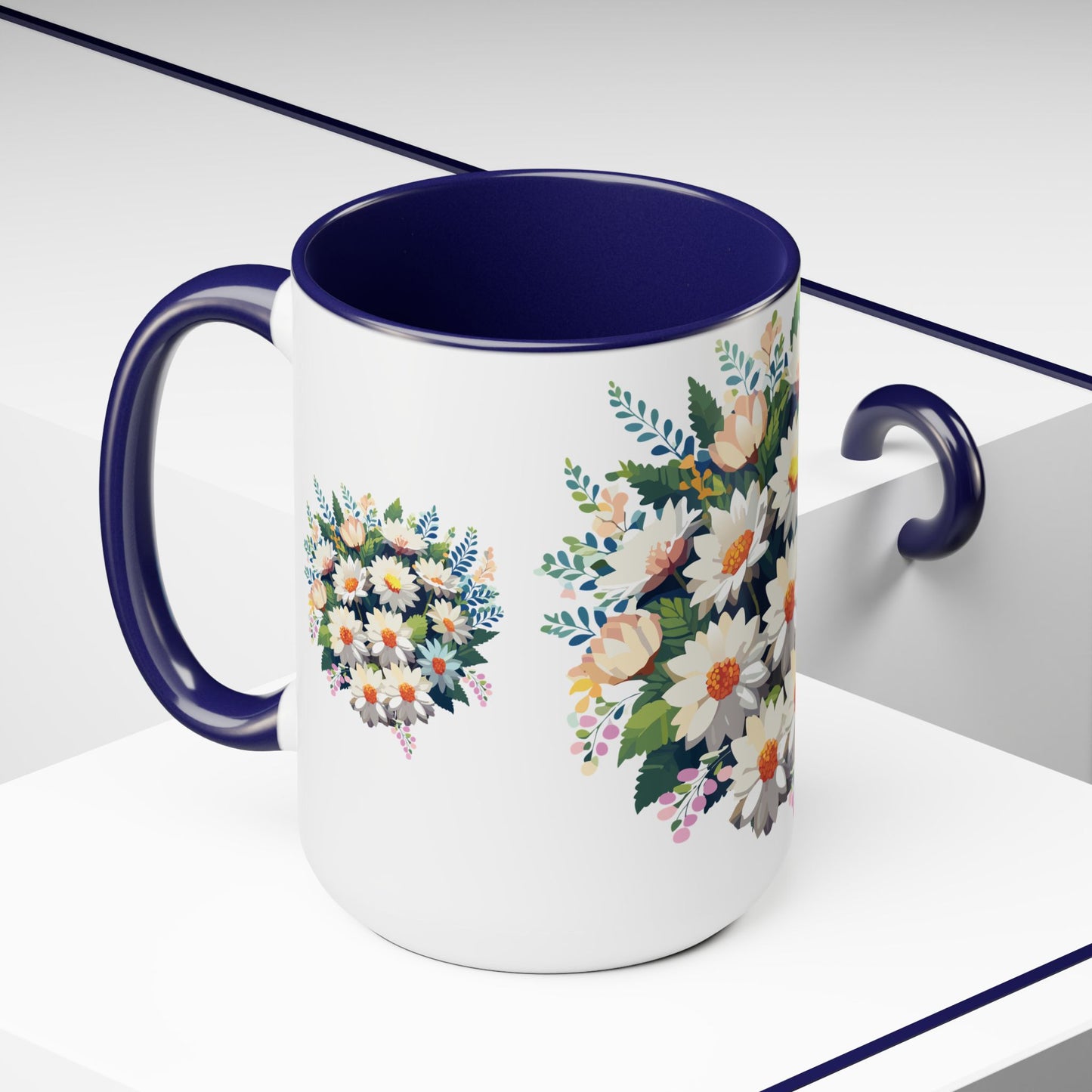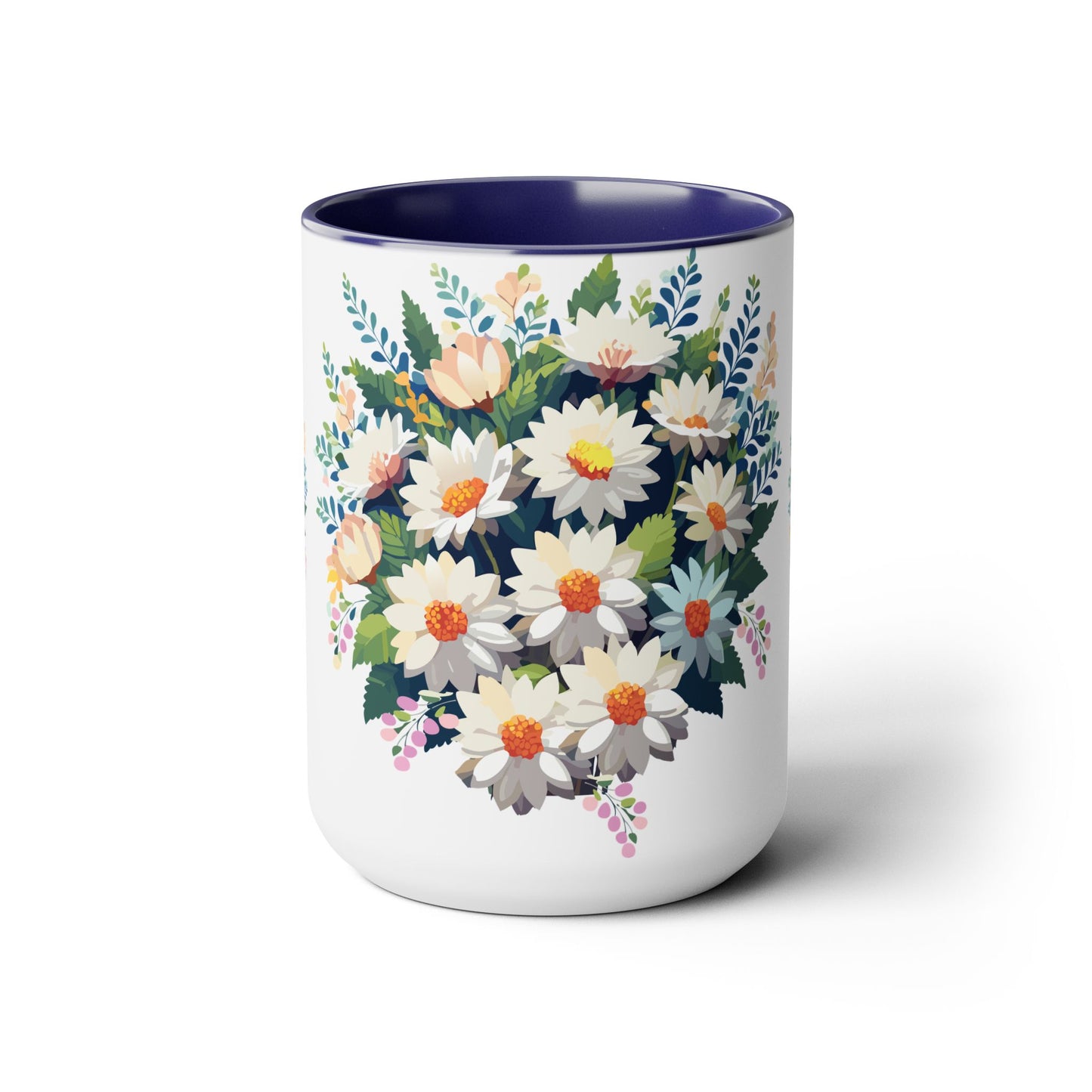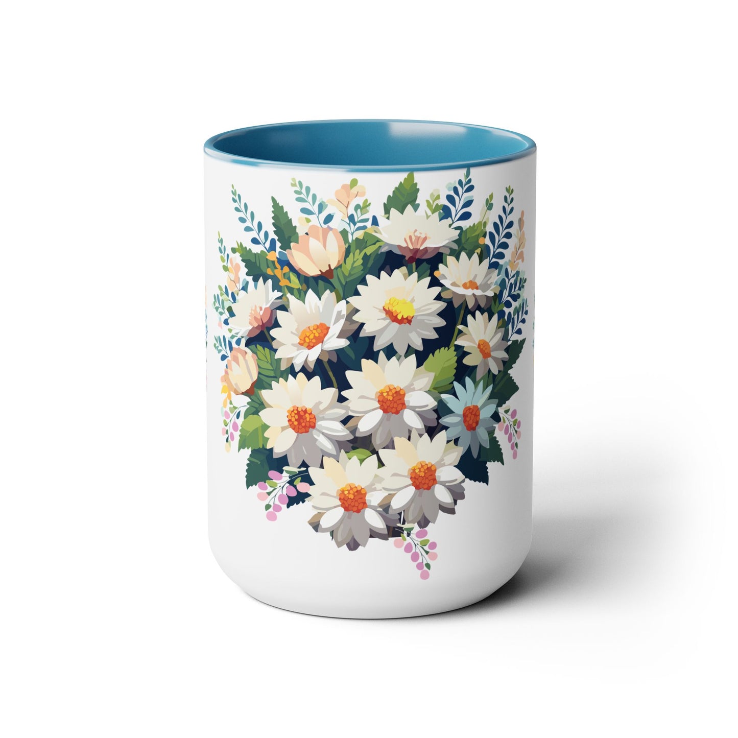 Floral Mug, Floral Cup – This 15oz two-tone coffee mug is crafted from white ceramic with a sleek glossy finish and striking color contrast. Designed for both style and comfort, it features an ergonomic C-shaped handle for a secure grip. Lead and BPA-free, it ensures safe sipping every time. Combining elegance and practicality, this mug is the perfect companion for elevating your daily coffee or tea experience.