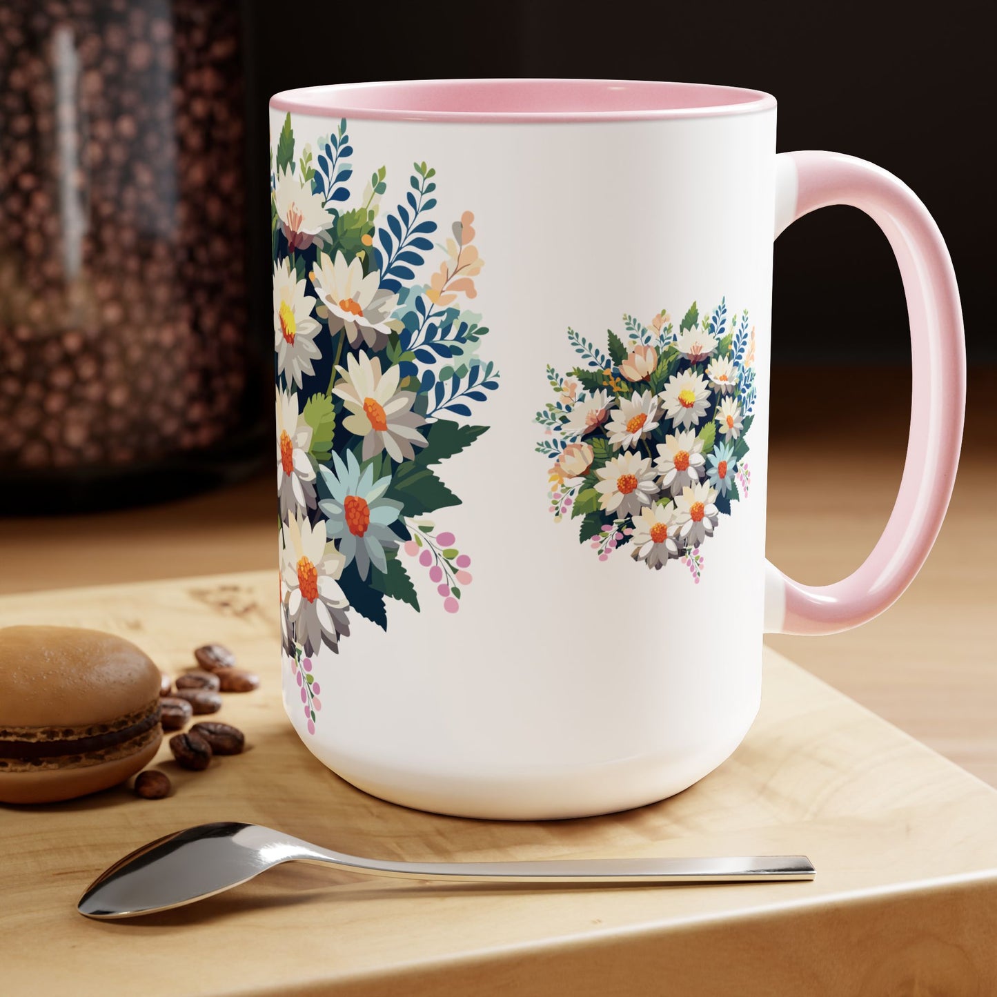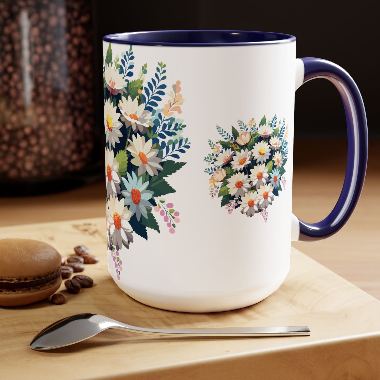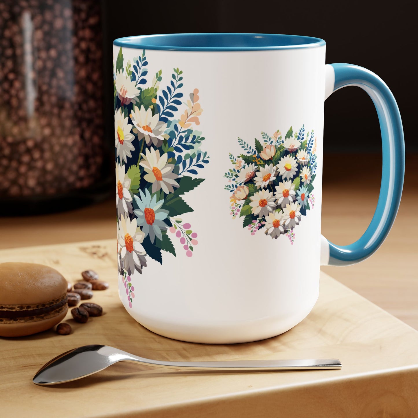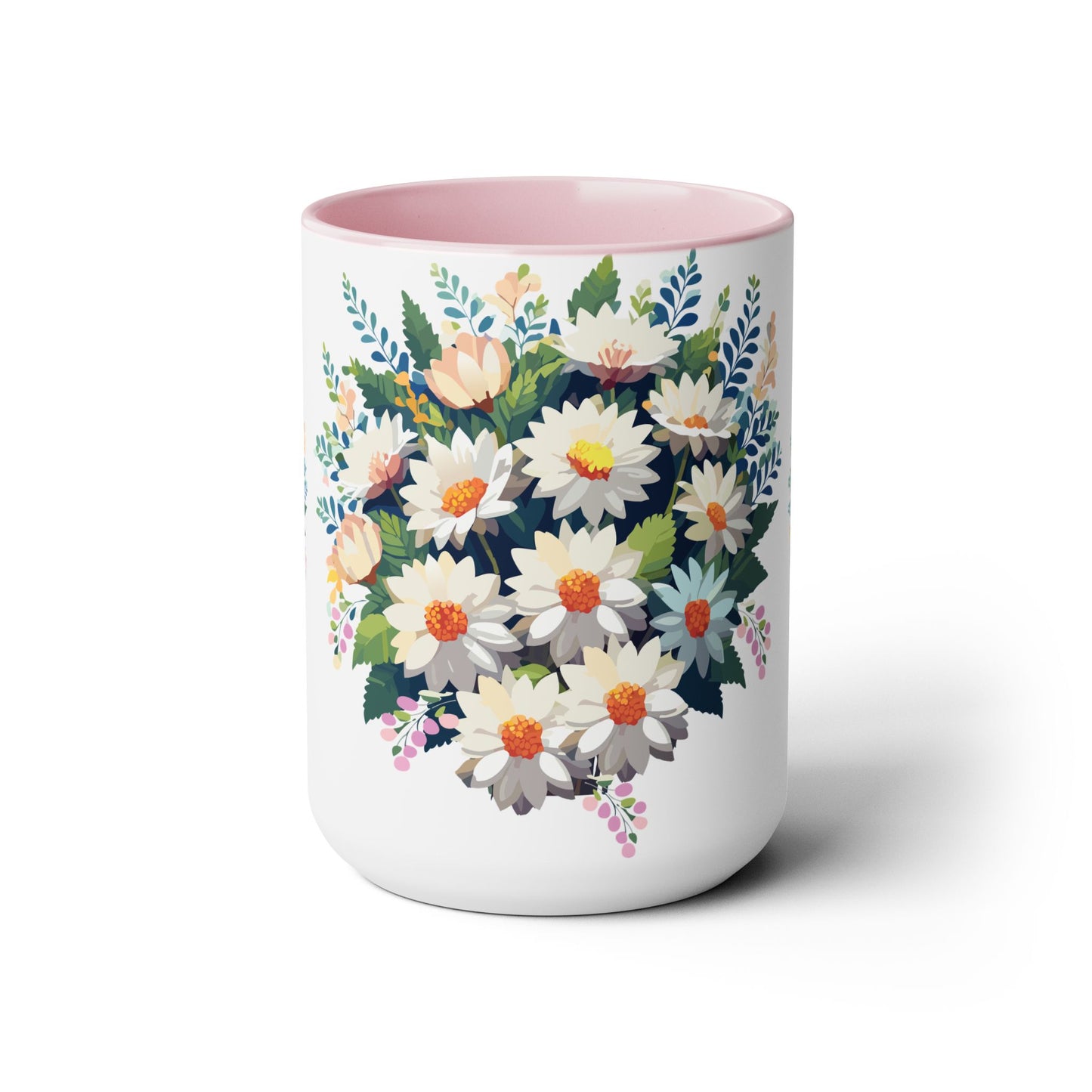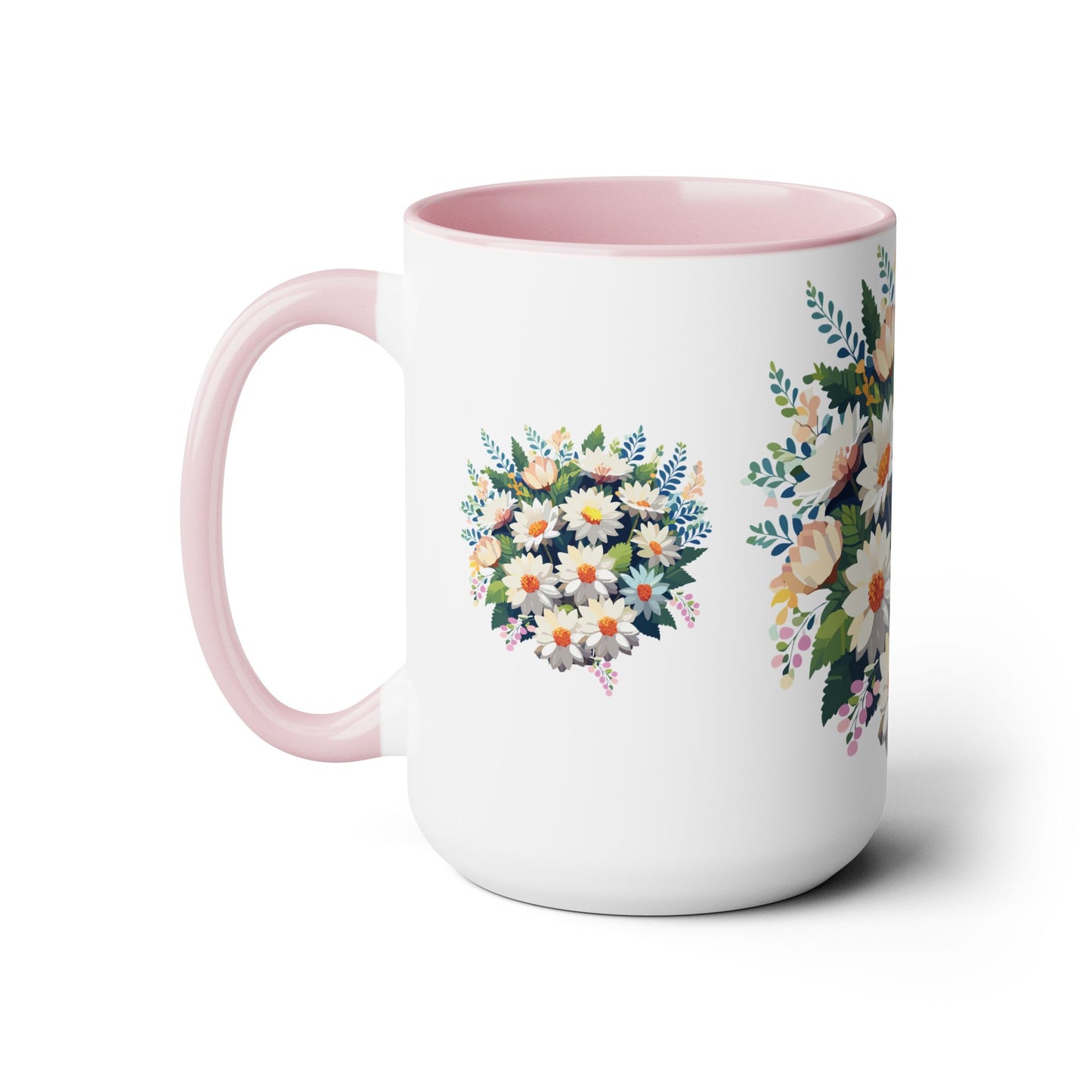 Floral Mug, Floral Cup – This 15oz two-tone coffee mug is crafted from white ceramic with a sleek glossy finish and striking color contrast. Designed for both style and comfort, it features an ergonomic C-shaped handle for a secure grip. Lead and BPA-free, it ensures safe sipping every time. Combining elegance and practicality, this mug is the perfect companion for elevating your daily coffee or tea experience.