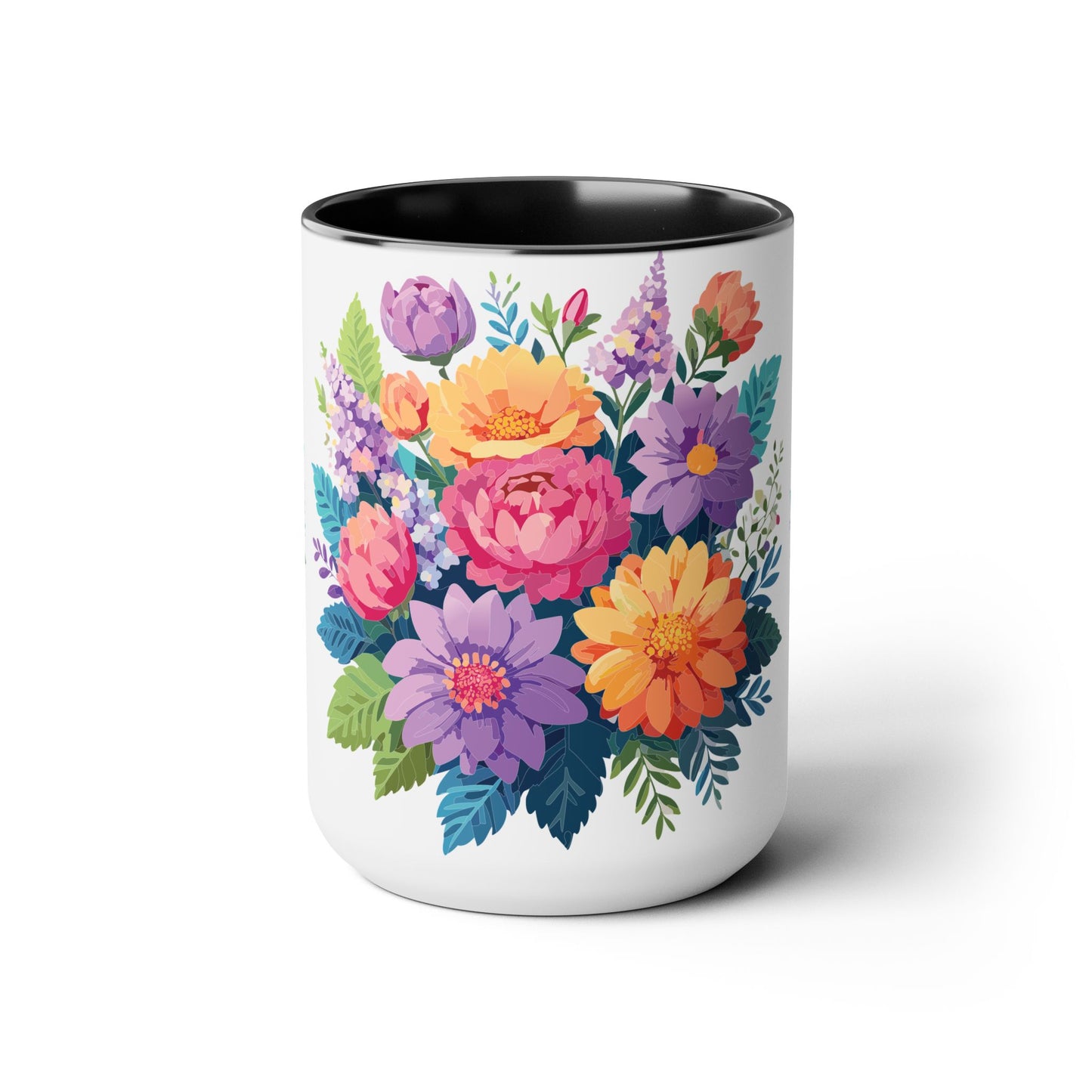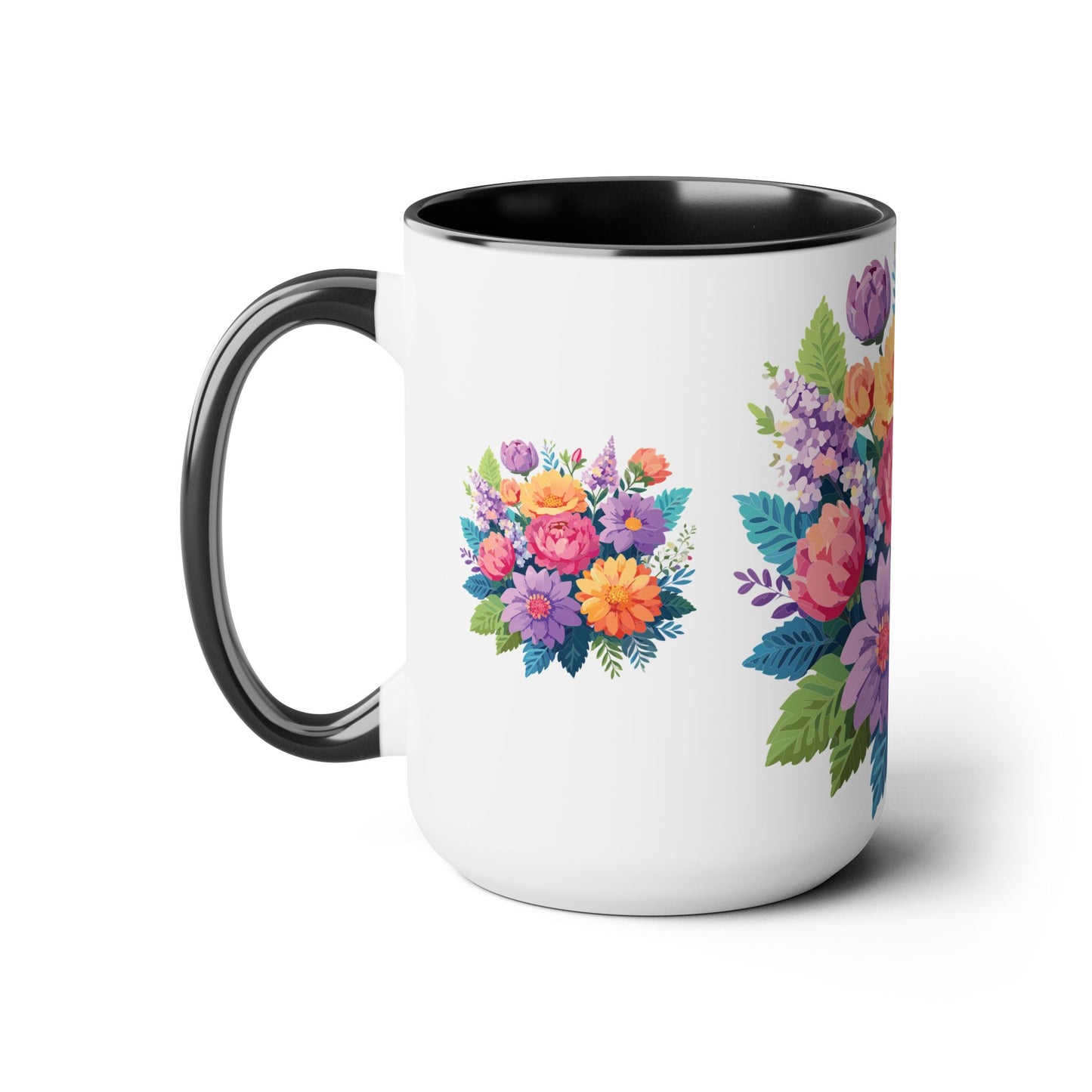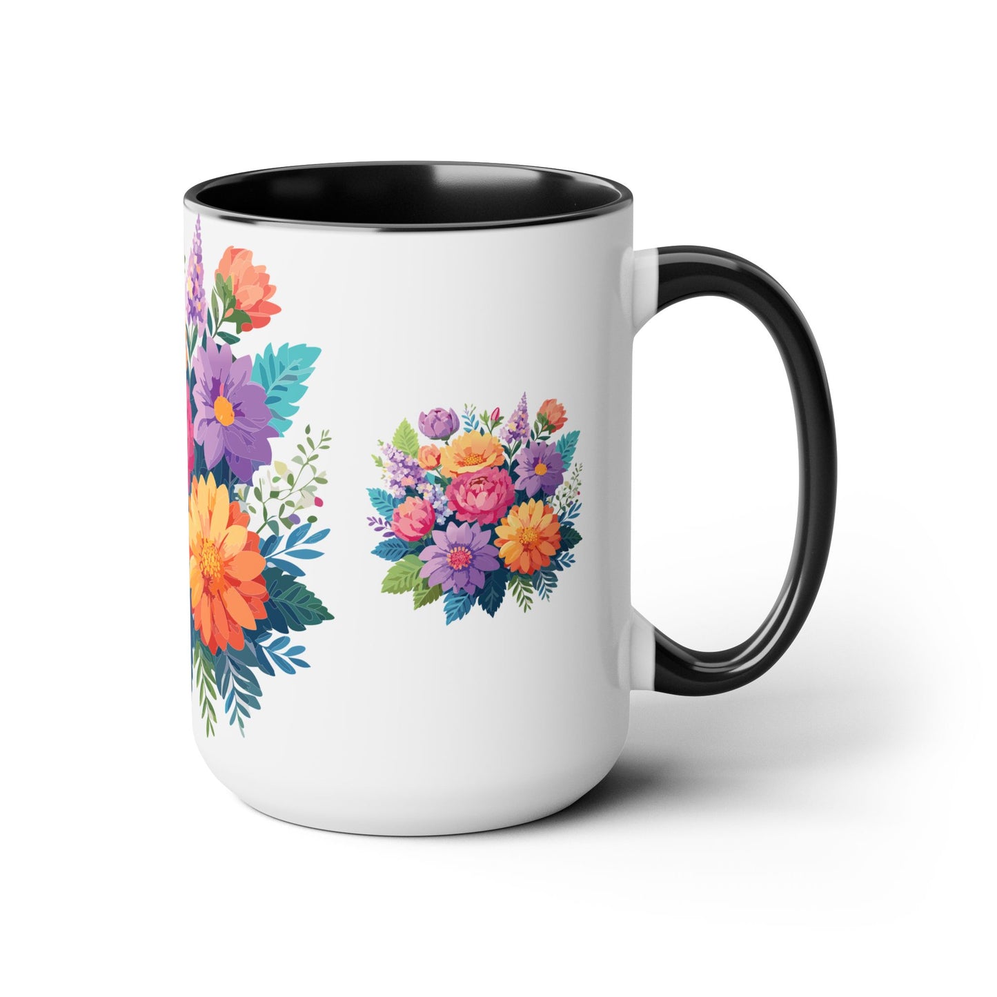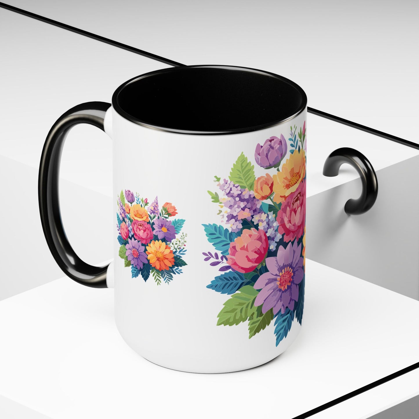 Floral Mug, Floral Cup – This 15oz two-tone coffee mug is crafted from white ceramic with a sleek glossy finish and striking color contrast. Designed for both style and comfort, it features an ergonomic C-shaped handle for a secure grip. Lead and BPA-free, it ensures safe sipping every time. Combining elegance and practicality, this mug is the perfect companion for elevating your daily coffee or tea experience.