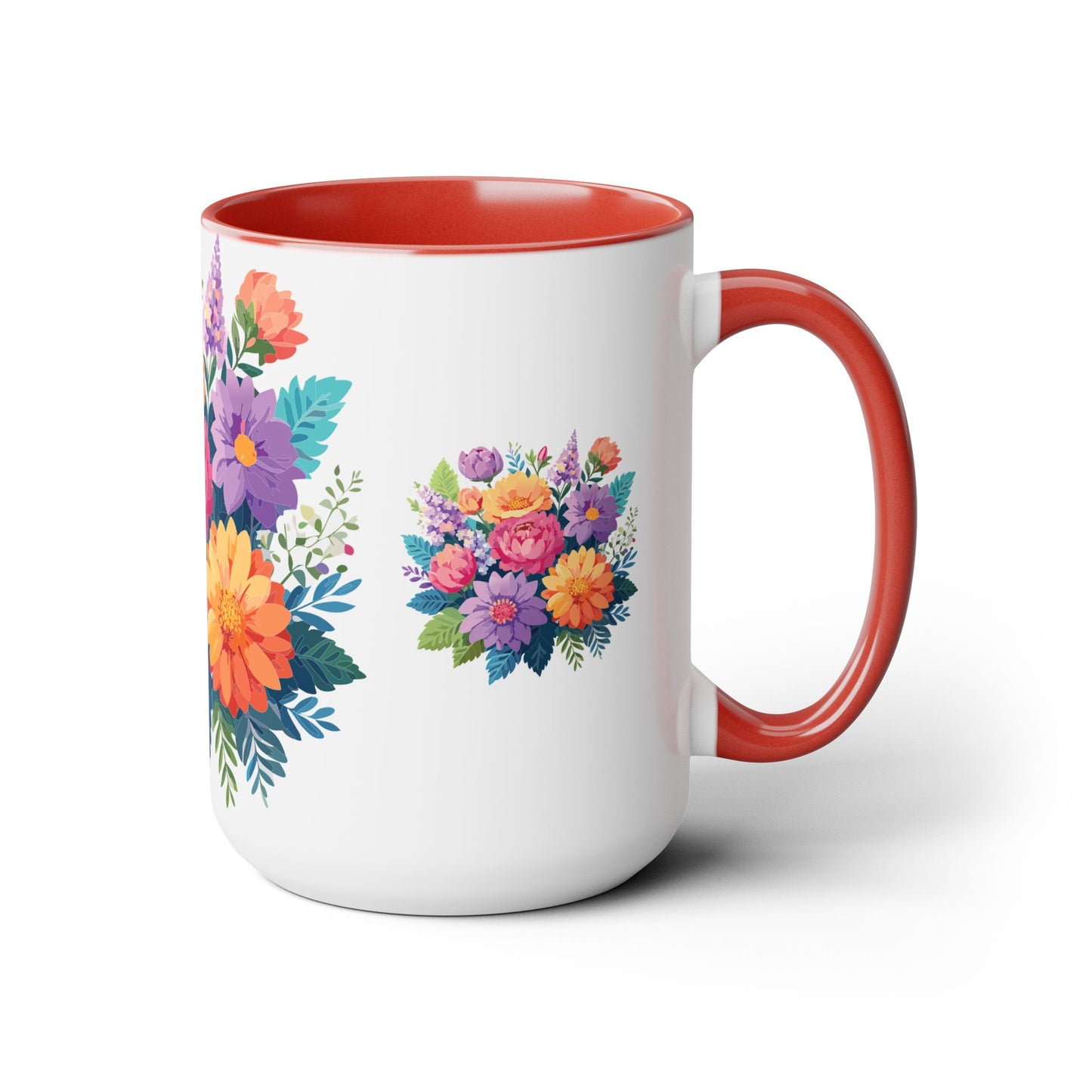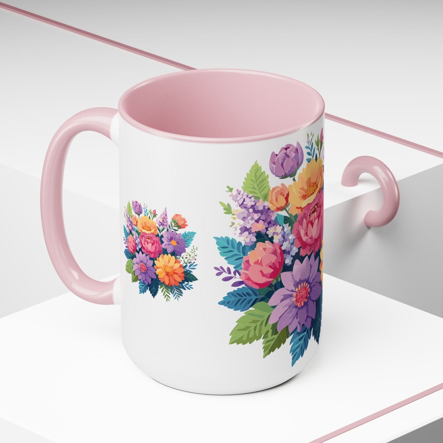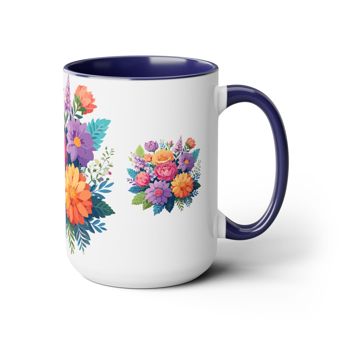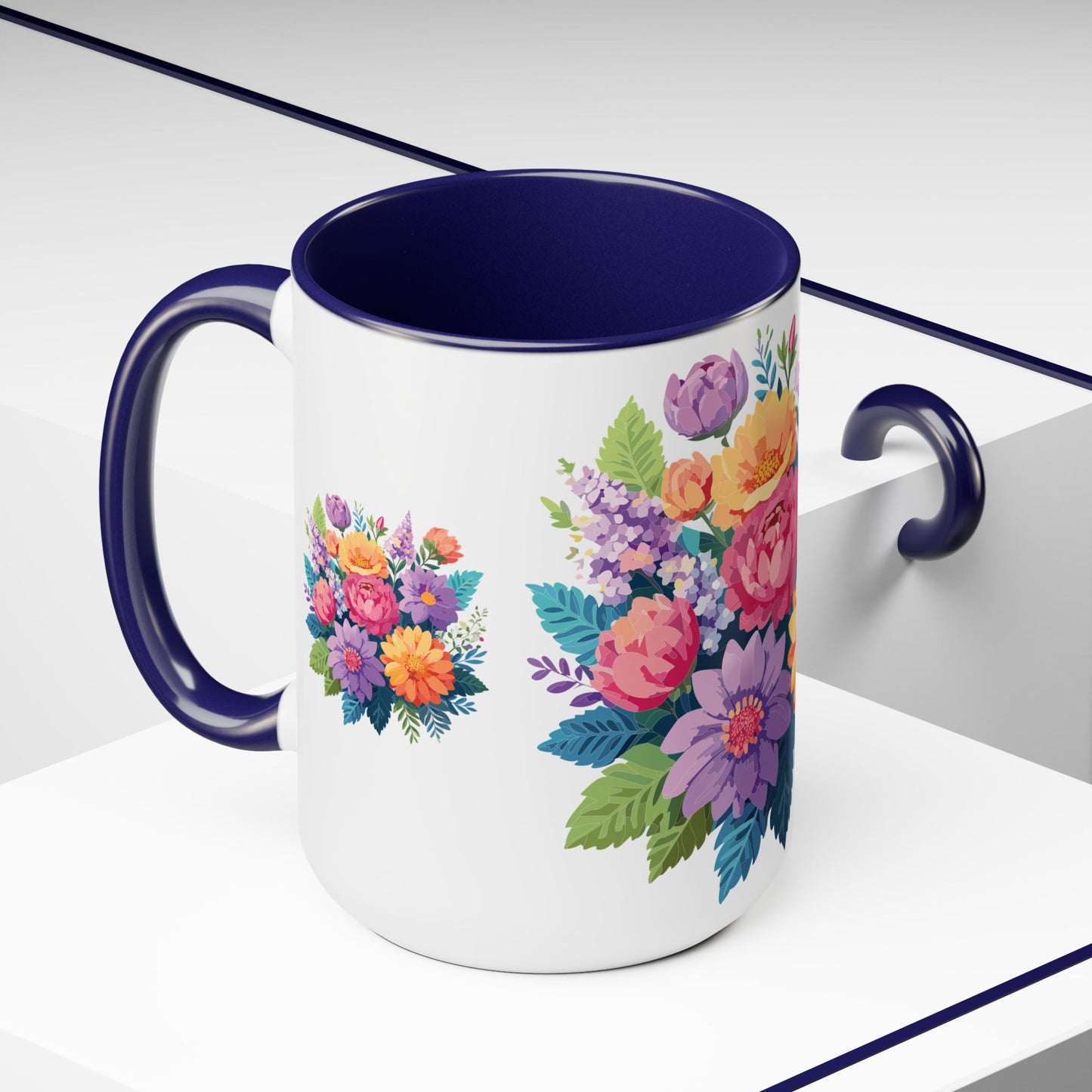 Floral Mug, Floral Cup – This 15oz two-tone coffee mug is crafted from white ceramic with a sleek glossy finish and striking color contrast. Designed for both style and comfort, it features an ergonomic C-shaped handle for a secure grip. Lead and BPA-free, it ensures safe sipping every time. Combining elegance and practicality, this mug is the perfect companion for elevating your daily coffee or tea experience.