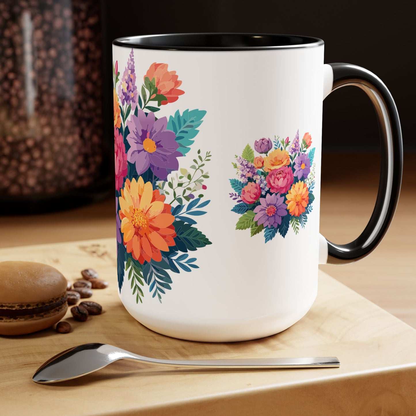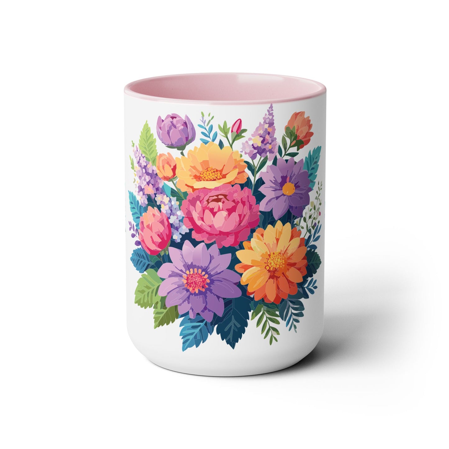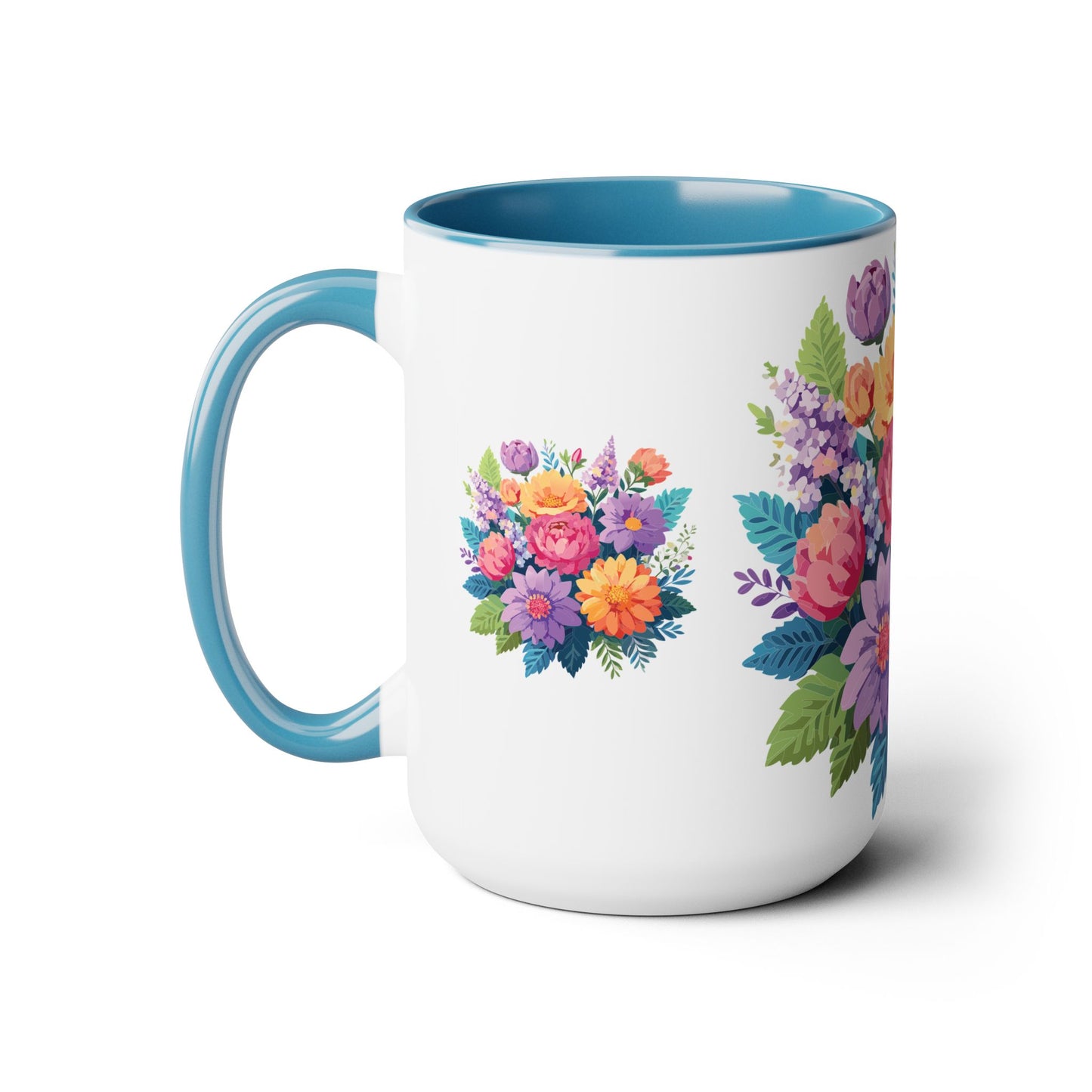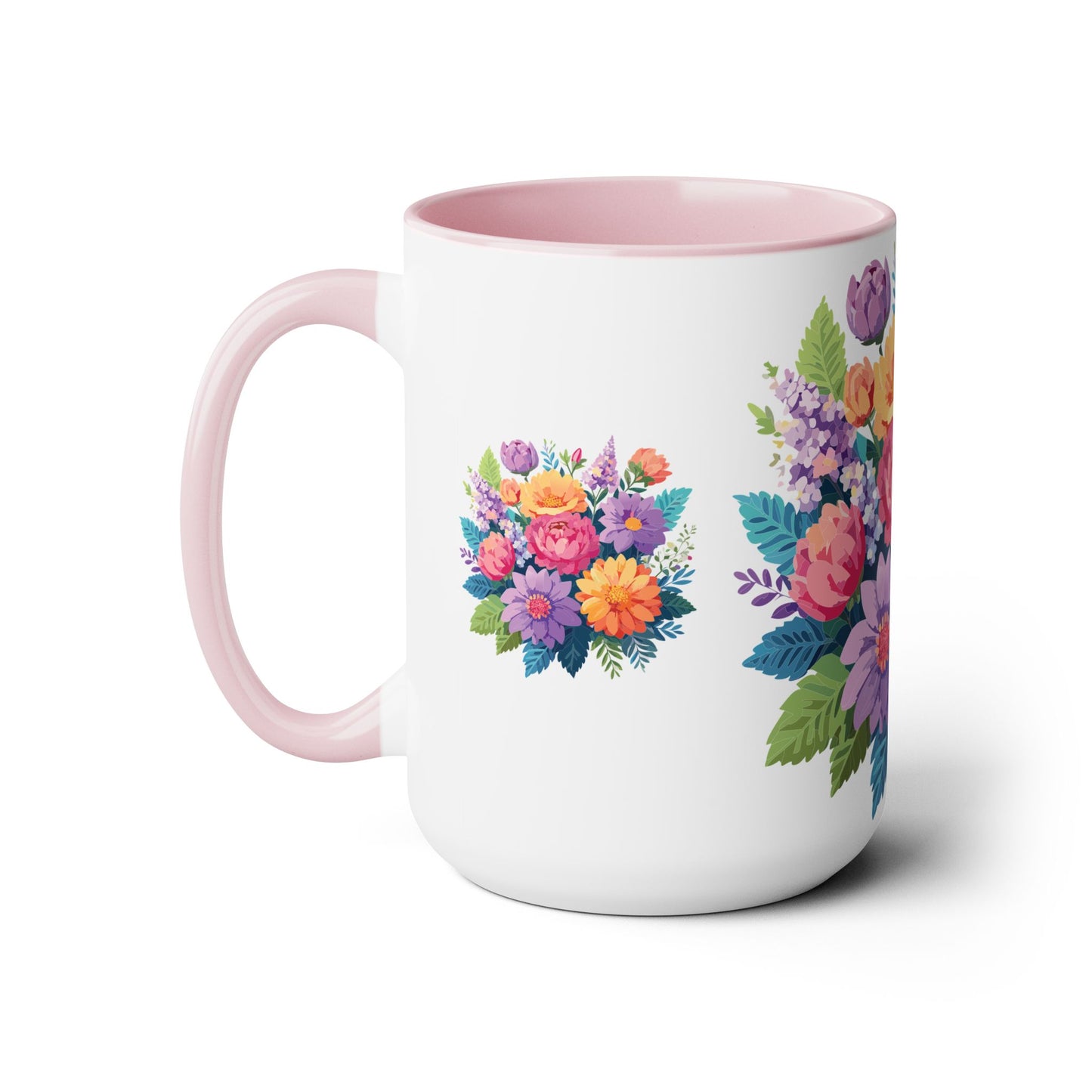Floral Mug, Floral Cup – This 15oz two-tone coffee mug is crafted from white ceramic with a sleek glossy finish and striking color contrast. Designed for both style and comfort, it features an ergonomic C-shaped handle for a secure grip. Lead and BPA-free, it ensures safe sipping every time. Combining elegance and practicality, this mug is the perfect companion for elevating your daily coffee or tea experience.