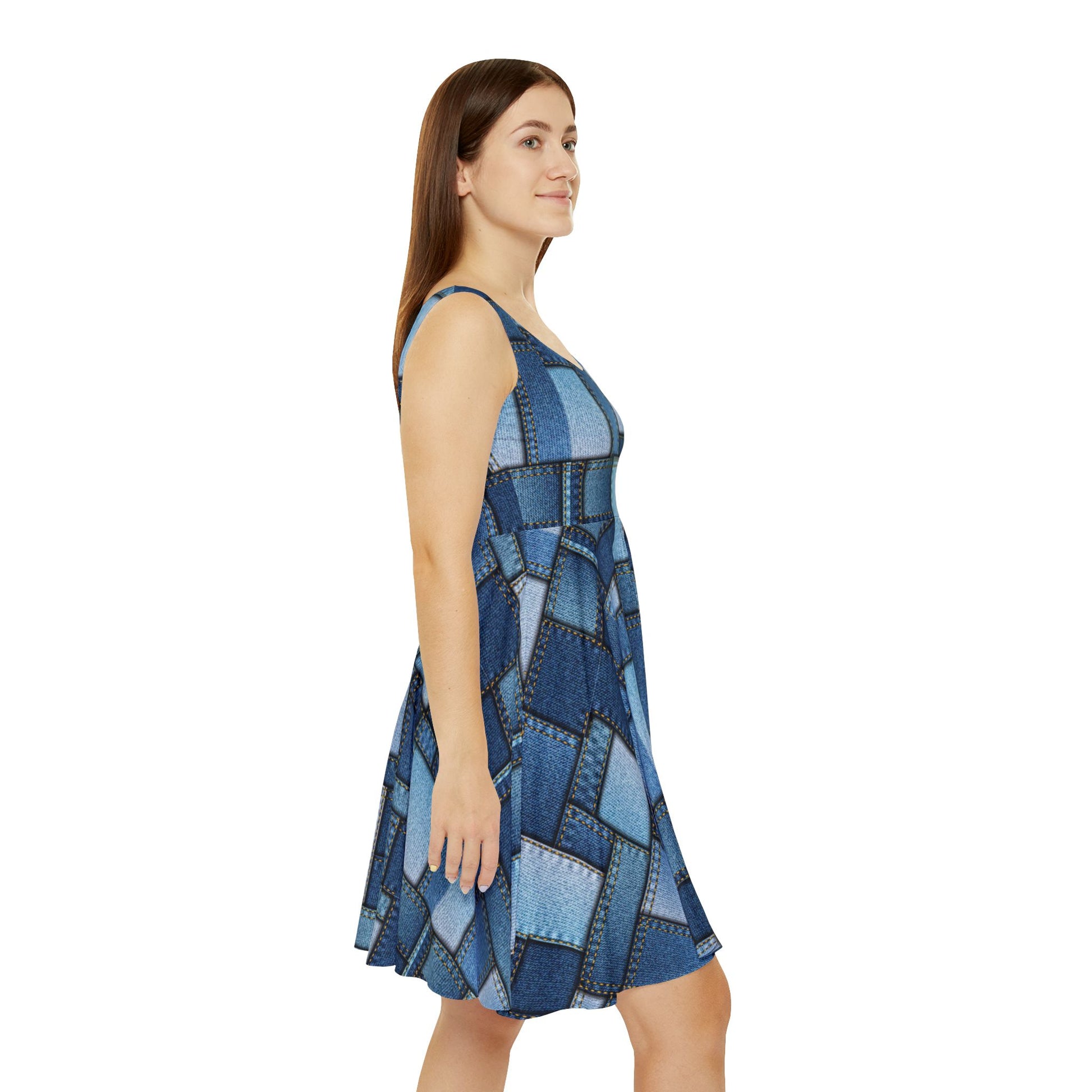 Women Denim Print Skater Dress, Denim Print Poly-Span Dress -1