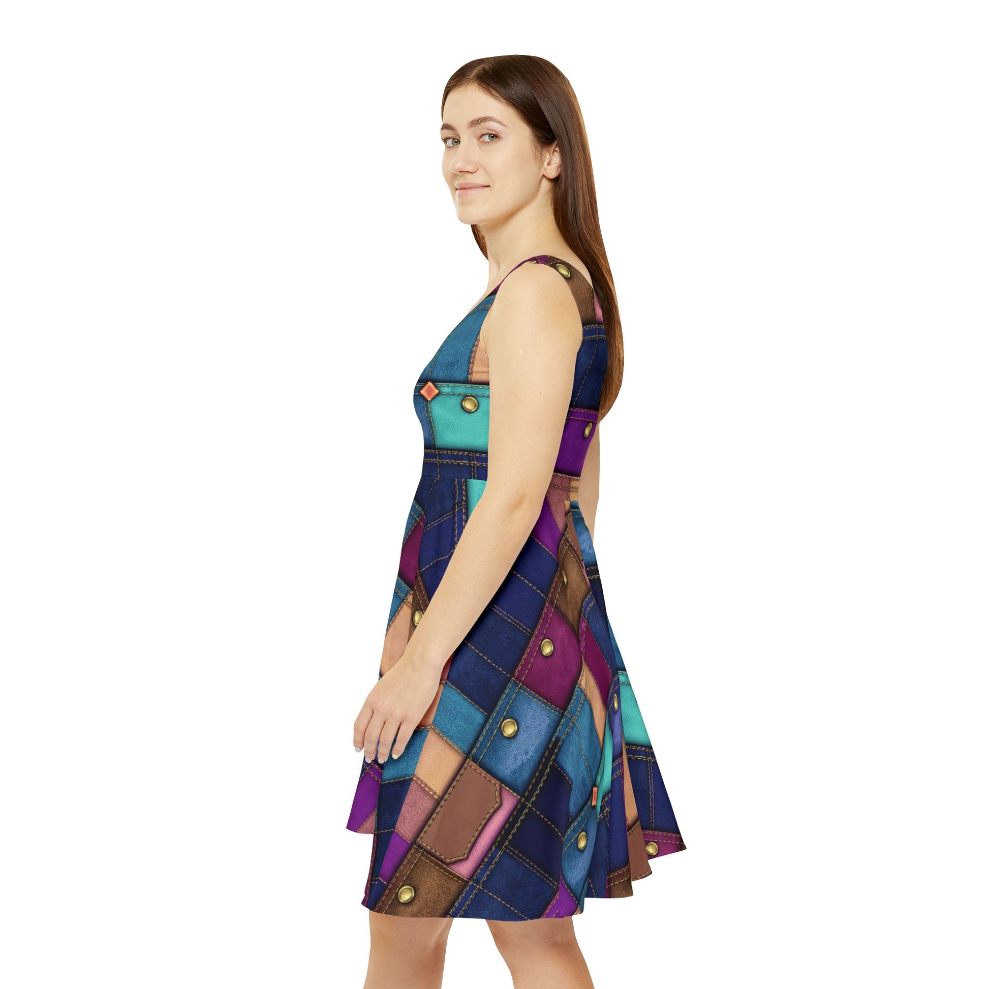 Designed for movement and comfort, this mid-length skater dress features a soft polyester-spandex blend with a high scoop neckline and an asymmetrical skirt that flows with every step. Durable double-needle stitching and vibrant dye-sublimation printing ensure long-lasting shape and color.