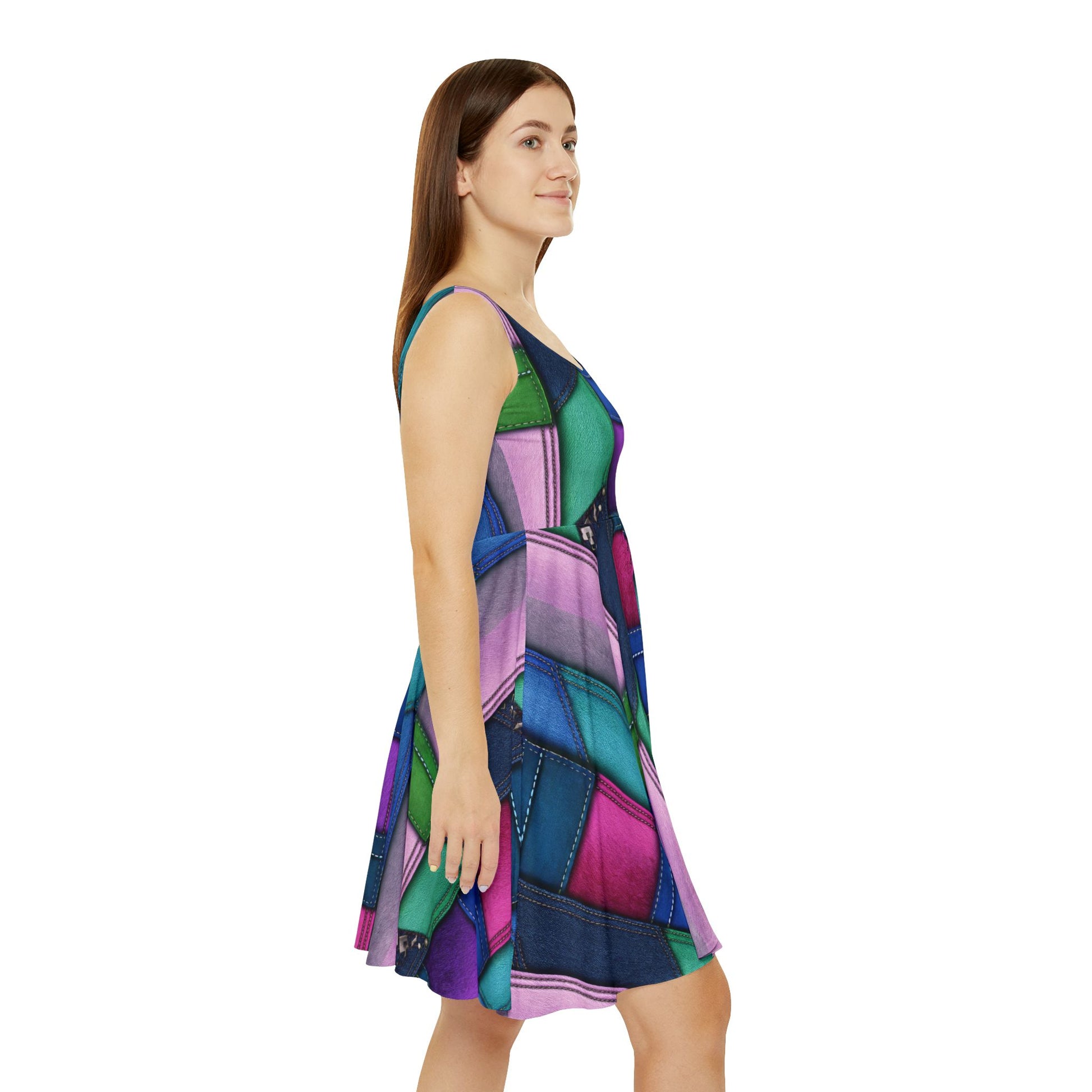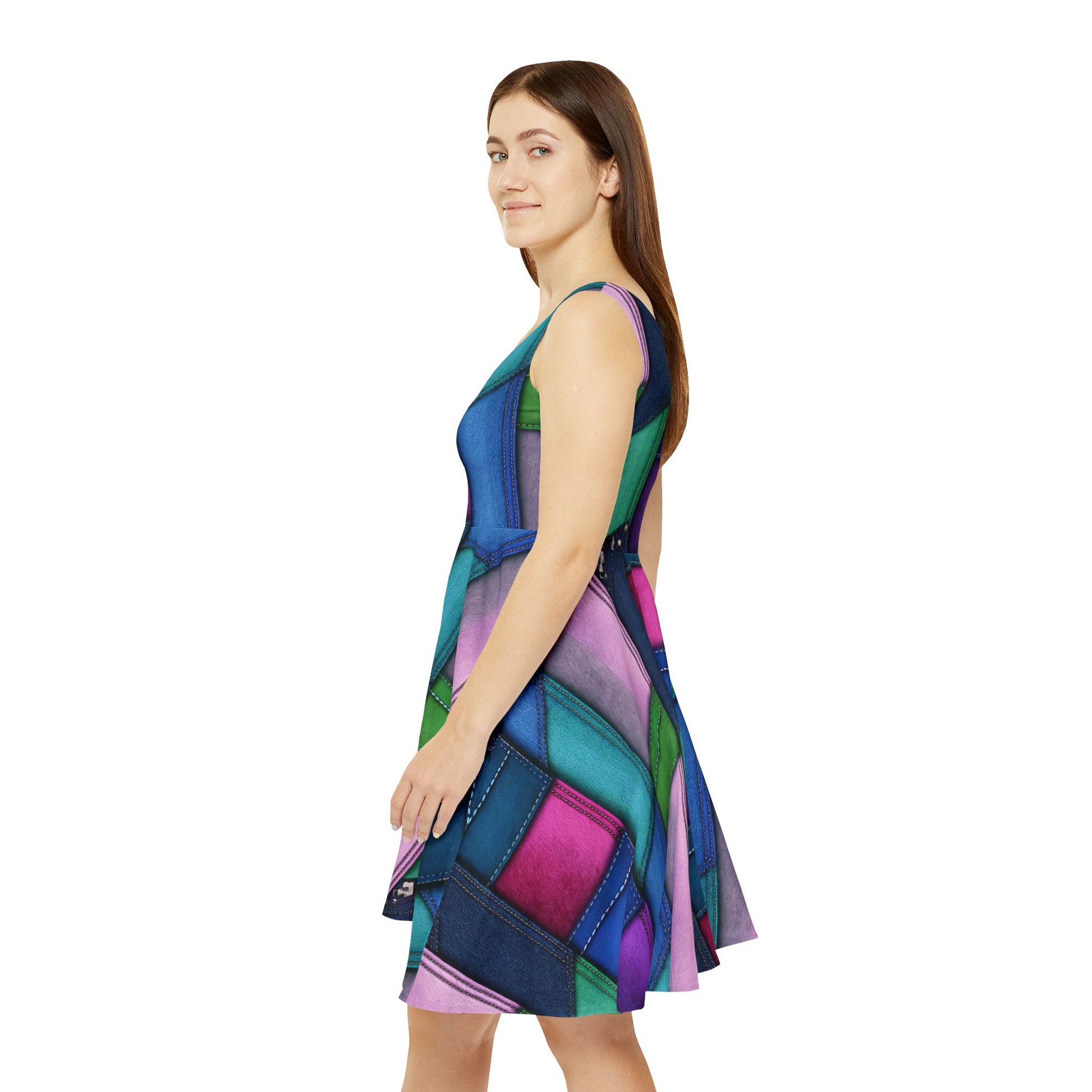 Women Denim Print Skater Dress, Denim Print Poly-Span Dress - 7