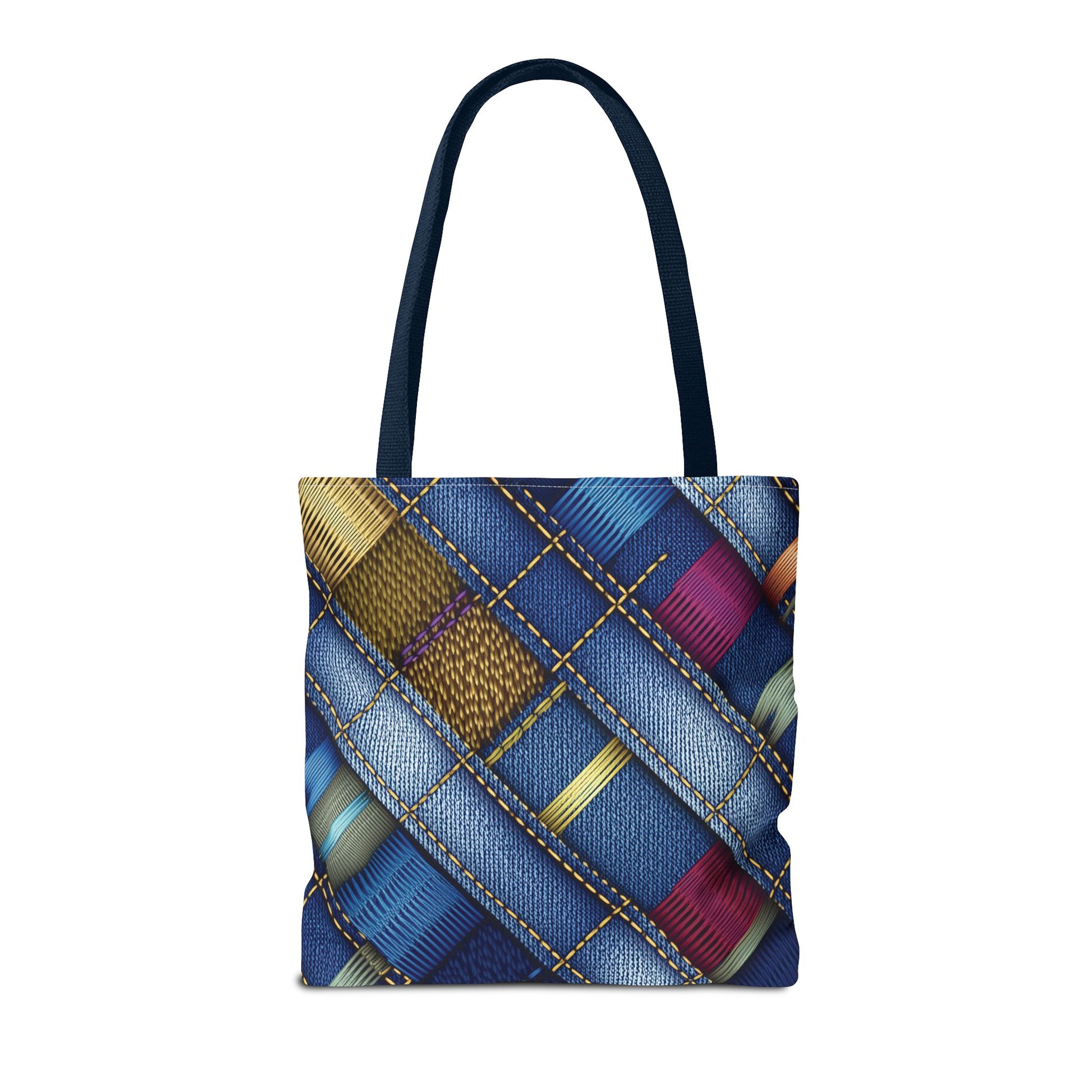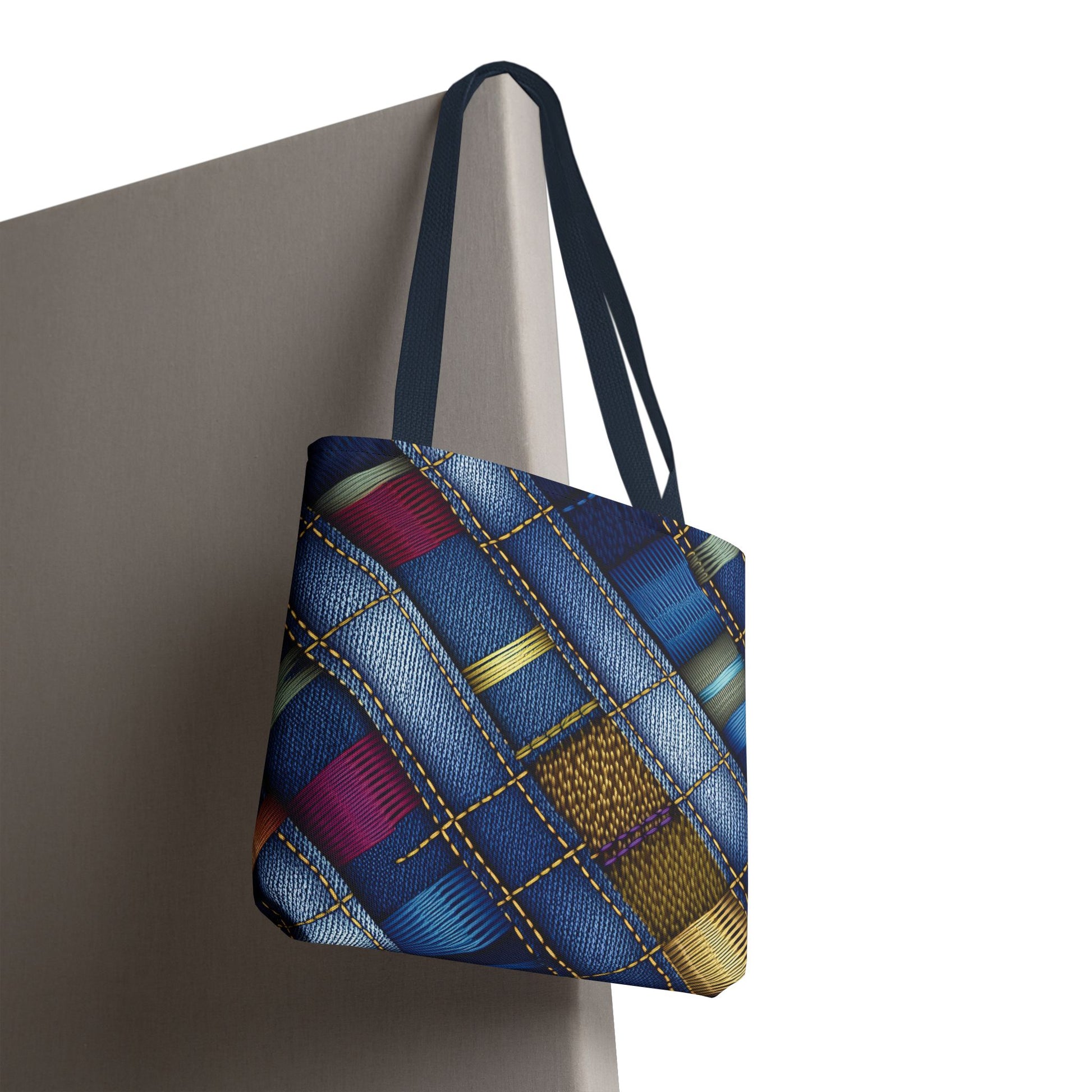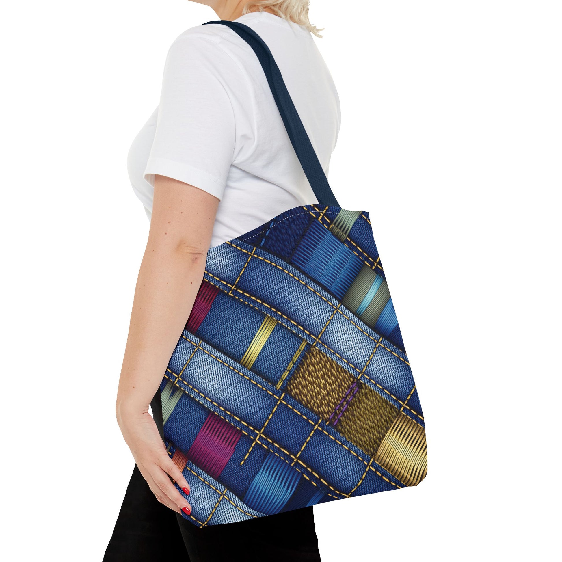 Denim Print Canvas Tote Bag – Elegant Poly Shoulder Bag - Enhance everyday functionality with timeless style in our Denim Print Canvas Tote Bag. Designed for versatility, this custom-printed tote is available in three convenient sizes and offers multiple handle color options to perfectly complement your look. Crafted from premium spun polyester, it delivers exceptional durability with double-stitched seams, sturdy cotton webbing straps, and a non-woven laminate interior.