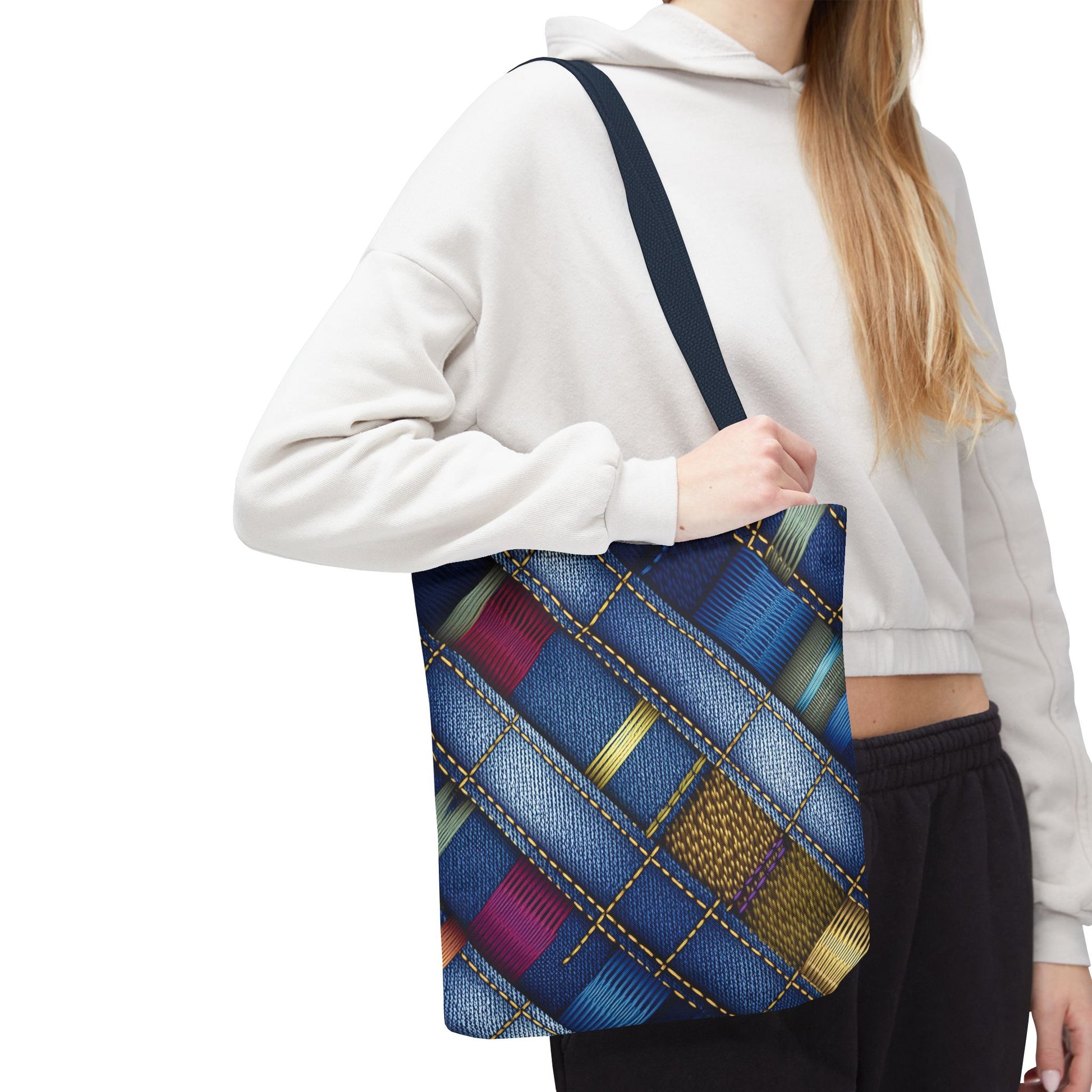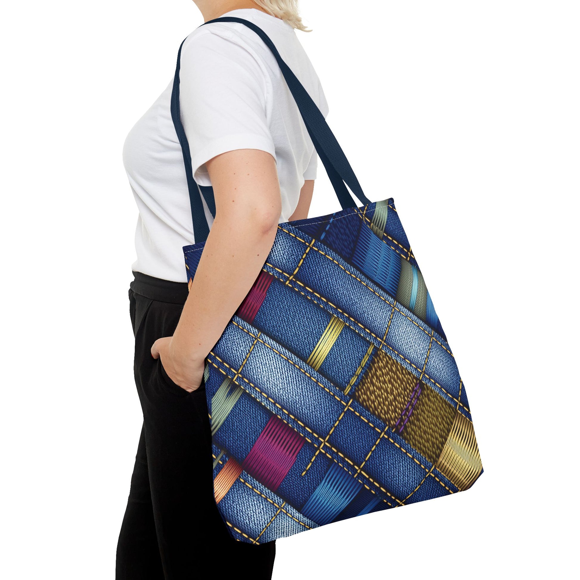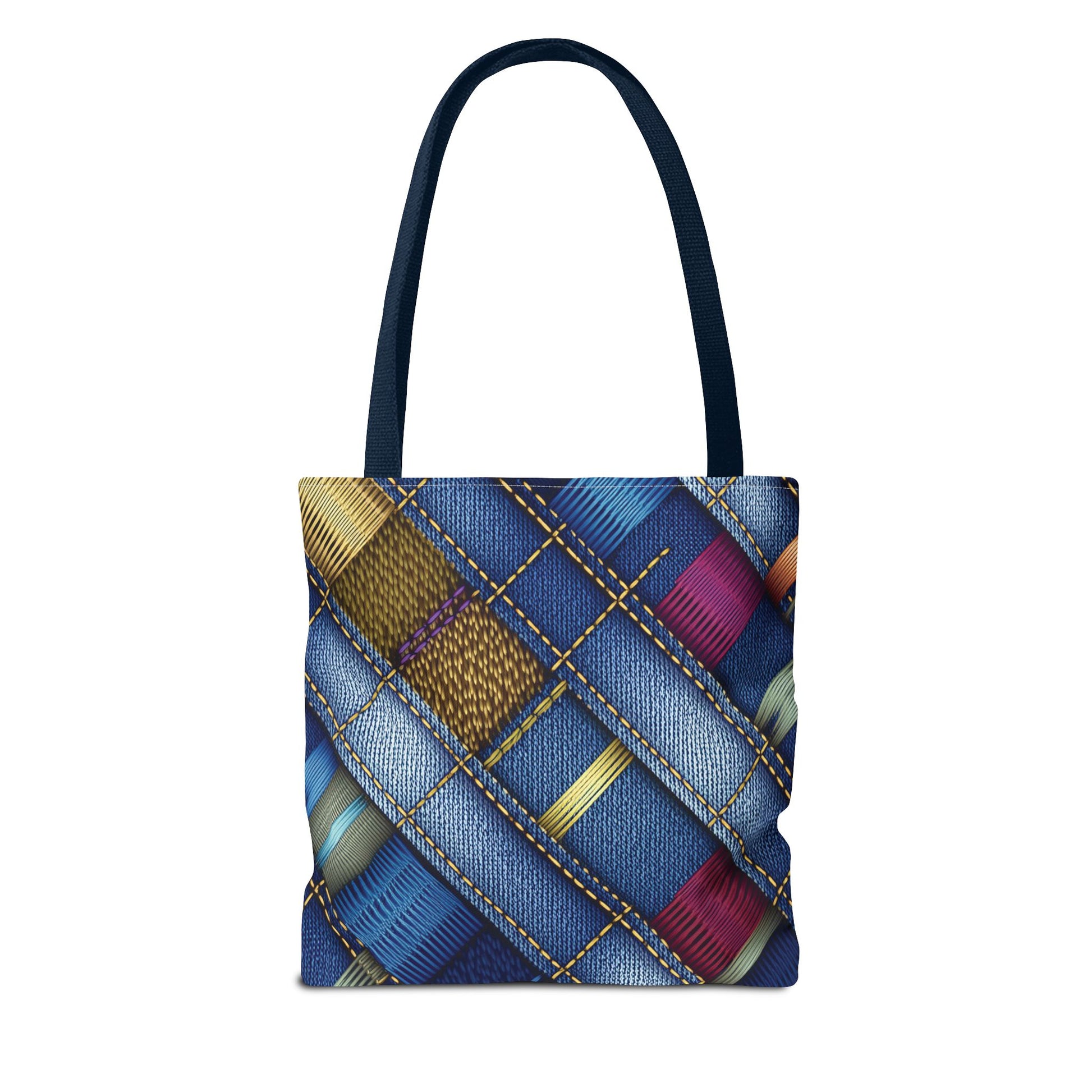 Denim Print Canvas Tote Bag – Elegant Poly Shoulder Bag - Enhance everyday functionality with timeless style in our Denim Print Canvas Tote Bag. Designed for versatility, this custom-printed tote is available in three convenient sizes and offers multiple handle color options to perfectly complement your look. Crafted from premium spun polyester, it delivers exceptional durability with double-stitched seams, sturdy cotton webbing straps, and a non-woven laminate interior.