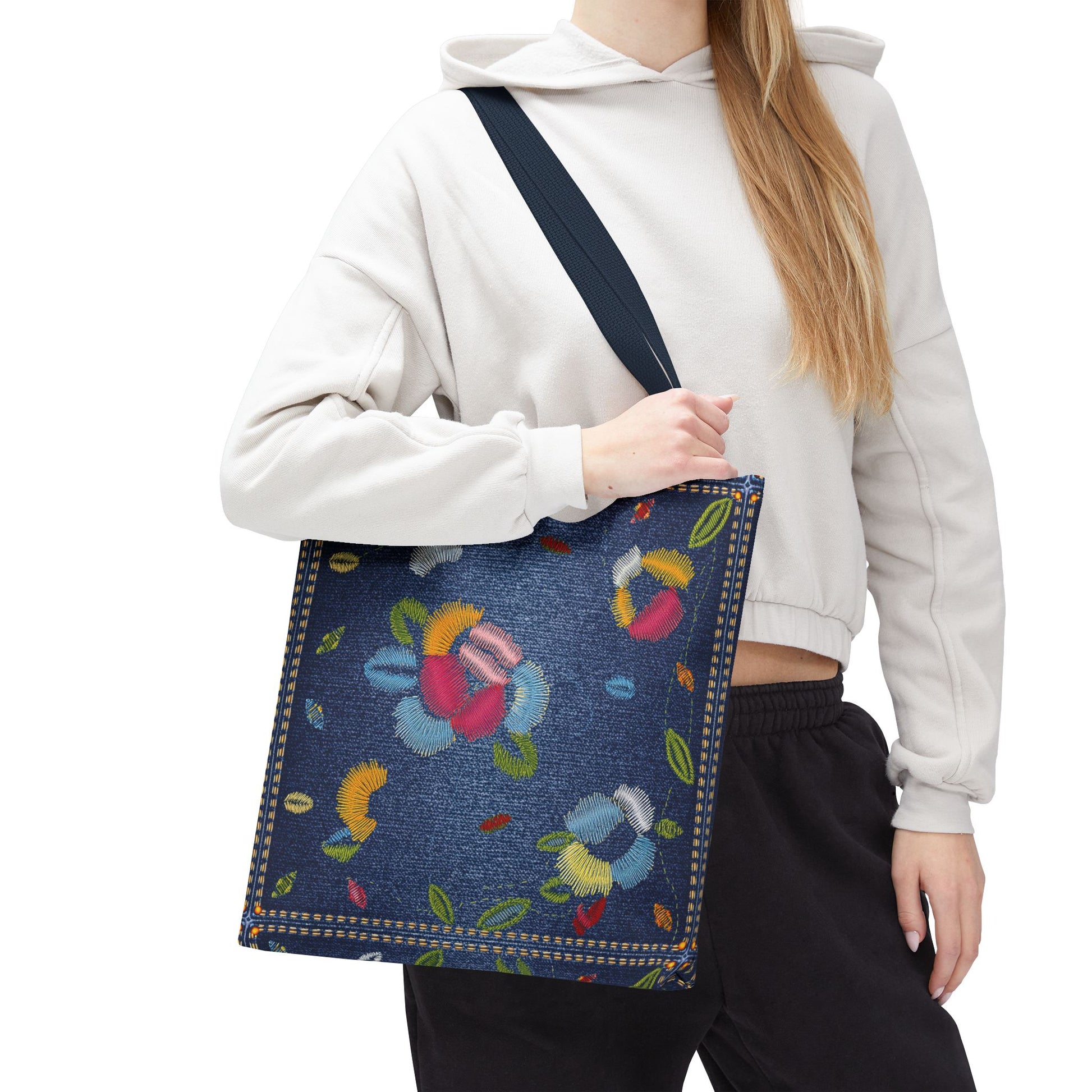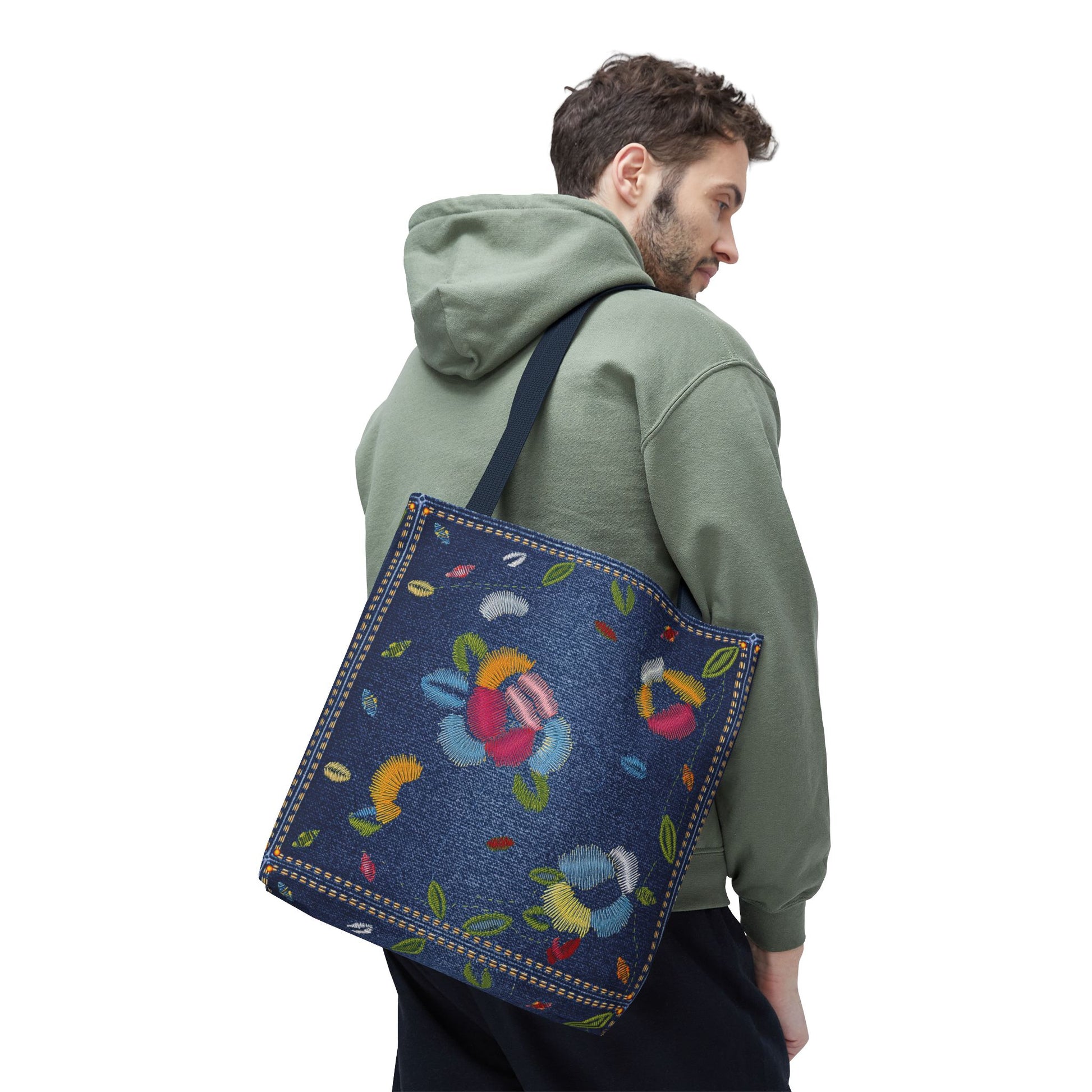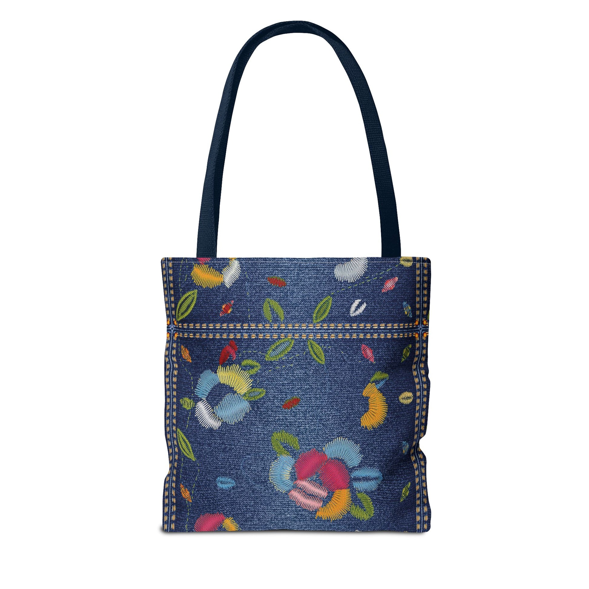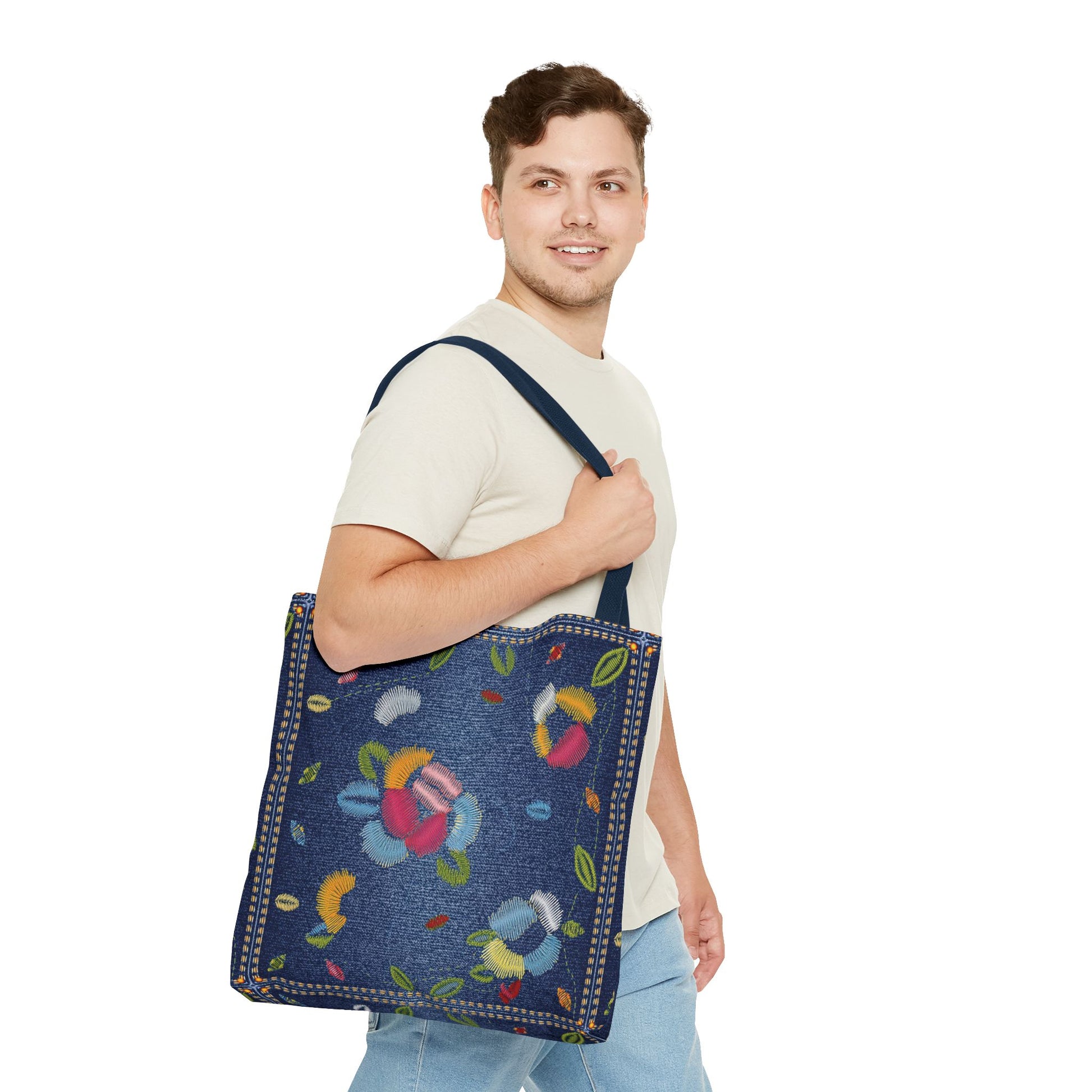 Denim Print Canvas Tote Bag – Elegant Poly Shoulder Bag - Enhance everyday functionality with timeless style in our Denim Print Canvas Tote Bag. Designed for versatility, this custom-printed tote is available in three convenient sizes and offers multiple handle color options to perfectly complement your look. Crafted from premium spun polyester, it delivers exceptional durability with double-stitched seams, sturdy cotton webbing straps, and a non-woven laminate interior.