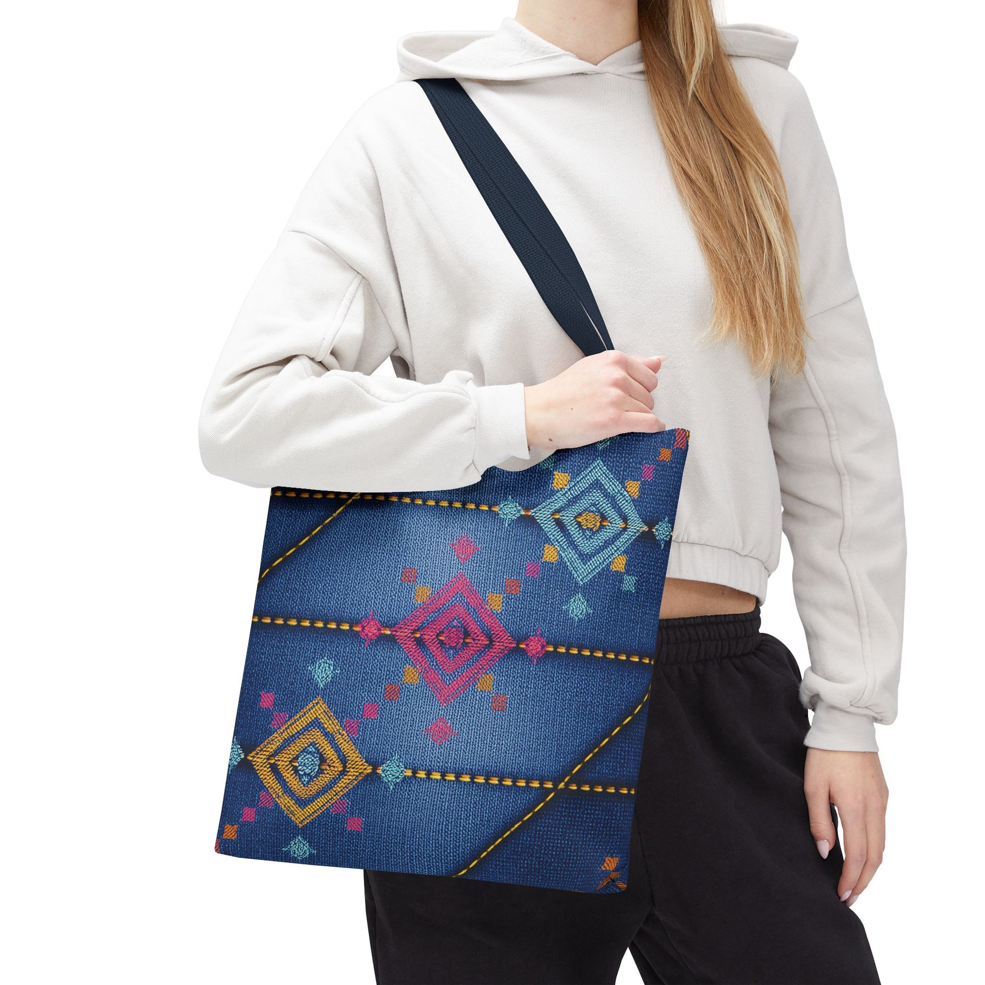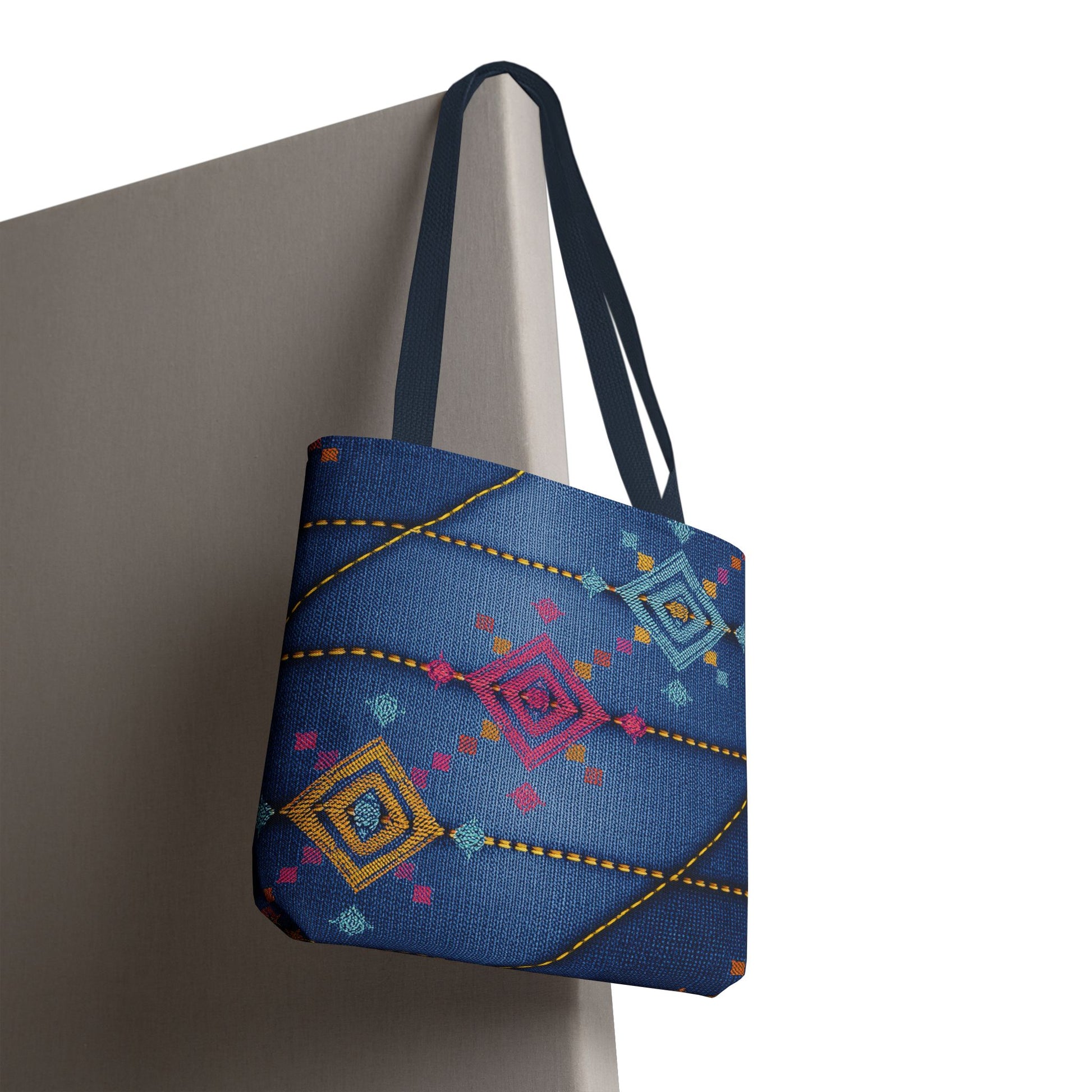 Denim Print Canvas Tote Bag – Elegant Poly Shoulder Bag - Enhance everyday functionality with timeless style in our Denim Print Canvas Tote Bag. Designed for versatility, this custom-printed tote is available in three convenient sizes and offers multiple handle color options to perfectly complement your look. Crafted from premium spun polyester, it delivers exceptional durability with double-stitched seams, sturdy cotton webbing straps, and a non-woven laminate interior.