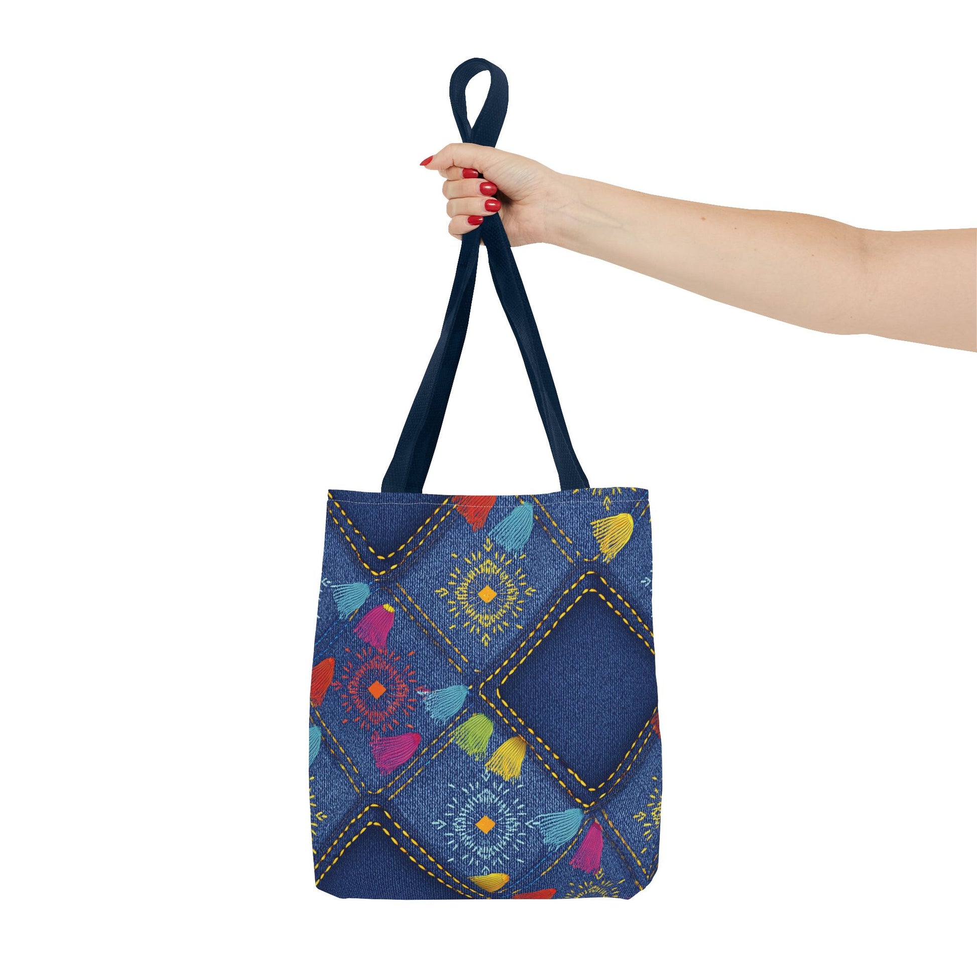 Denim Print Canvas Tote Bag – Elegant Poly Shoulder Bag - Enhance everyday functionality with timeless style in our Denim Print Canvas Tote Bag. Designed for versatility, this custom-printed tote is available in three convenient sizes and offers multiple handle color options to perfectly complement your look. Crafted from premium spun polyester, it delivers exceptional durability with double-stitched seams, sturdy cotton webbing straps, and a non-woven laminate interior.