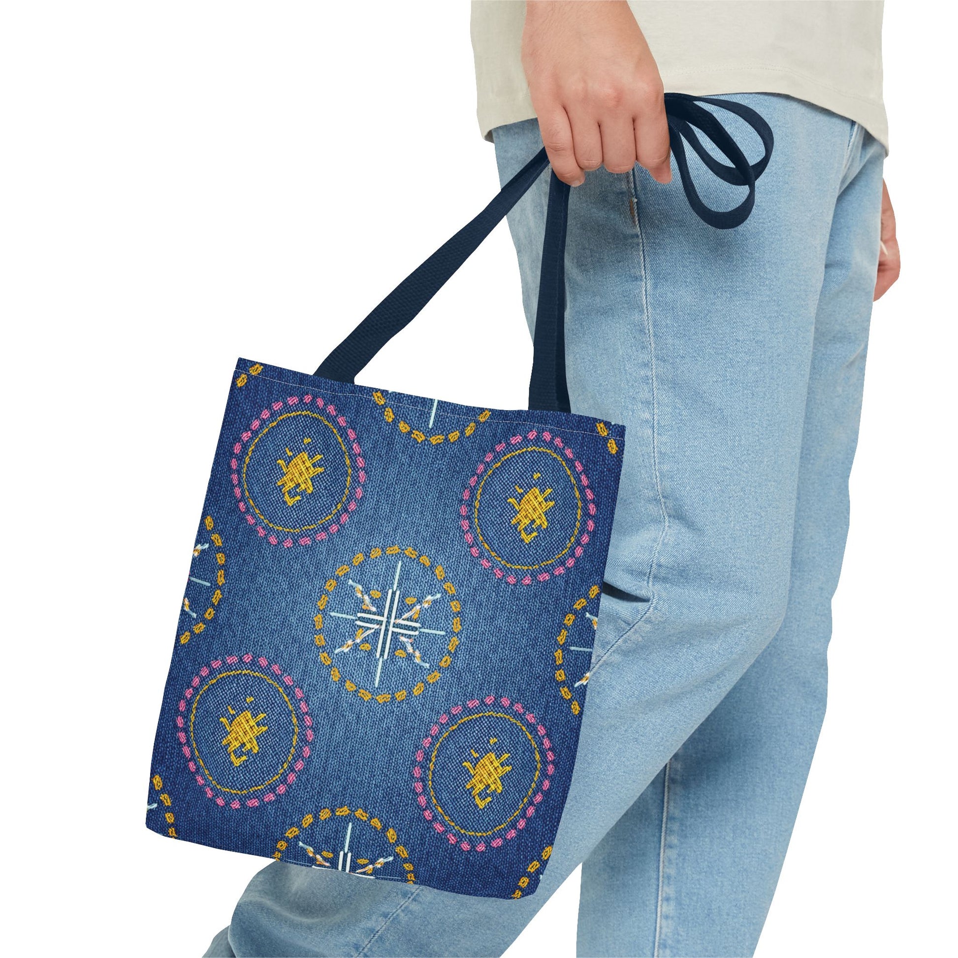 Denim Print Canvas Tote Bag – Elegant Poly Shoulder Bag - Enhance everyday functionality with timeless style in our Denim Print Canvas Tote Bag. Designed for versatility, this custom-printed tote is available in three convenient sizes and offers multiple handle color options to perfectly complement your look. Crafted from premium spun polyester, it delivers exceptional durability with double-stitched seams, sturdy cotton webbing straps, and a non-woven laminate interior.
