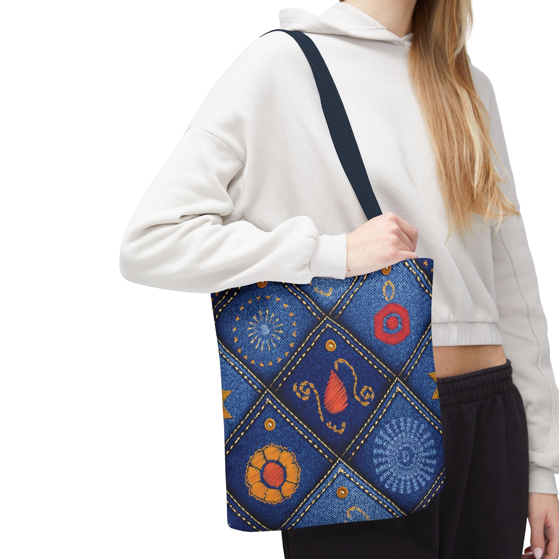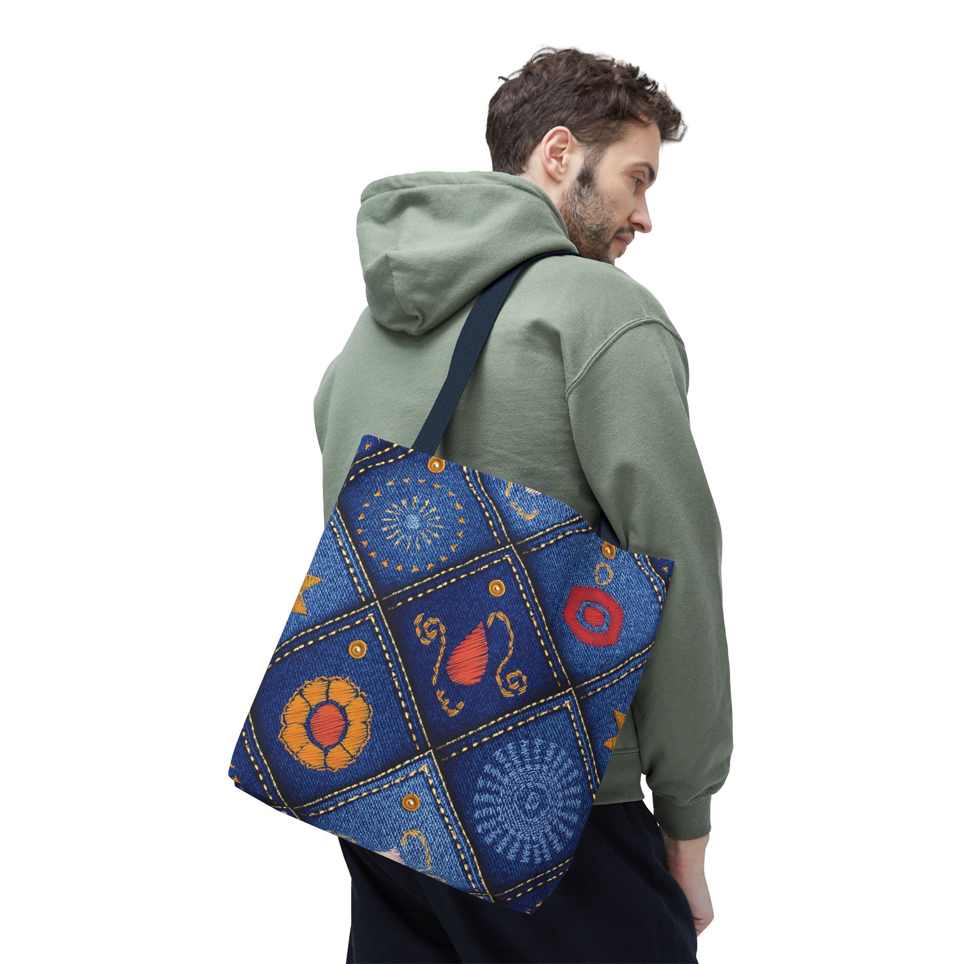 Denim Print Canvas Tote Bag – Elegant Poly Shoulder Bag - Enhance everyday functionality with timeless style in our Denim Print Canvas Tote Bag. Designed for versatility, this custom-printed tote is available in three convenient sizes and offers multiple handle color options to perfectly complement your look. Crafted from premium spun polyester, it delivers exceptional durability with double-stitched seams, sturdy cotton webbing straps, and a non-woven laminate interior.
